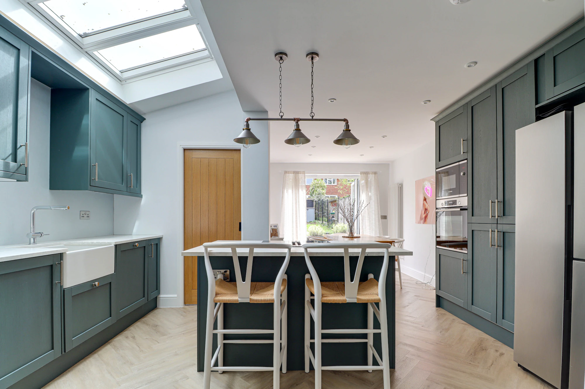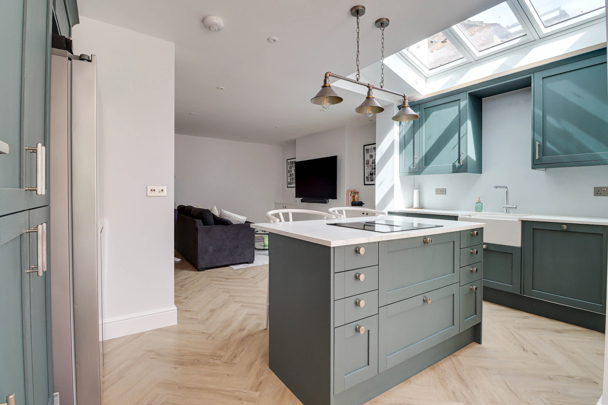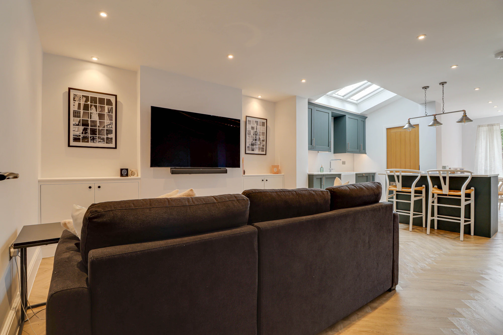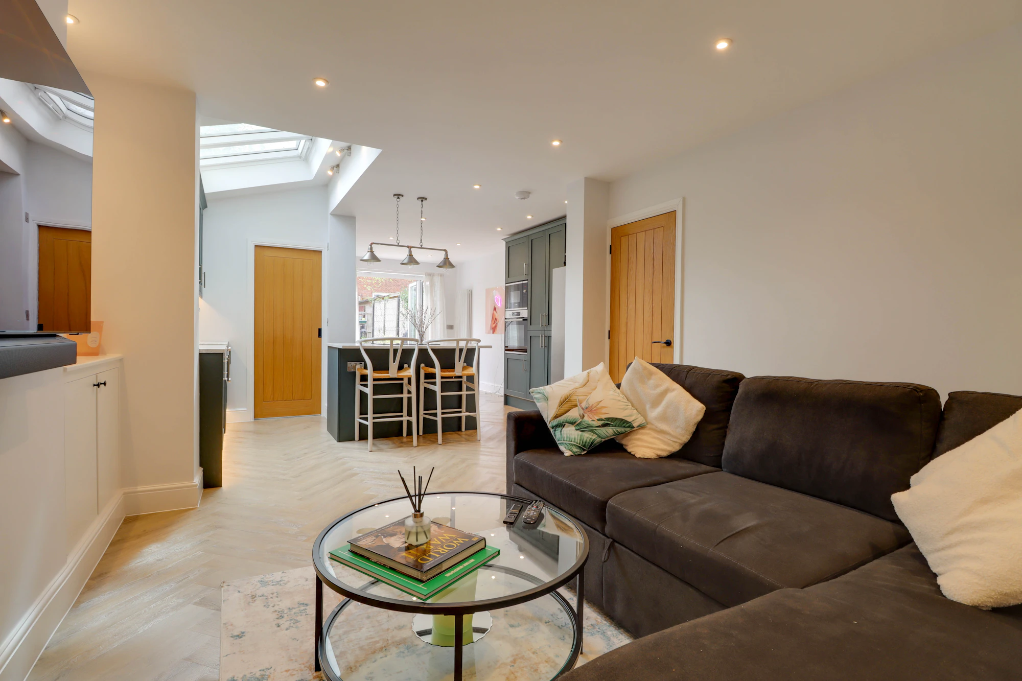 Upon entering, you are welcomed by a bright and airy hallway that leads to a spacious front-facing lounge. To the rear is an impressive open-plan living space, combining a second lounge, kitchen, and dining area which is flooded with natural light from overhead skylights.
