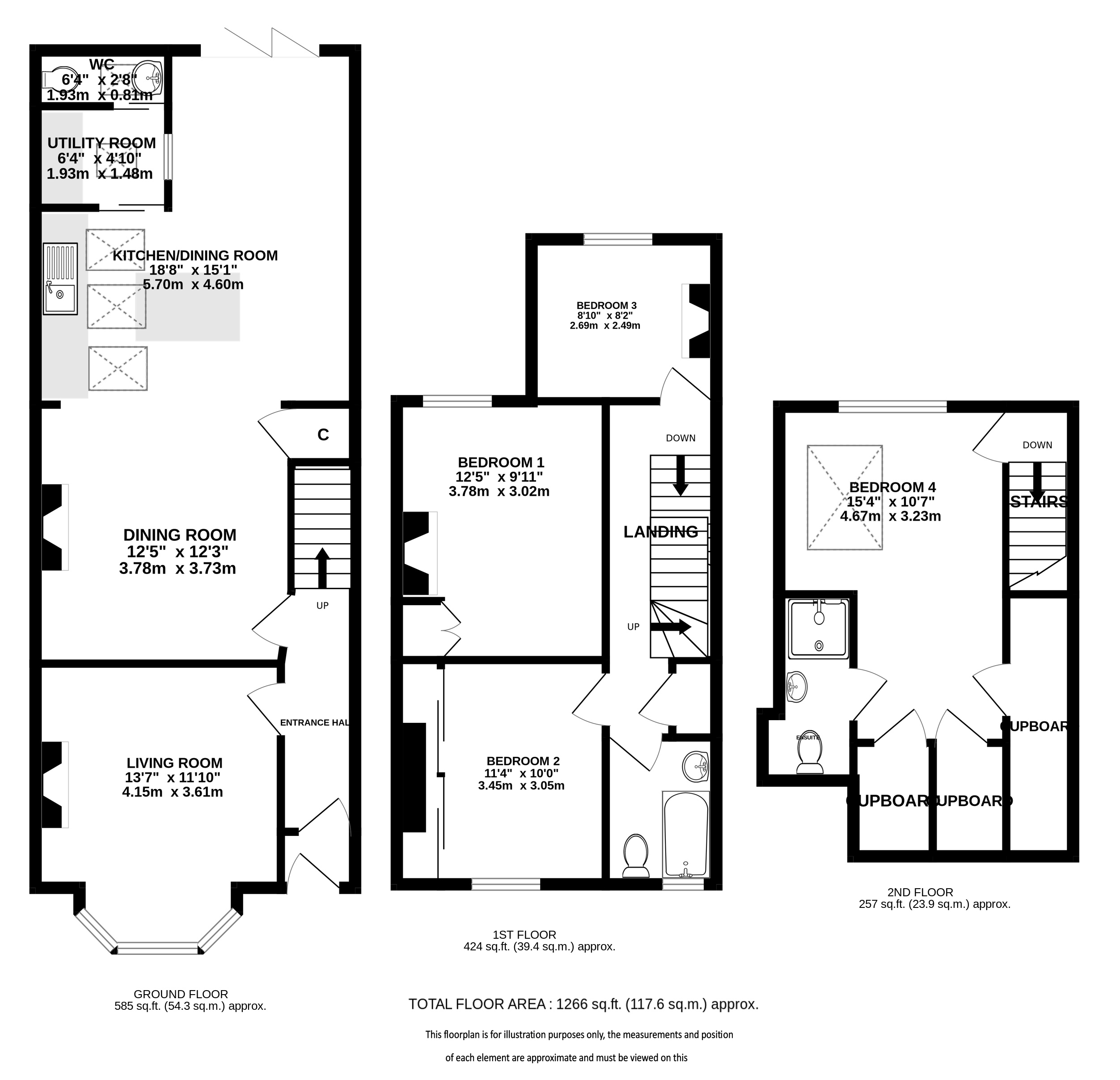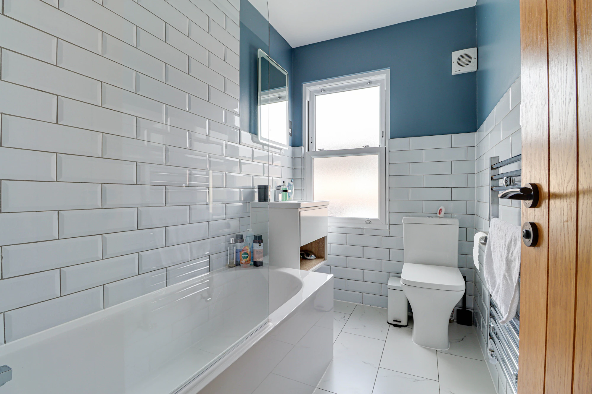 The first floor comprises three well-proportioned bedrooms, all offering excellent storage, along with a tiled family bathroom fitted with a bath and overhead shower.