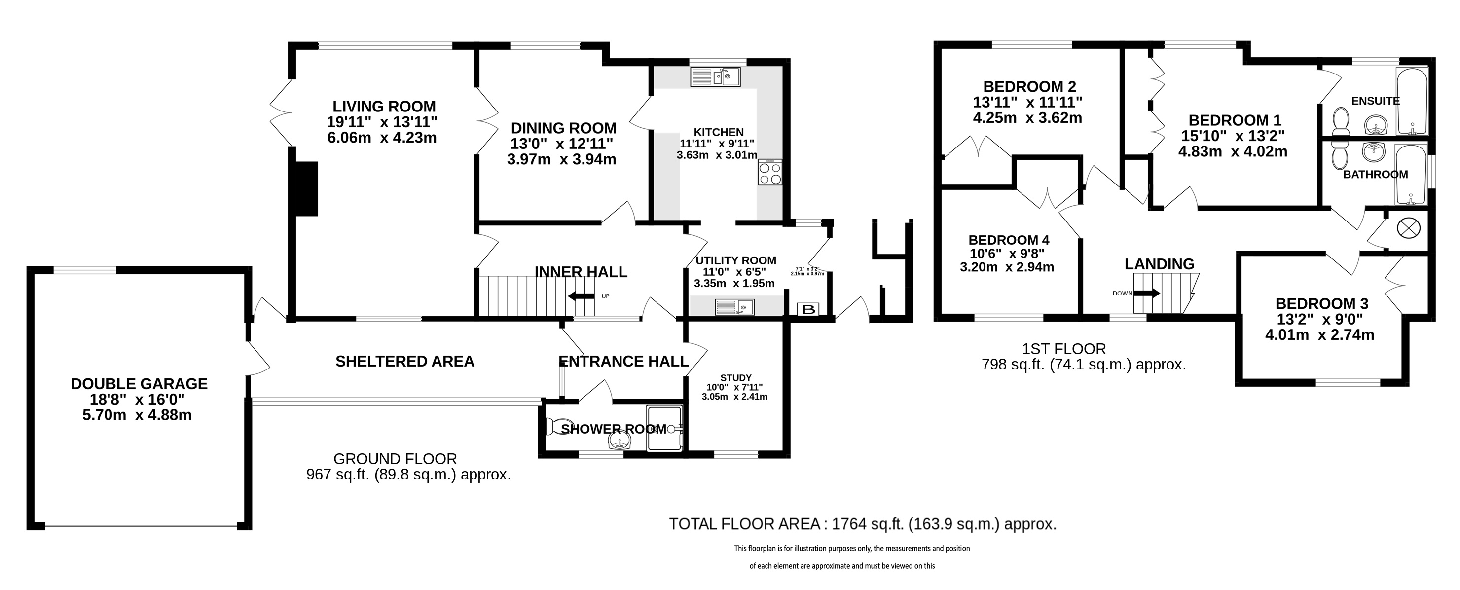 The ground floor features a bright and airy lounge with a charming stone fireplace, overlooking the beautifully maintained rear garden, with doors opening directly onto it. The lounge flows seamlessly into a generous dining room, which in turn connects to a well-appointed kitchen fitted with a range of appliances. A separate utility room provides additional convenience, complete with washer, dryer, and side access to the garden. There is also a useful study and a downstairs shower room.