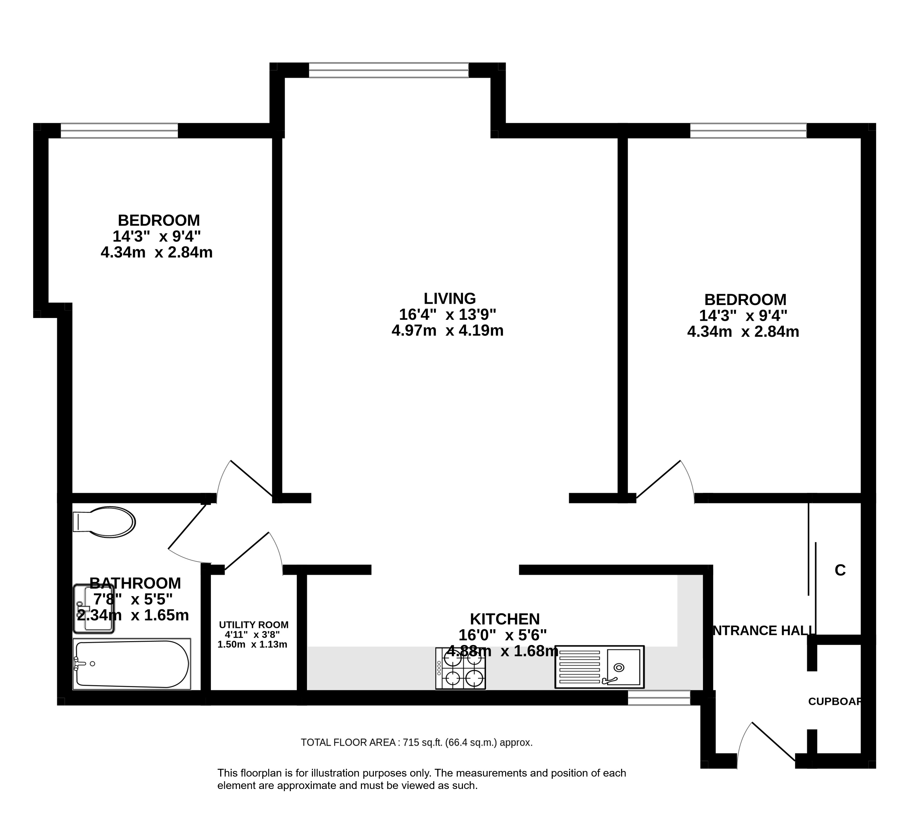 There are two double bedrooms on either side of the large living room facing out to the front of the building. The bathroom is beautifully finished and benefits from a bath with overhead shower.
