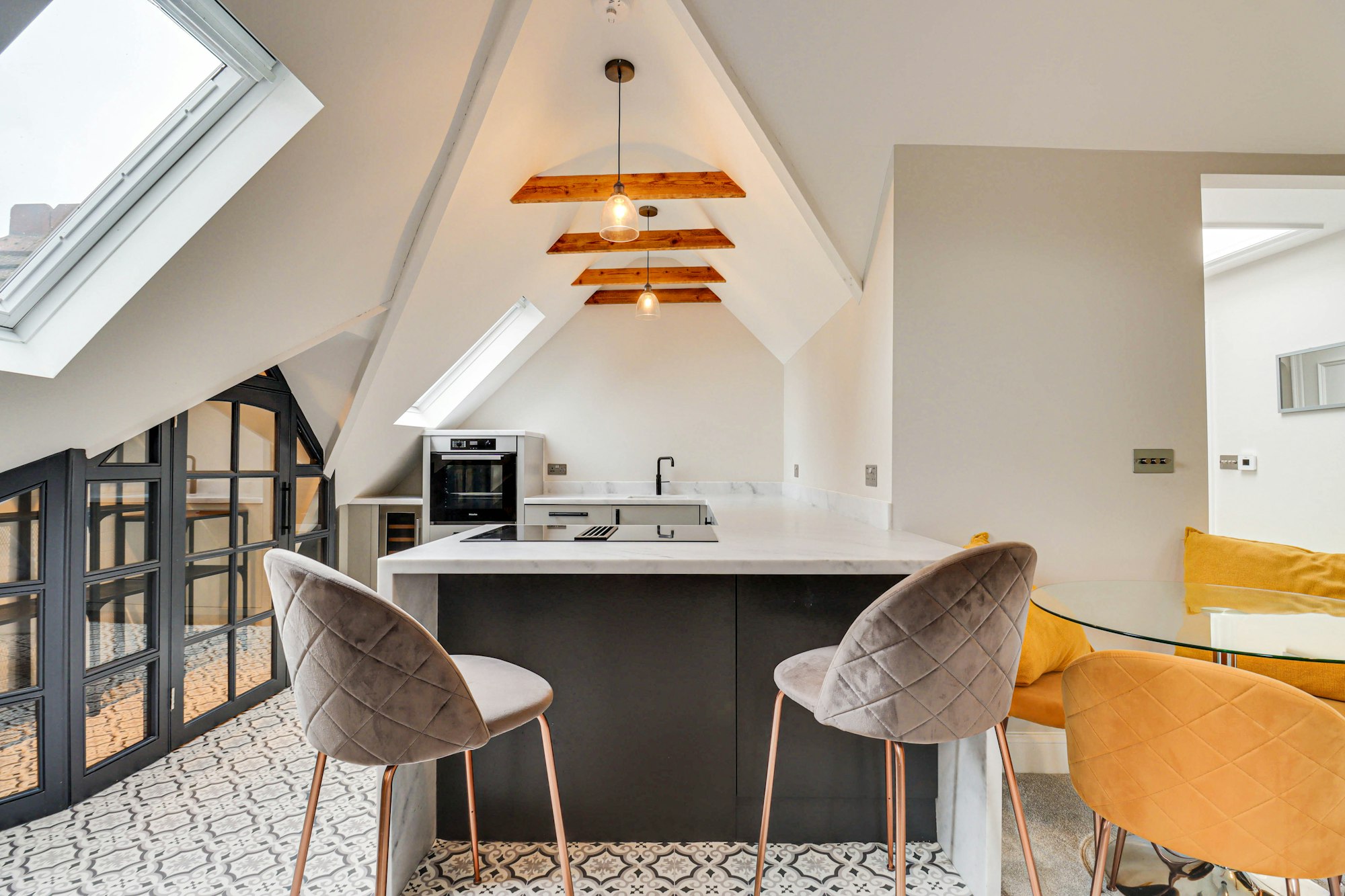 Inside, the apartment opens into a generous entrance hall. The main living space has been thoughtfully reconfigured to create an open-plan kitchen, dining, and living area. The kitchen features a high-specification finish with Miele appliances, a bespoke pantry, and ample space for dining.