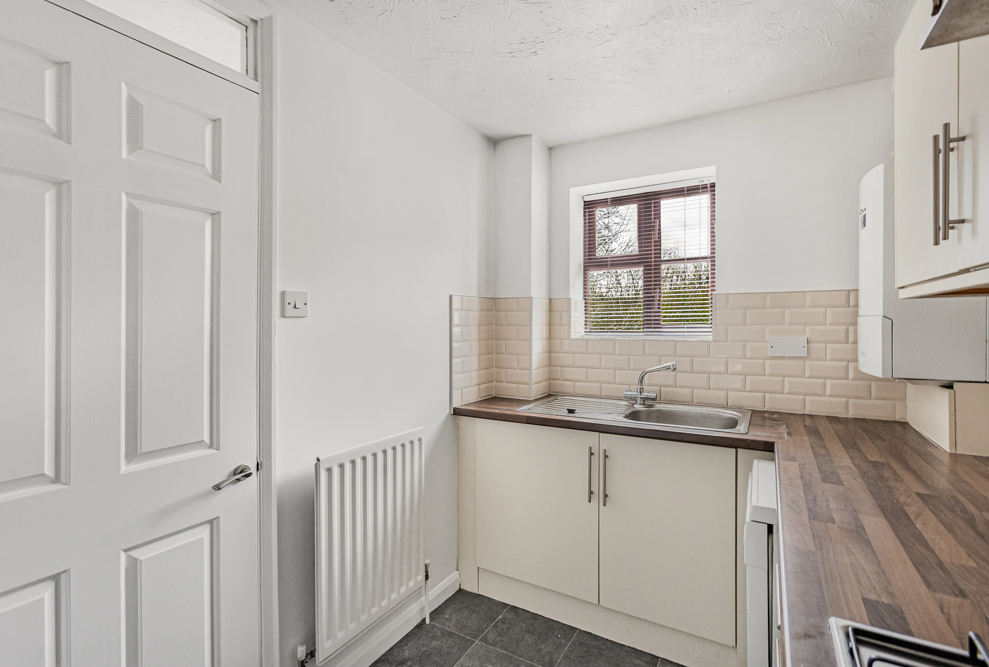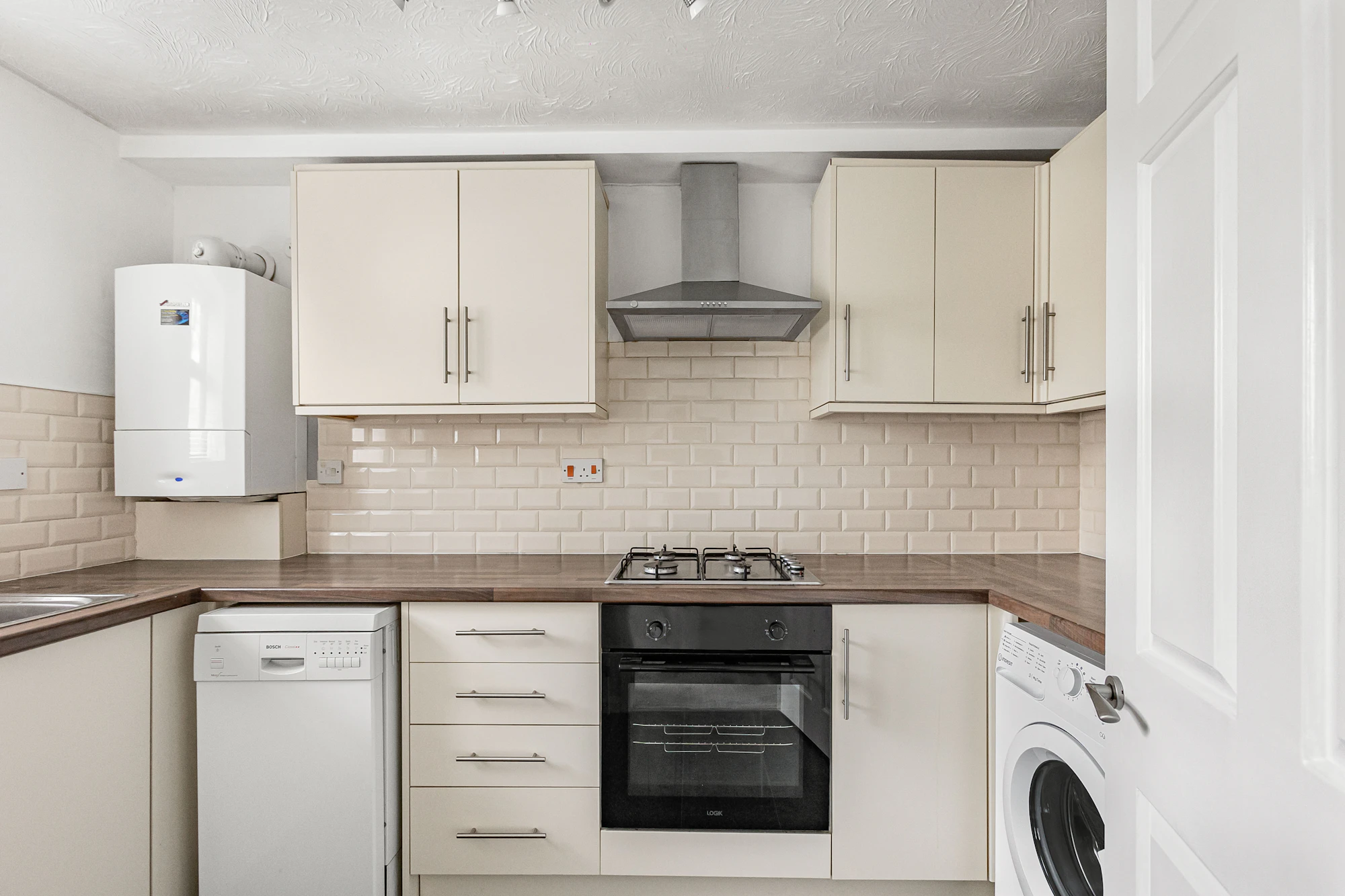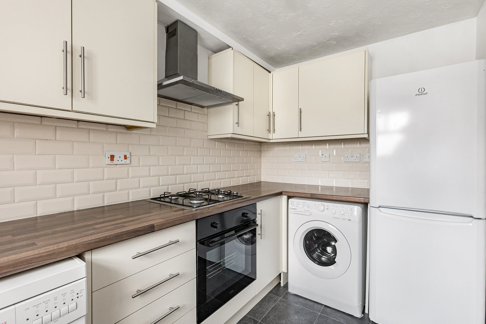 The main reception room is well proportioned, providing a comfortable living space, while the kitchen is fitted with a good range of appliances including a slimline dishwasher, gas hob, washing machine, and fridge freezer.