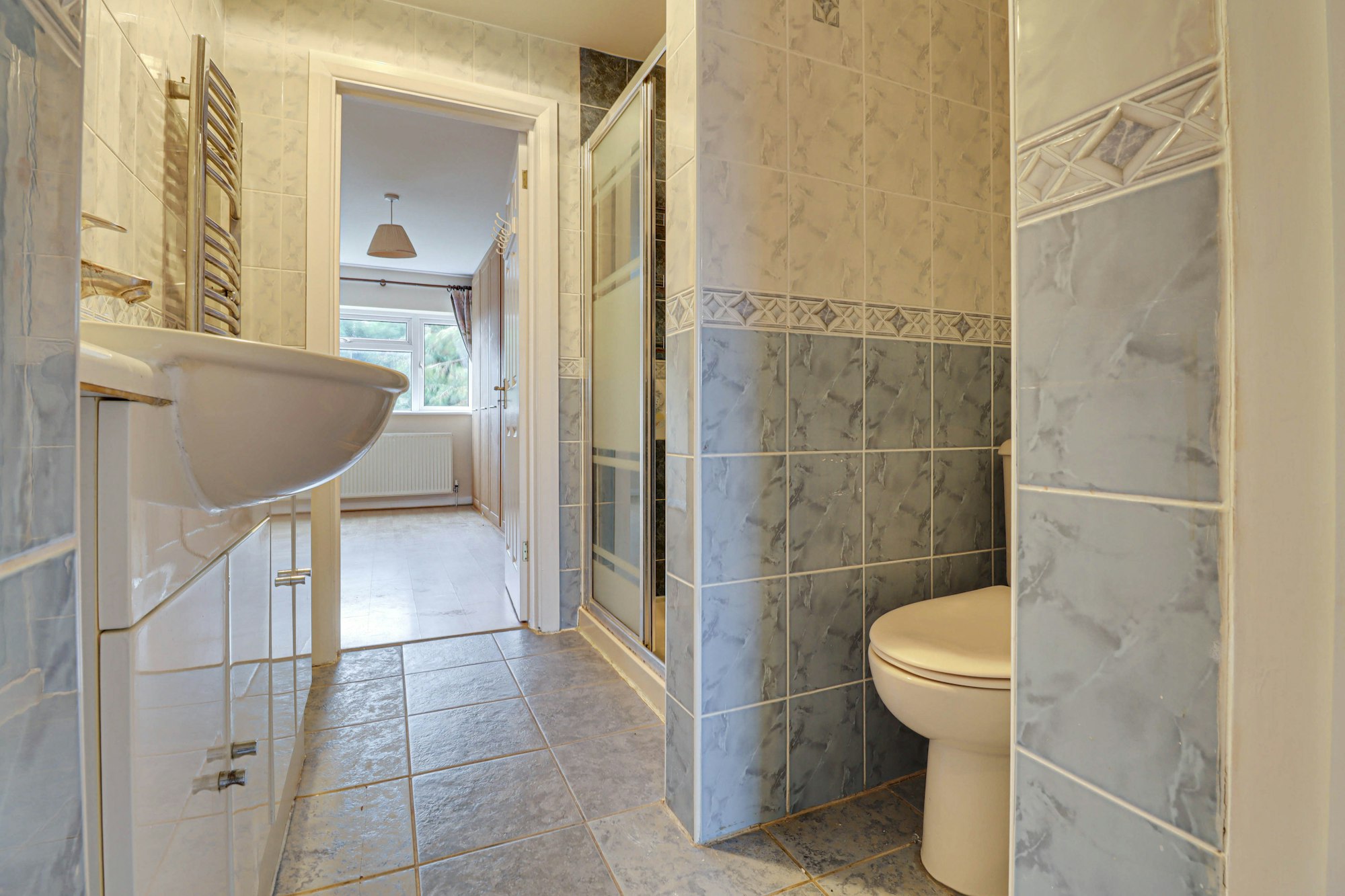 Upstairs, there are five bedrooms, two spacious double bedrooms benefit from fitted wardrobes, while the principal bedroom shares access to a Jack & Jill shower room. Three further bedrooms provide flexible accommodation. The modern family bathroom is finished with porcelain tiling and includes a shower over the bath.