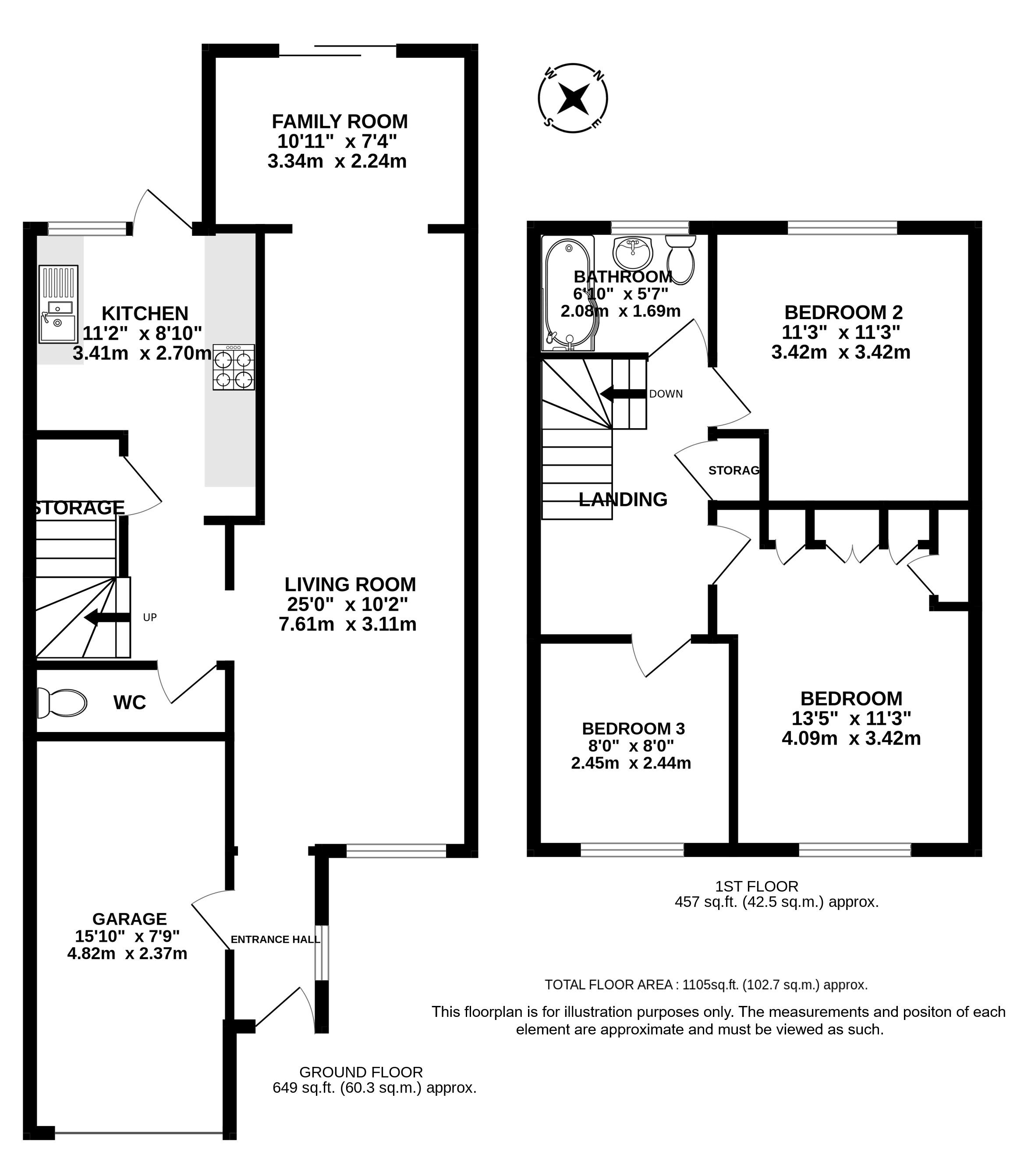 Arranged over two floors, on the first are three good sized bedrooms, the Principal benefiting from fitted wardrobe units, and re-fitted family bathroom with power shower.