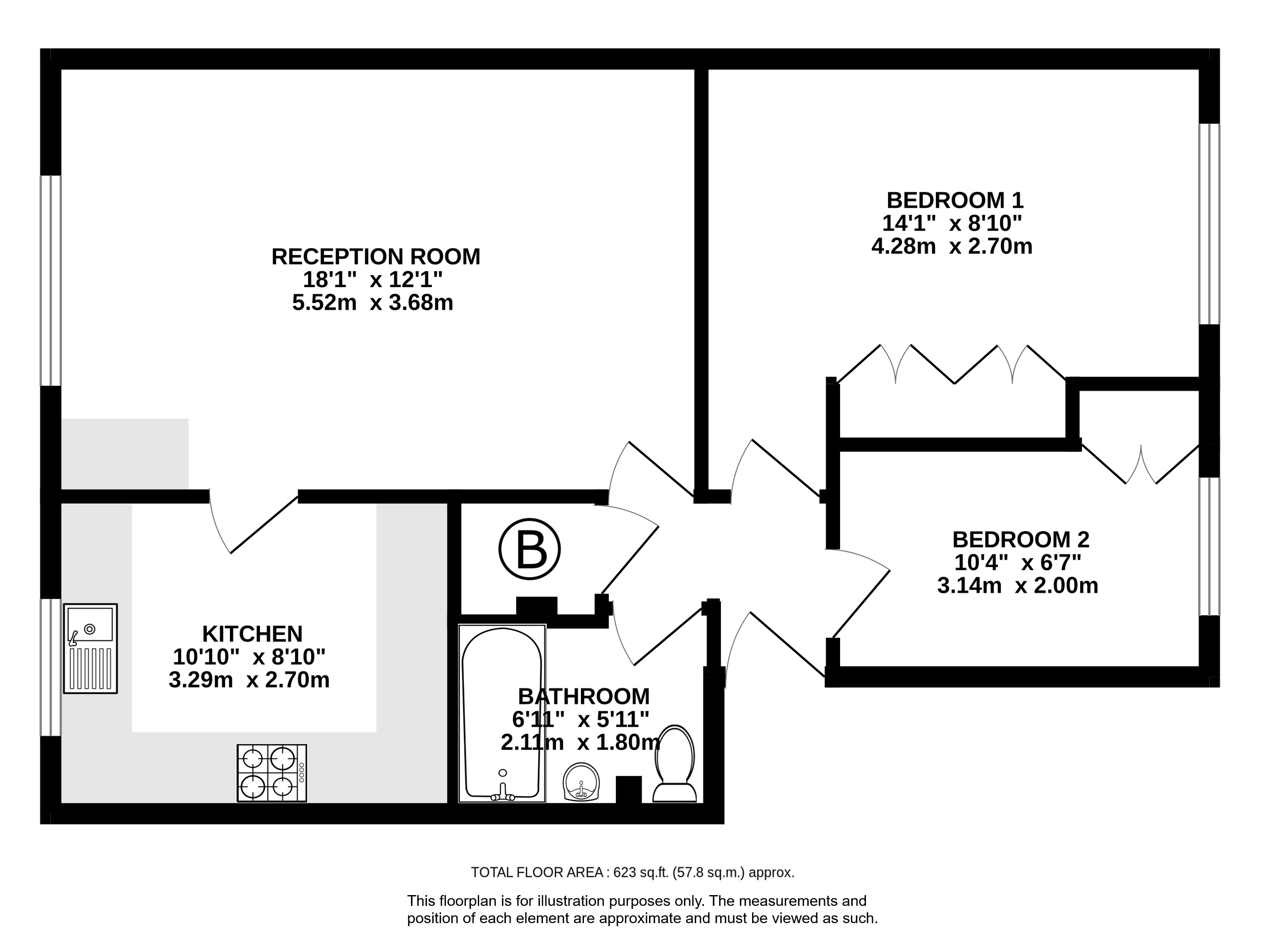There are two generously sized bedrooms, both with built-in wardrobes, and a bathroom fitted with a bath and overhead shower.