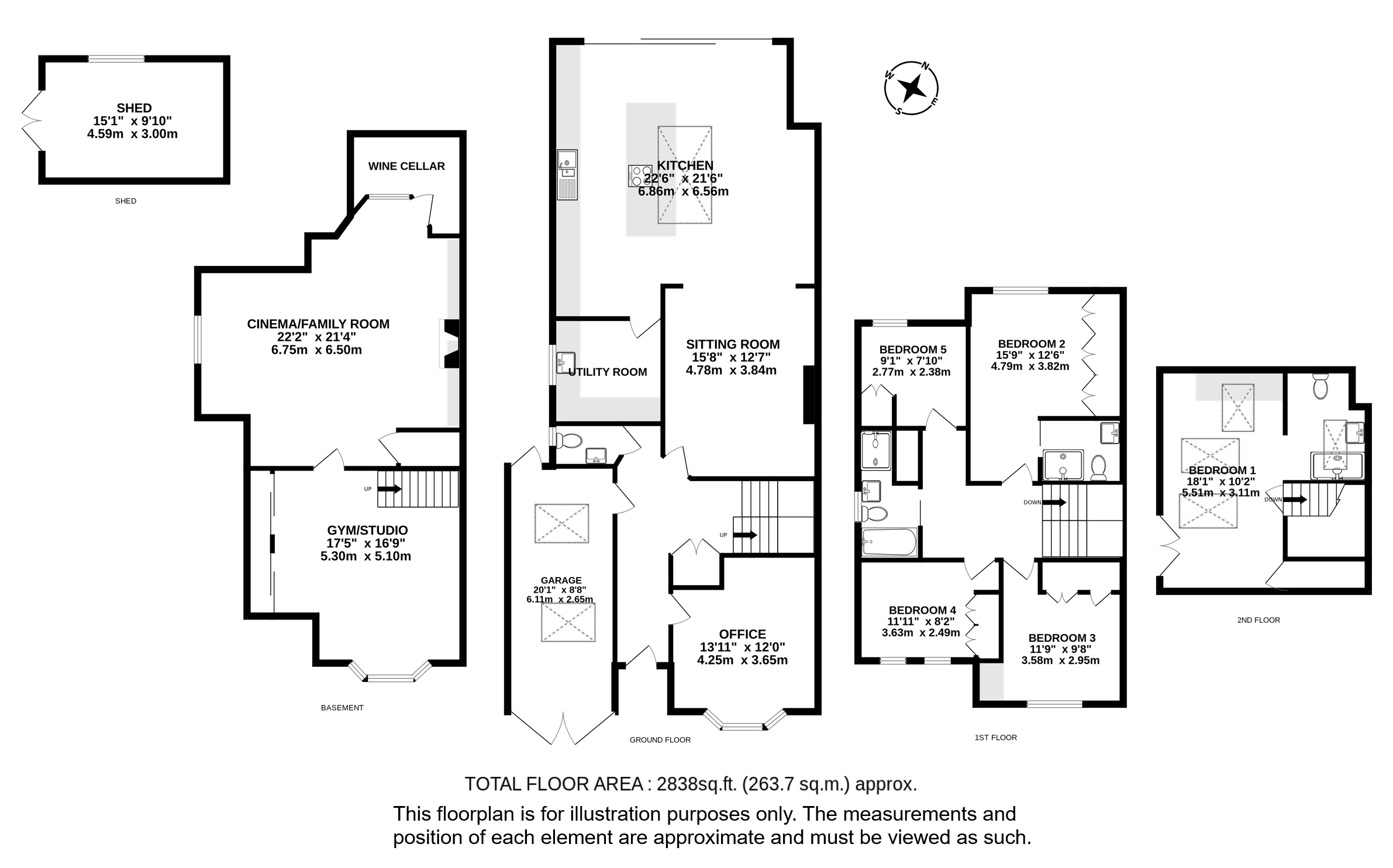 Outside, the secluded gardens comprise of a large entertaining patio and an expanse of lawn that dog-legs at the rear to offer an additional, unexpected area of garden, large garden storage unit with light and power and additional paved sun-terrace.