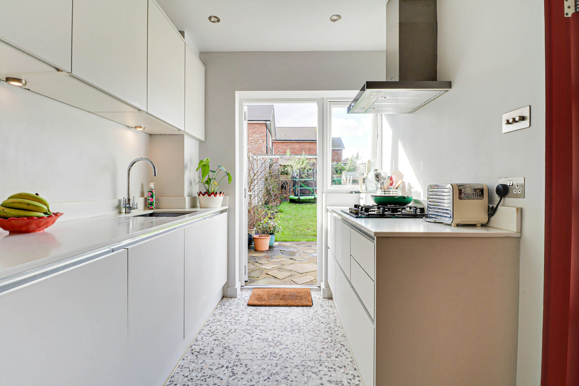 Externally, the landscaped rear garden has been carefully designed with a combination of patio and lawn, providing a private and low-maintenance space ideal for families and summer gatherings. The property also benefits from a garage en bloc, offering valuable additional storage.