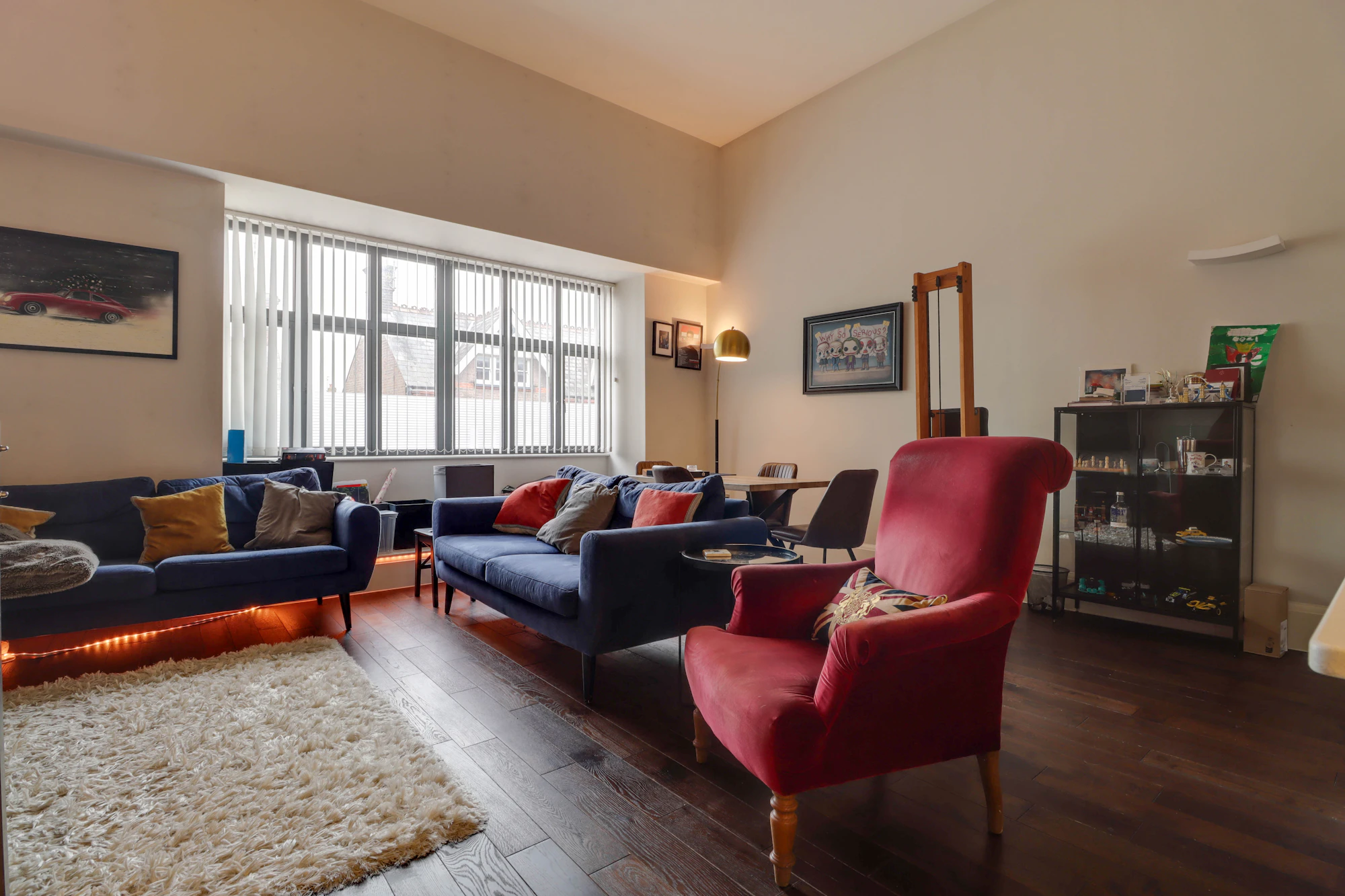 Located on the first floor, the apartment boasts a large entrance hall with ample storage cupboards, leading to a stunning lounge with high ceilings. This impressive space opens onto the kitchen and features stairs rising to a mezzanine level, creating an authentic ‘New York’ loft-style feel, along with an additional reception area.