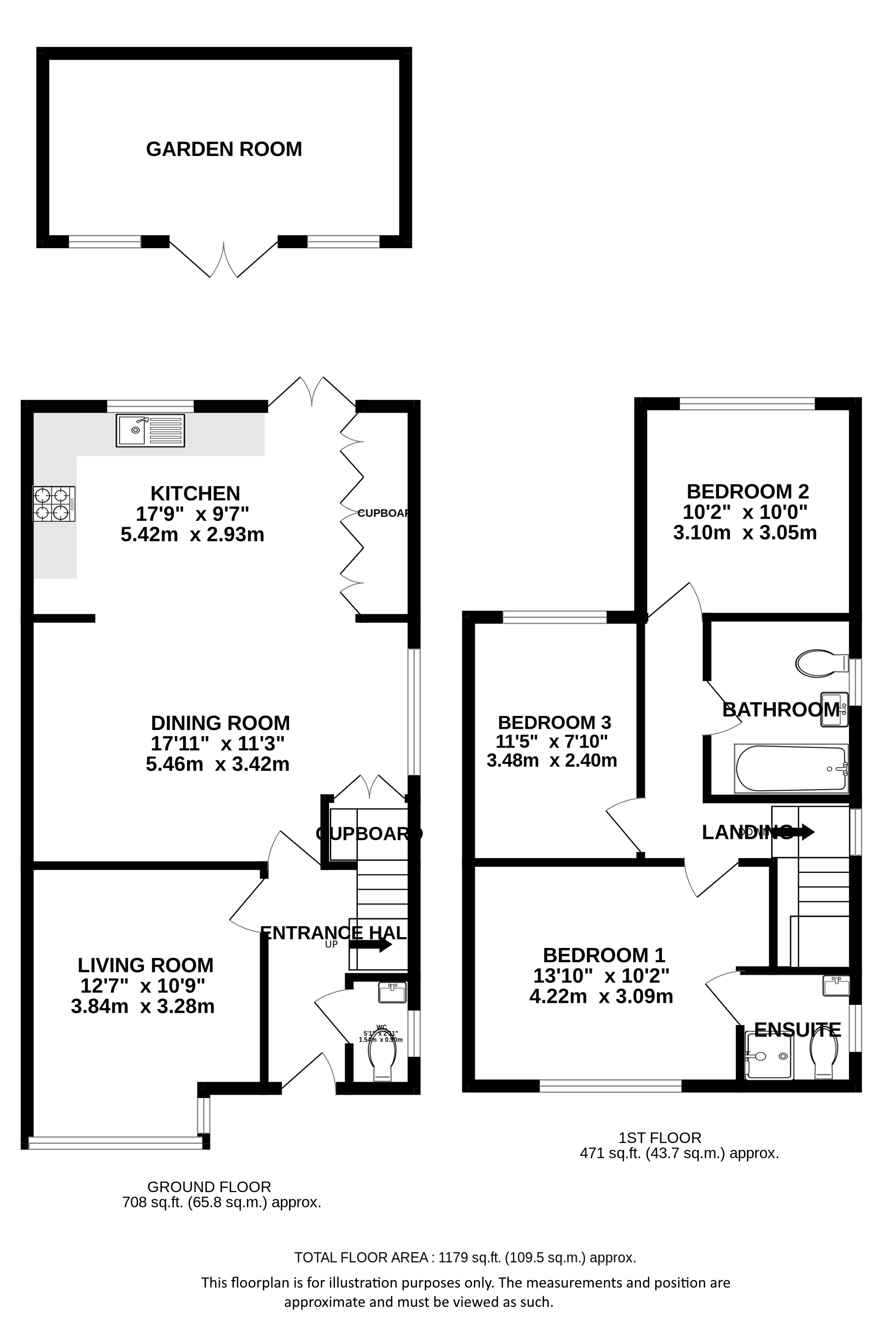 The first floor offers a spacious principal bedroom with a stylish en-suite shower room, alongside two further well-proportioned double bedrooms and a modern family bathroom, all arranged around a central landing.