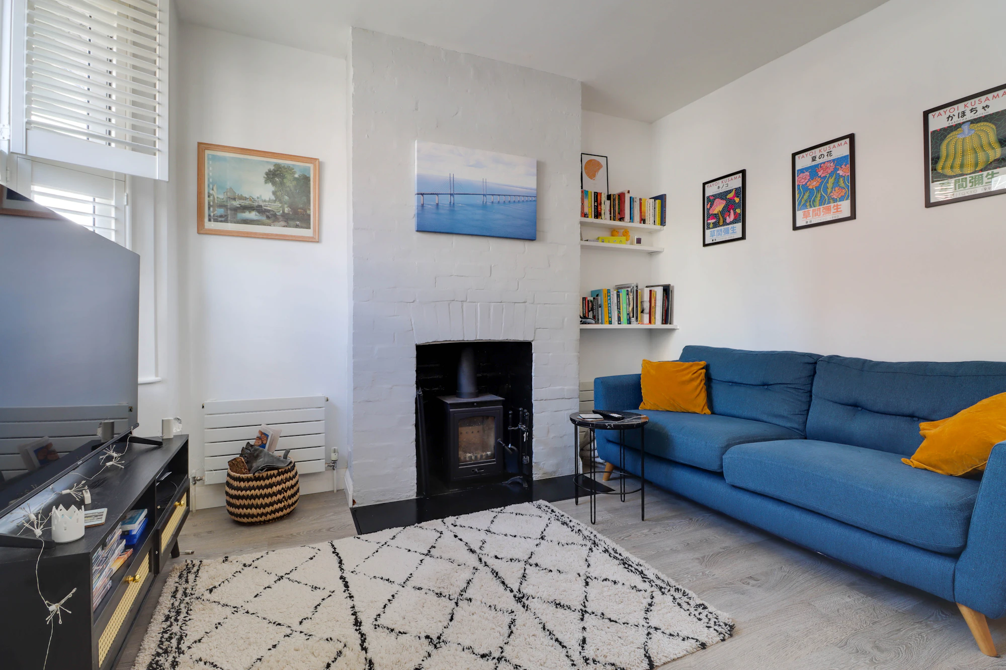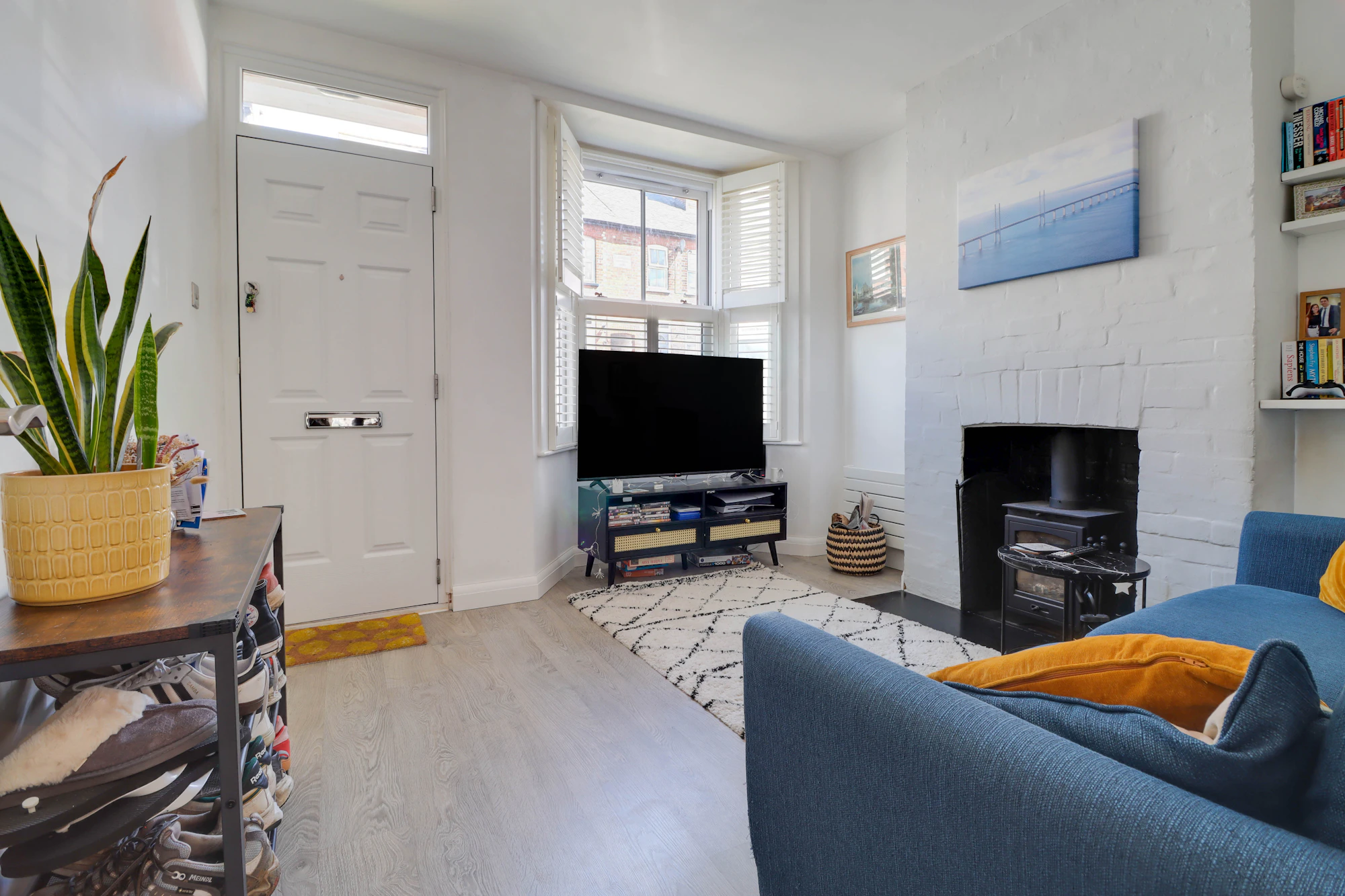 Internally, the home has been thoughtfully updated and extended to maximise both space and functionality, while carefully preserving its original character. The ground floor features a welcoming main reception room with a large bay window fitted with wooden shutters, alongside a recessed fireplace with a slate hearth and wood-burning stove. A second reception room provides a versatile dining or family space.