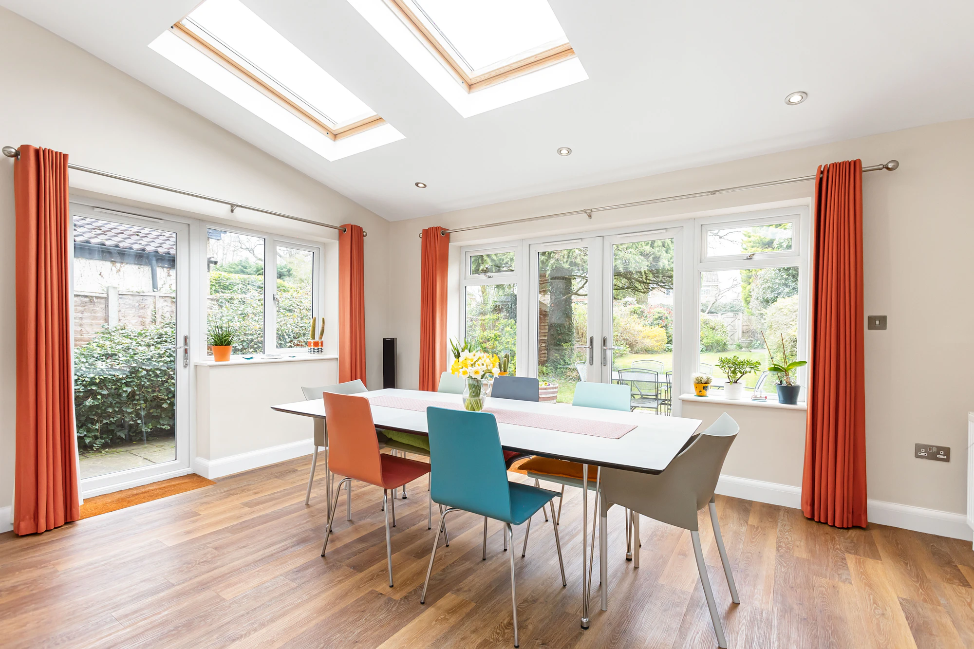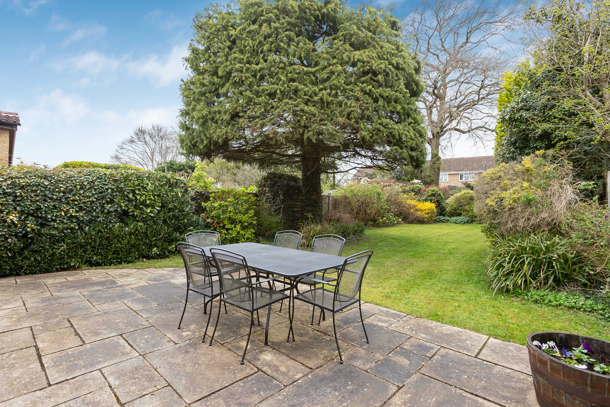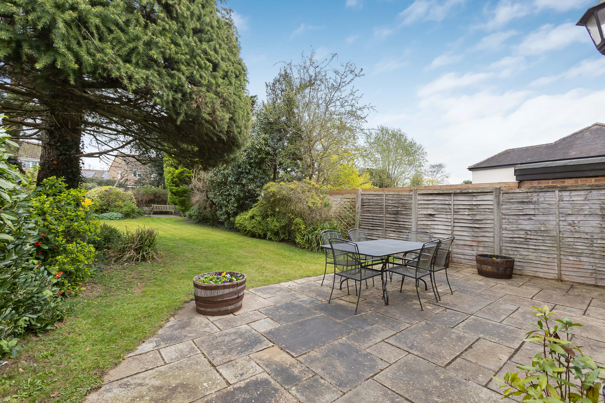 Outside, the glorious rear garden has a large paved entertaining patio with the remainder being laid mostly to lawn with surrounding well stocked flower and shrub borders and timber built garden storage shed.