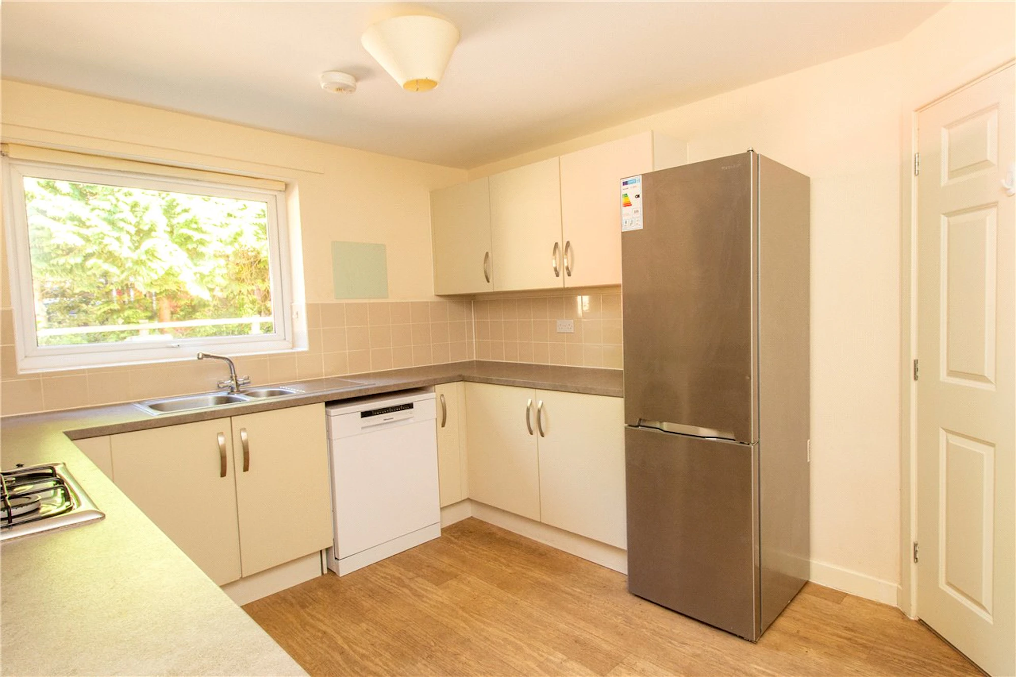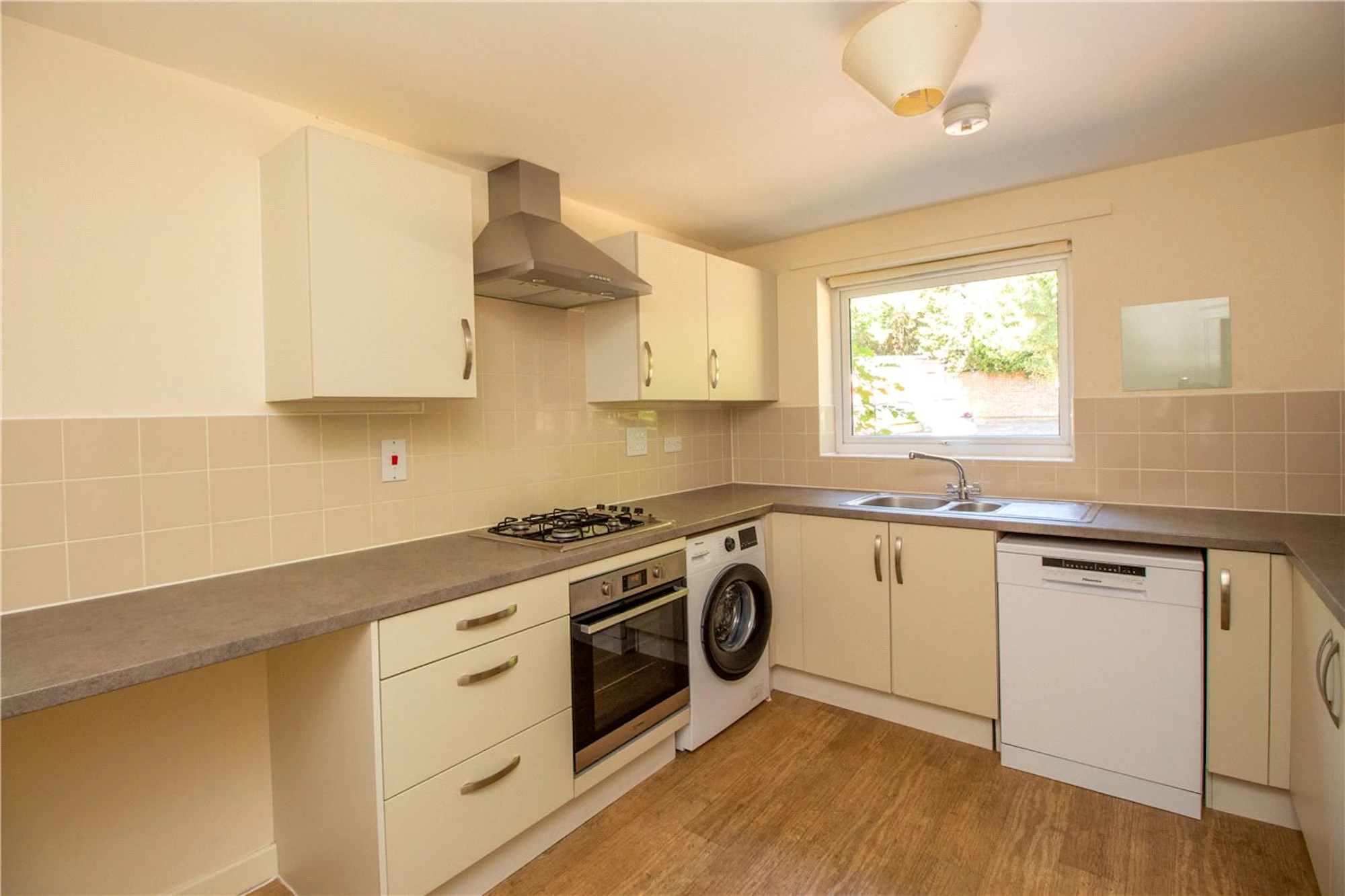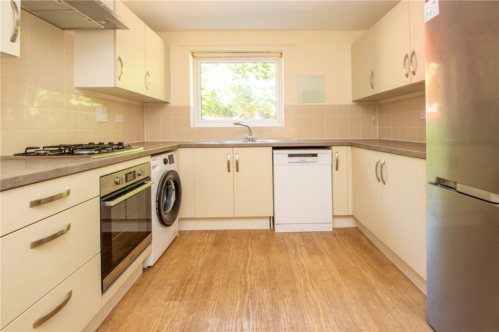 The fully fitted kitchen has an abundance of storage with fitted wall and base units housing appliances including a washer/dryer, dishwasher and fridge/freezer.