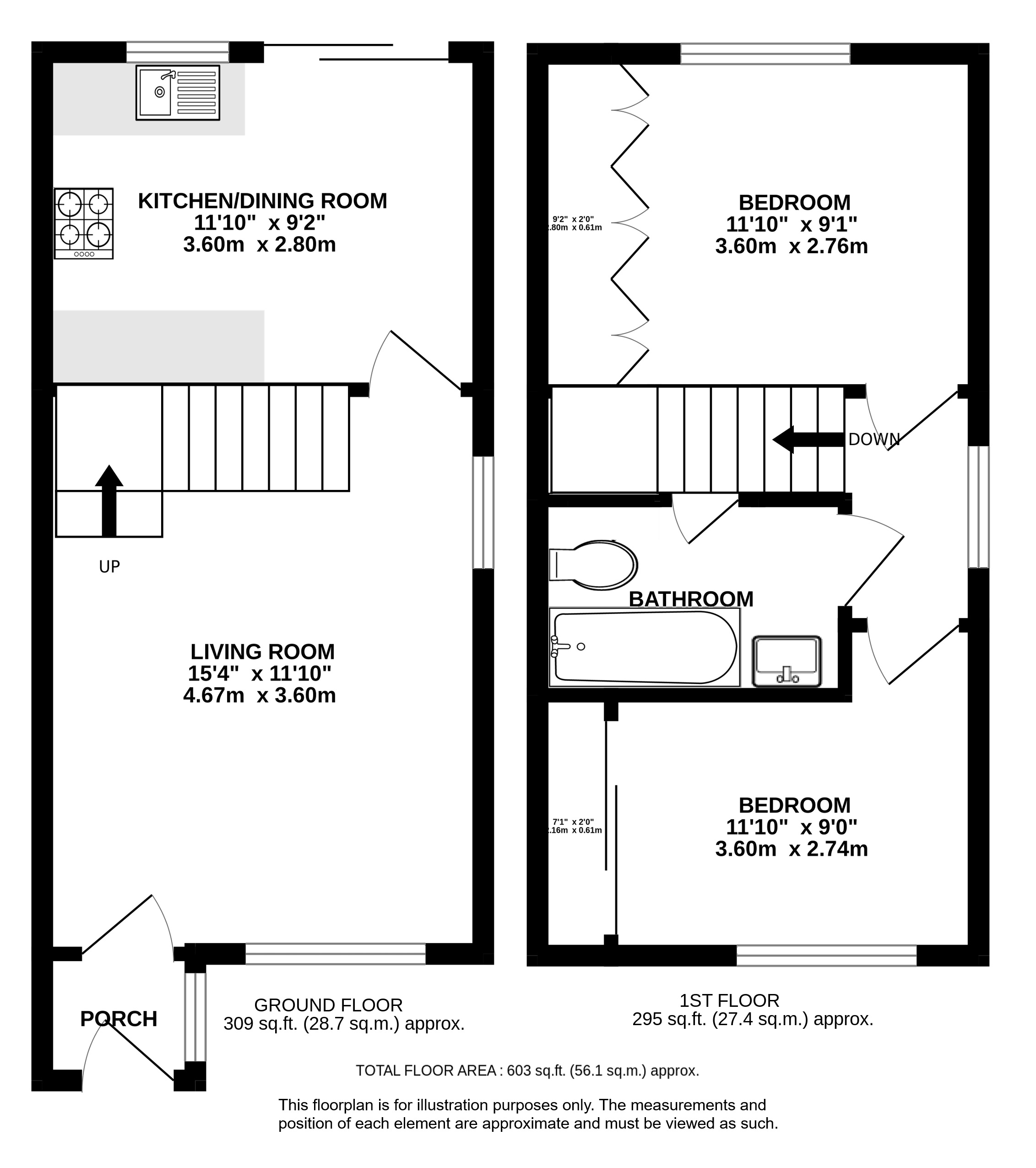 The first floor provides two well proportioned bedrooms, each offering comfort and flexibility. The principal bedroom features fitted storage, while the second bedroom can be adapted to suit a range of needs. Both are served by a family bathroom, adding to the convenience of the layout.