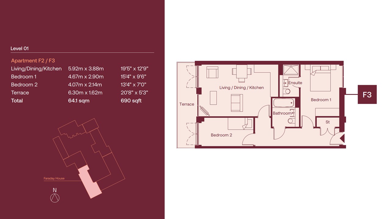 Apartment F3 is a two bedroom, two bathroom apartment with 690 sq ft of accommodation, terrace and allocated parking.