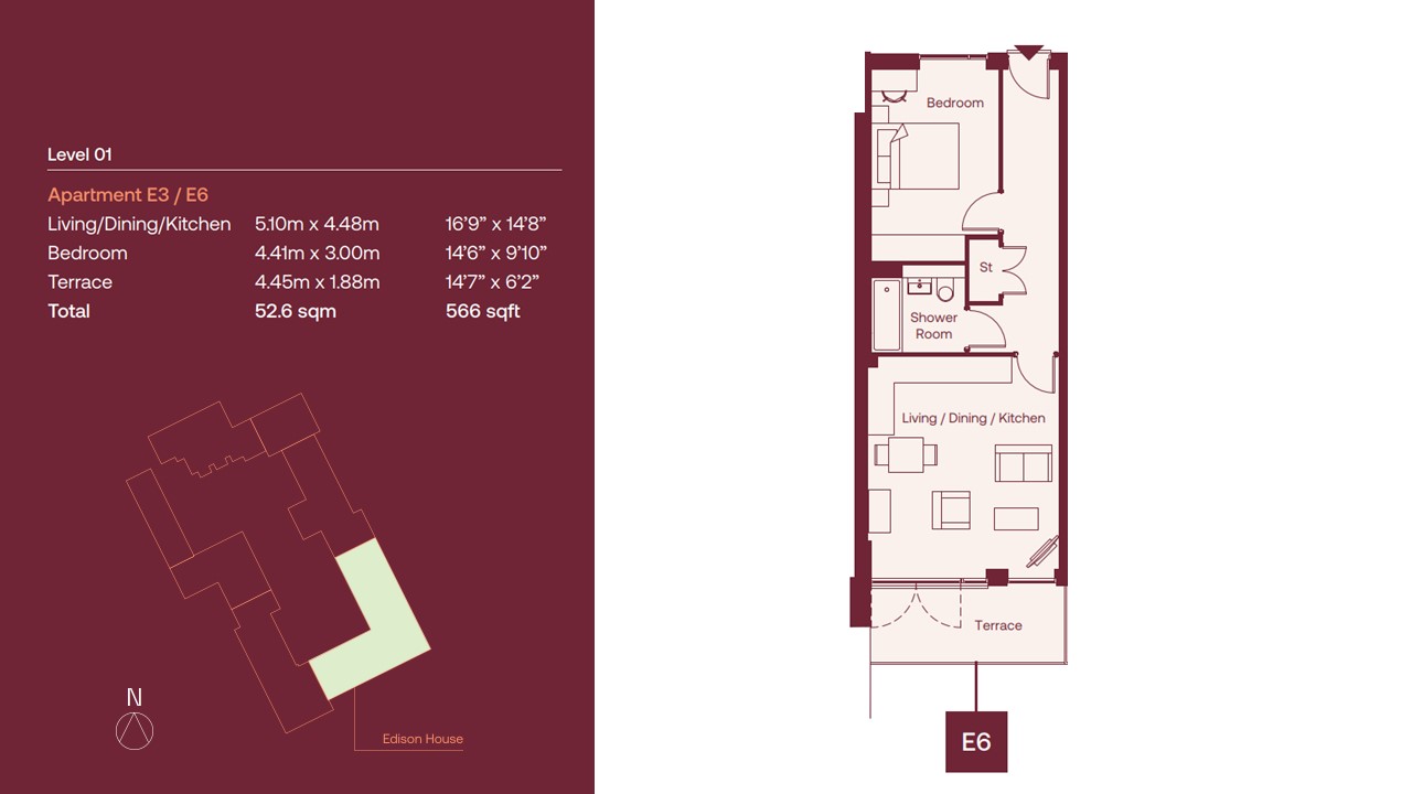 6 Edison House is a one bedroom apartment with 551 sq ft of accommodation with terrace and allocated parking.