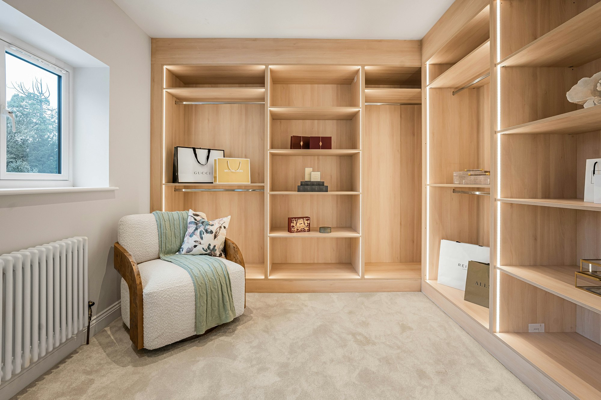 On the first floor, the principal bedroom suite is a stunning peaceful retreat – an impressive bedroom with fabulous floor to ceiling cathedral-style window overlooking the rear garden, a fitted walk-in dressing room and the most luxurious en-suite boasting a free-standing bath and separate shower cubicle, feature oak panelled wall and double sink vanity unit. This stunning space alone will tempt you to seriously consider moving in!