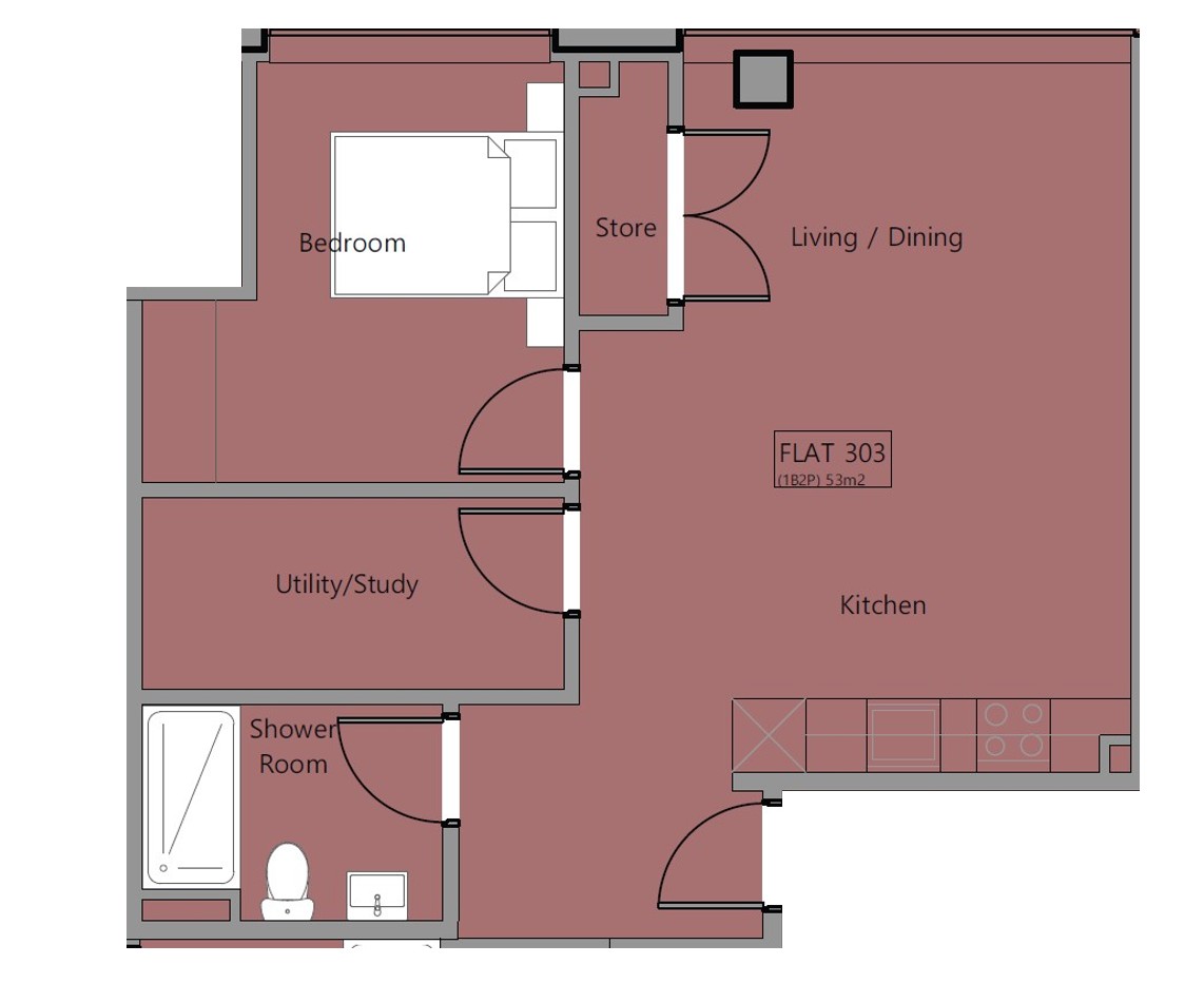 Plot 303 is a one bedroom third floor apartment with 549 sq ft of accommodation including a separate study.