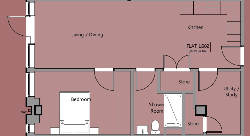 Plot LG02 is a one bedroom lower ground floor apartment with 585 sq ft of accommodation and an outdoor courtyard. In addition to the large living/kitchen/dining area there is the added benefit of a utility / study room.