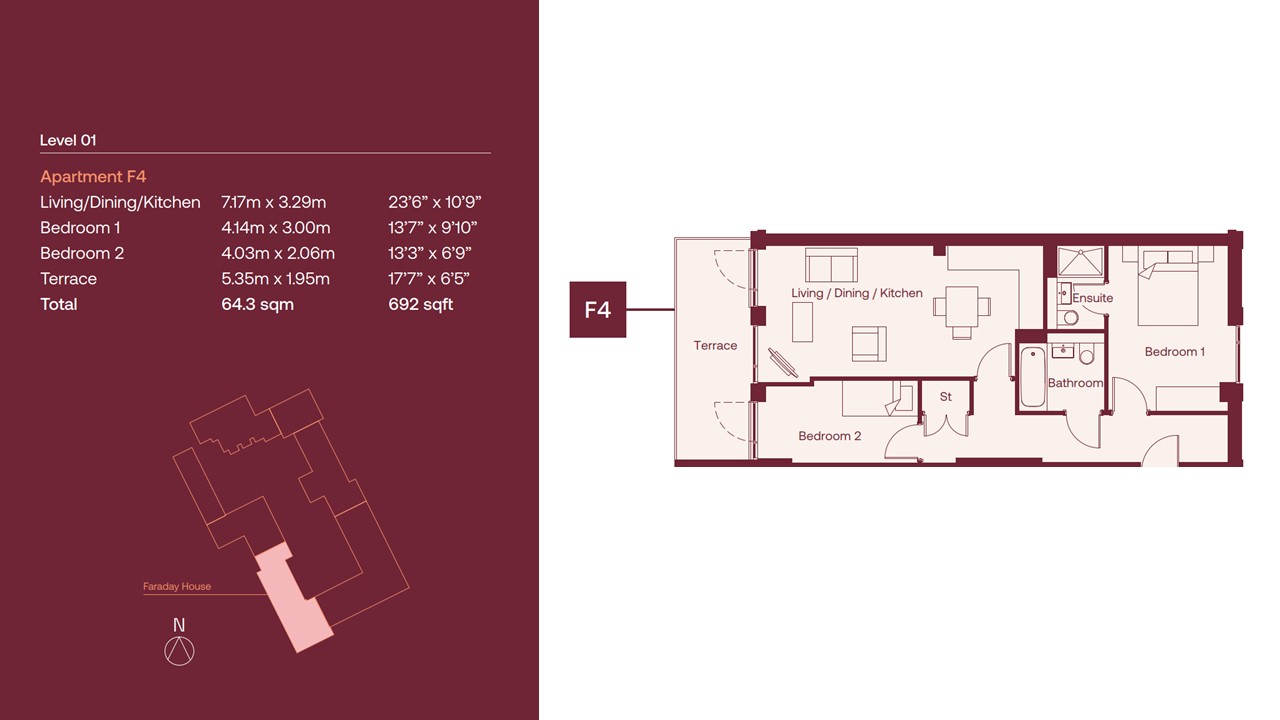 4 Faraday House is a two bedroom apartment with 692 sq ft of accommodation, private terrace/garden and allocated parking.