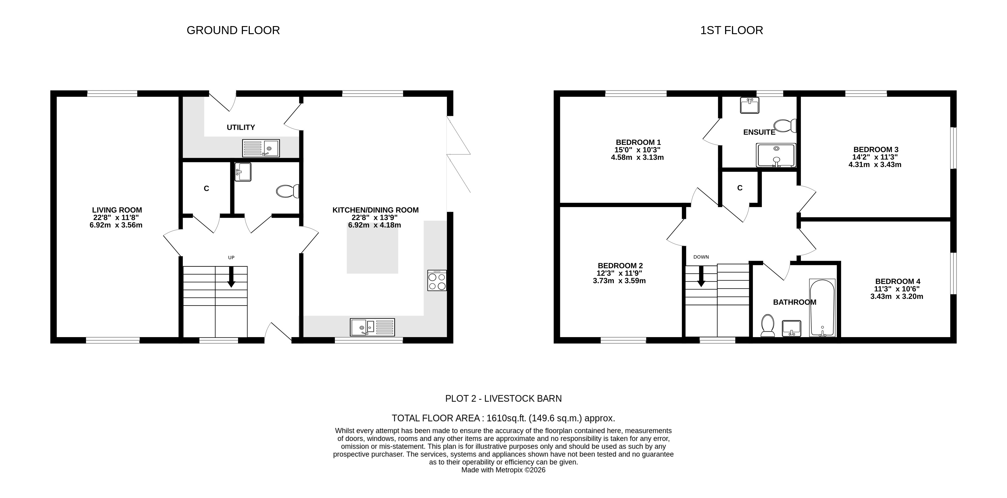 Plot 2 is a four bedroom detached home with 1610 sq ft of accommodation comprising large kitchen/dining room with bi-fold doors to the rear garden, separate utility room and separate triple aspect living room. On the first floor are four double bedrooms, master with ensuite and a separate family bathroom.