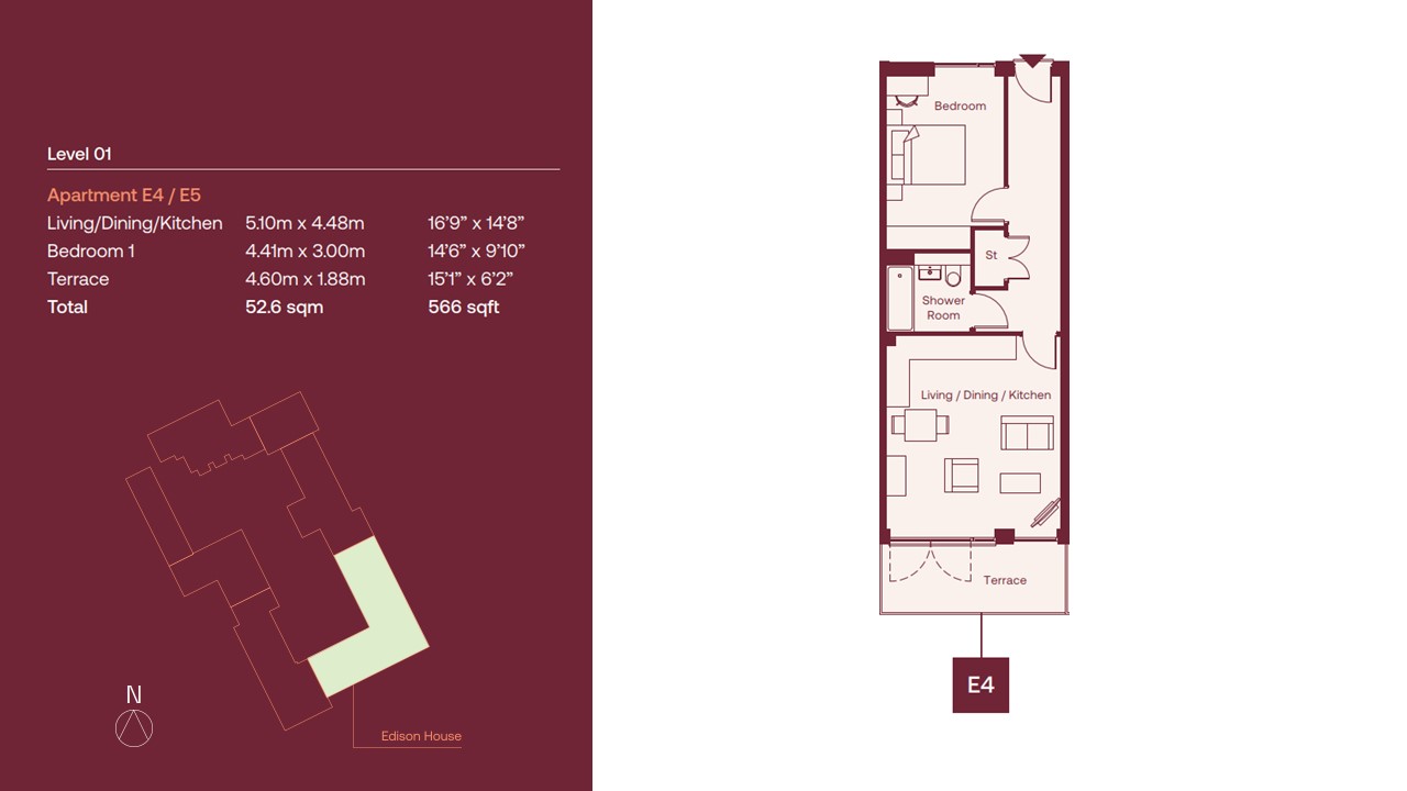 4 Edison House is a one bedroom apartment measuring 560 sq ft with a private terrace.