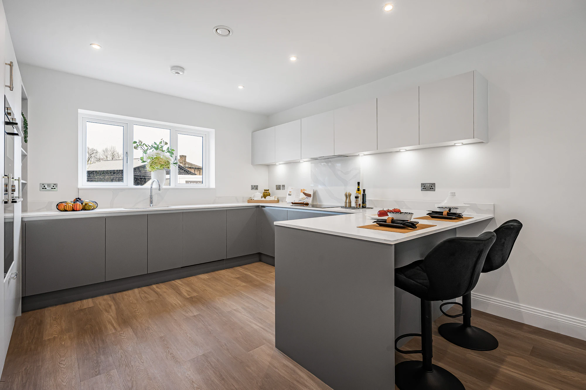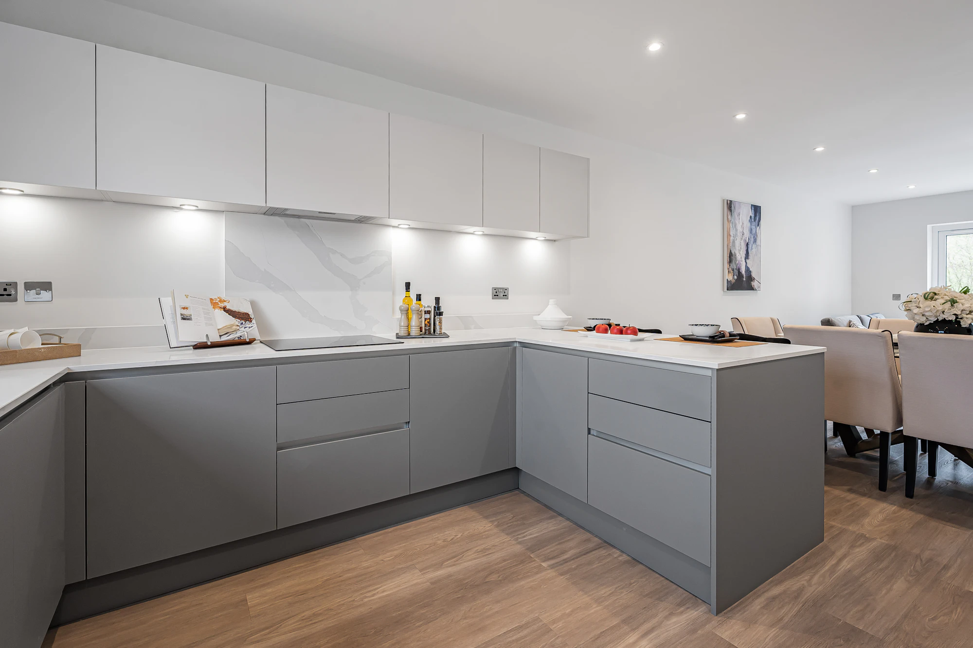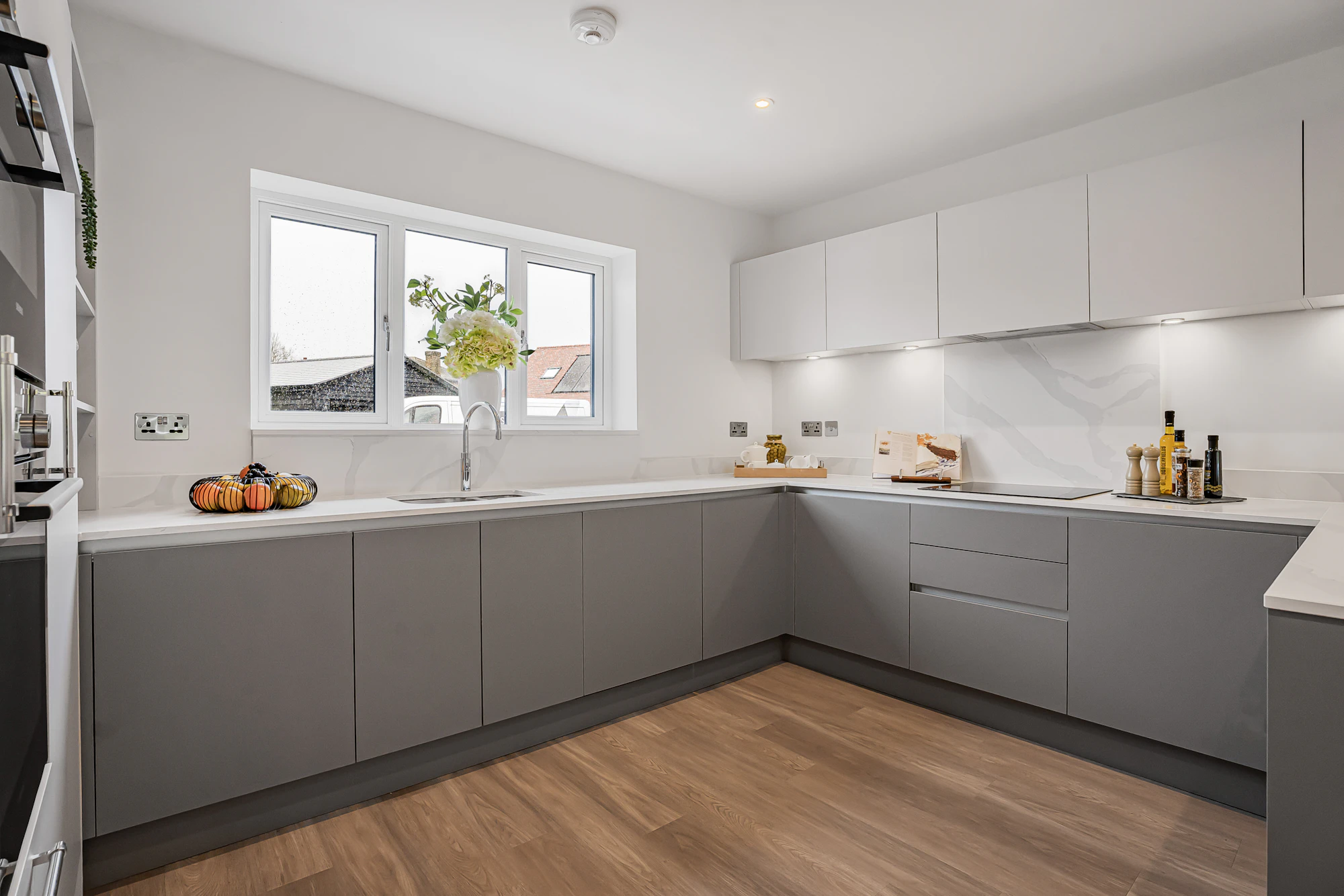 Additional specification benefits include integrated branded appliances, flooring, security alarm, aqua bion water conditioner, Quooker hot water tap, and electric garage doors.