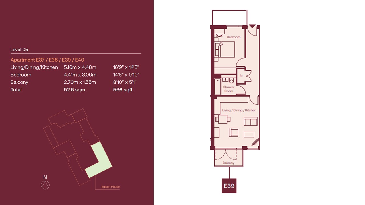 Plot E39 is the last remaining one bedroom top floor apartment with private balcony and 560 sq ft of accommodation.