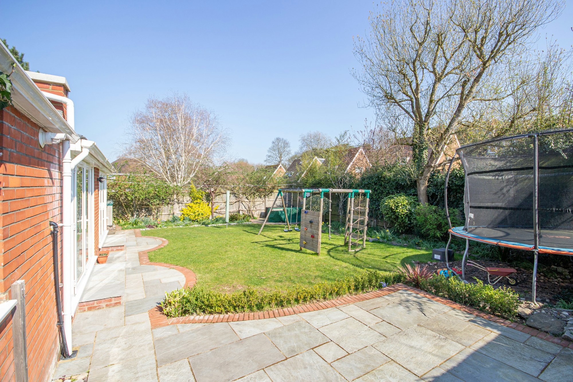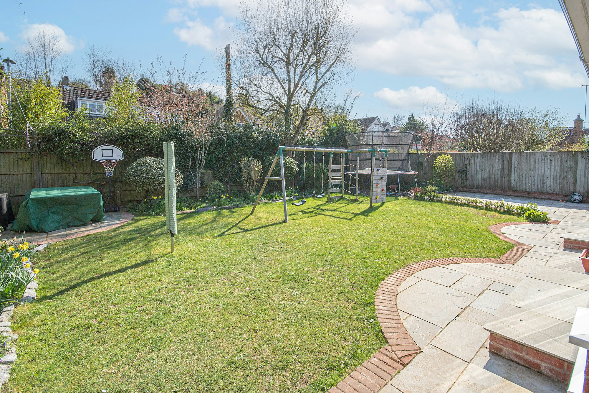 Outside, the south-east facing garden is a private sanctuary, landscaped for relaxation and entertaining. A paved seating area, level lawn, and vibrant flowerbeds create a serene setting for family gatherings or quiet evenings. The front of the property features a driveway with off-street parking.
