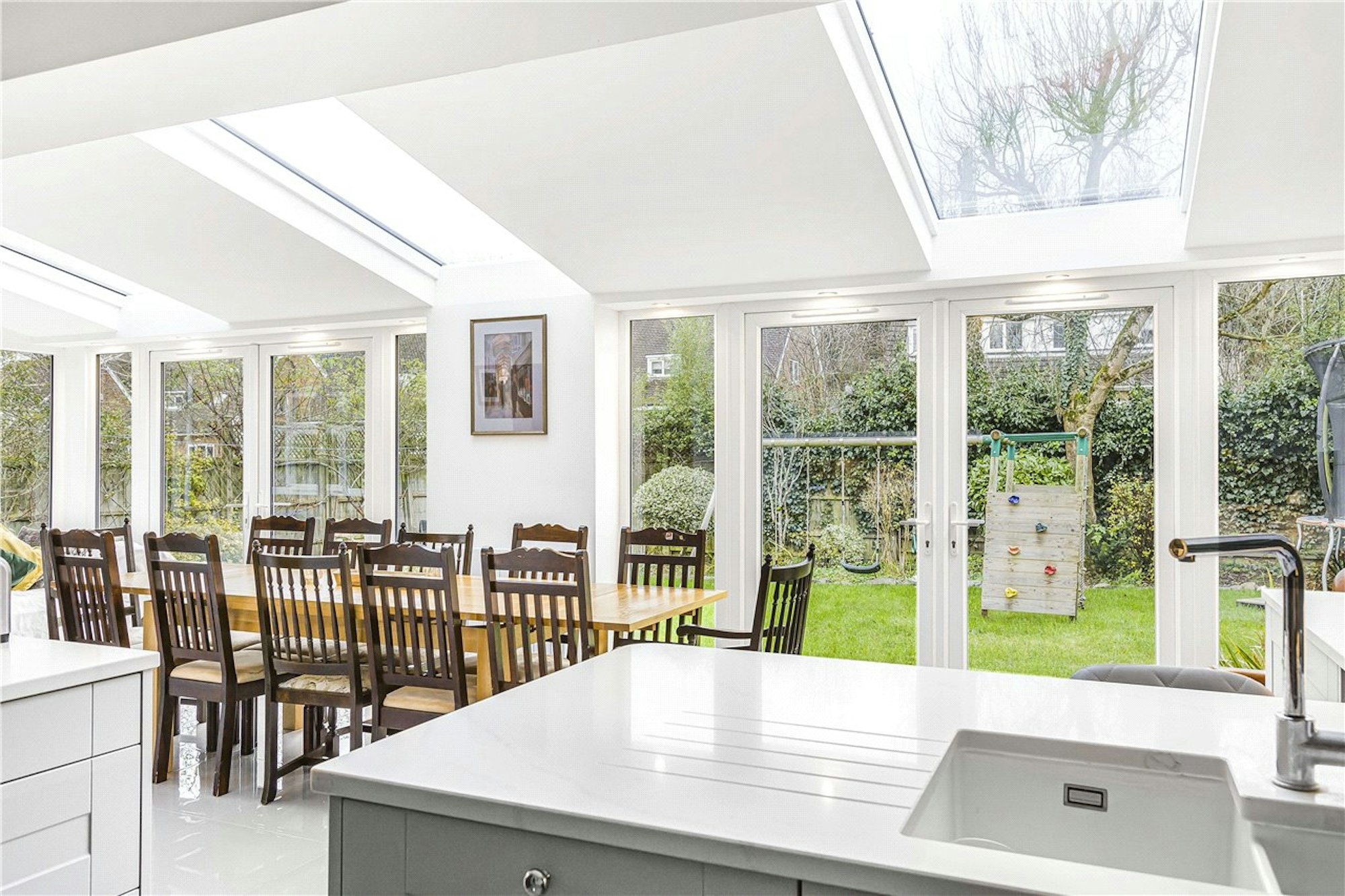 At the heart of the home lies the impressive kitchen and dining area. This show stopping space, enhanced by roof windows and two sets of French doors, is both functional and stylish. The high-quality cabinetry, granite worktops, breakfast bar and integrated appliances provide a chef's dream setting, while the connection to the garden makes it ideal for entertaining. A large utility room and direct access to the garage add further practicality.