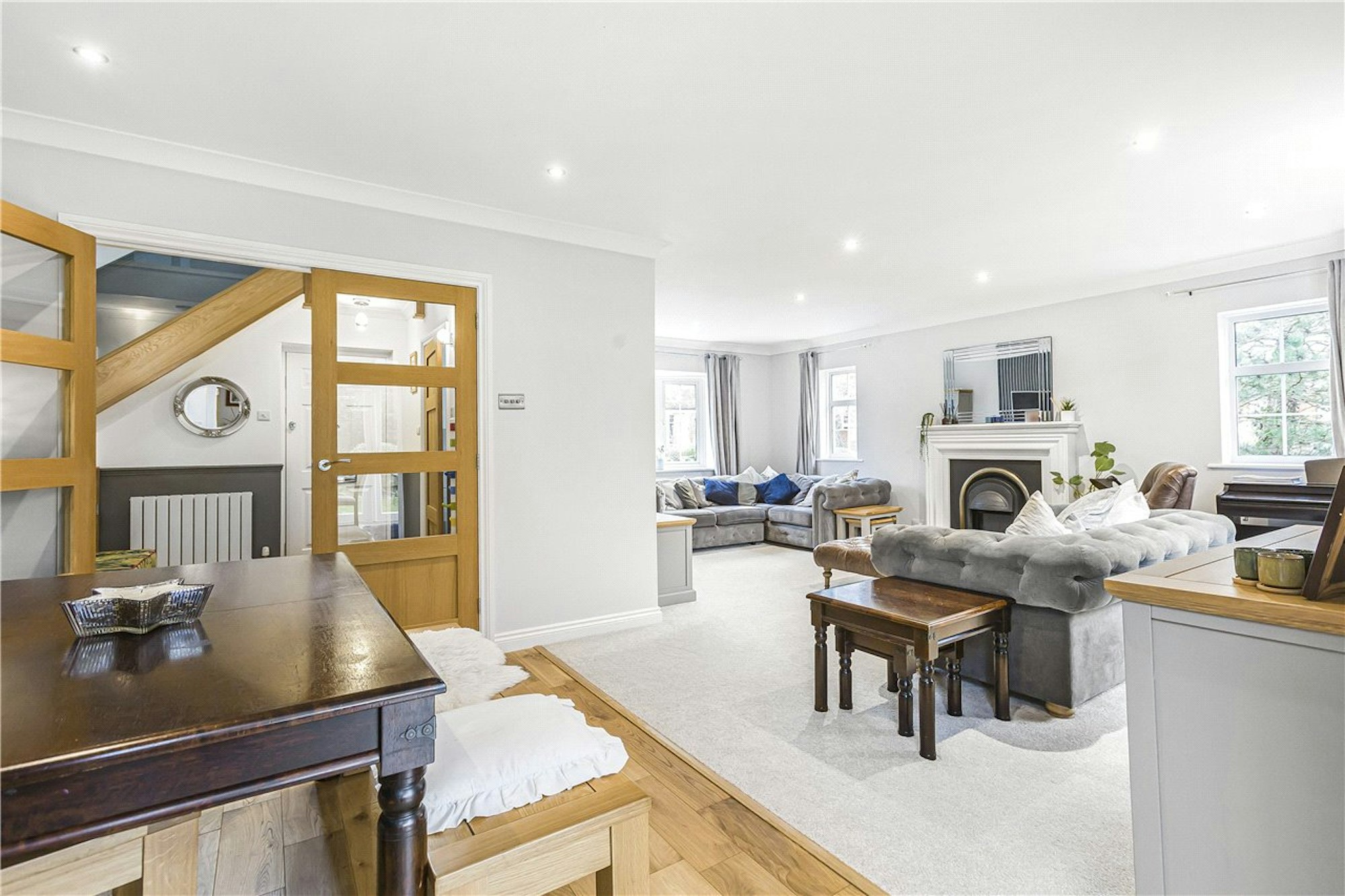 Step through the inviting front door into a spacious and welcoming hallway, complete with two practical storage cupboards and a cloakroom with wc. The layout flows seamlessly, offering access to a bright front-facing study, a well-appointed kitchen at the rear and double doors that lead to a stunning living room. Bathed in natural light from its triple-aspect windows and highlighted by a charming feature fireplace, this living space connects effortlessly to the rear extension, creating an open, airy ambiance.