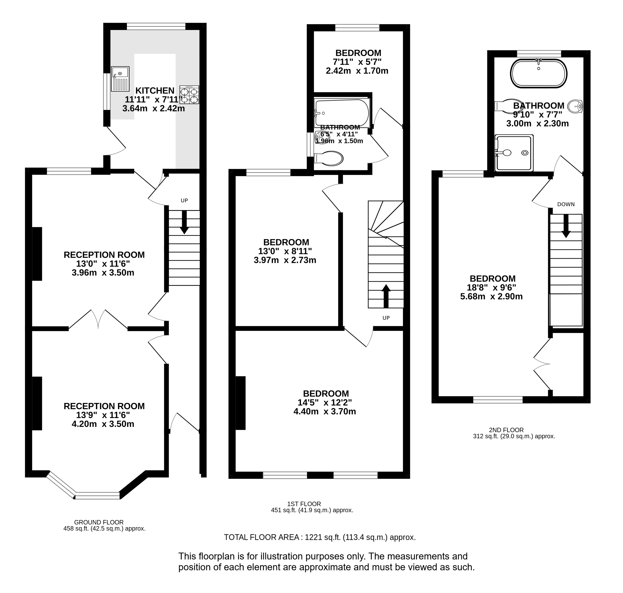Stairs lead from the hall to the first floor where there are two double bedrooms, the largest of which has a period fireplace and spans the full width of the property. There is also a smaller bedroom to the rear, ideal as a nursery or a home office space, as well as a bright family bathroom with a window to the side of the house.