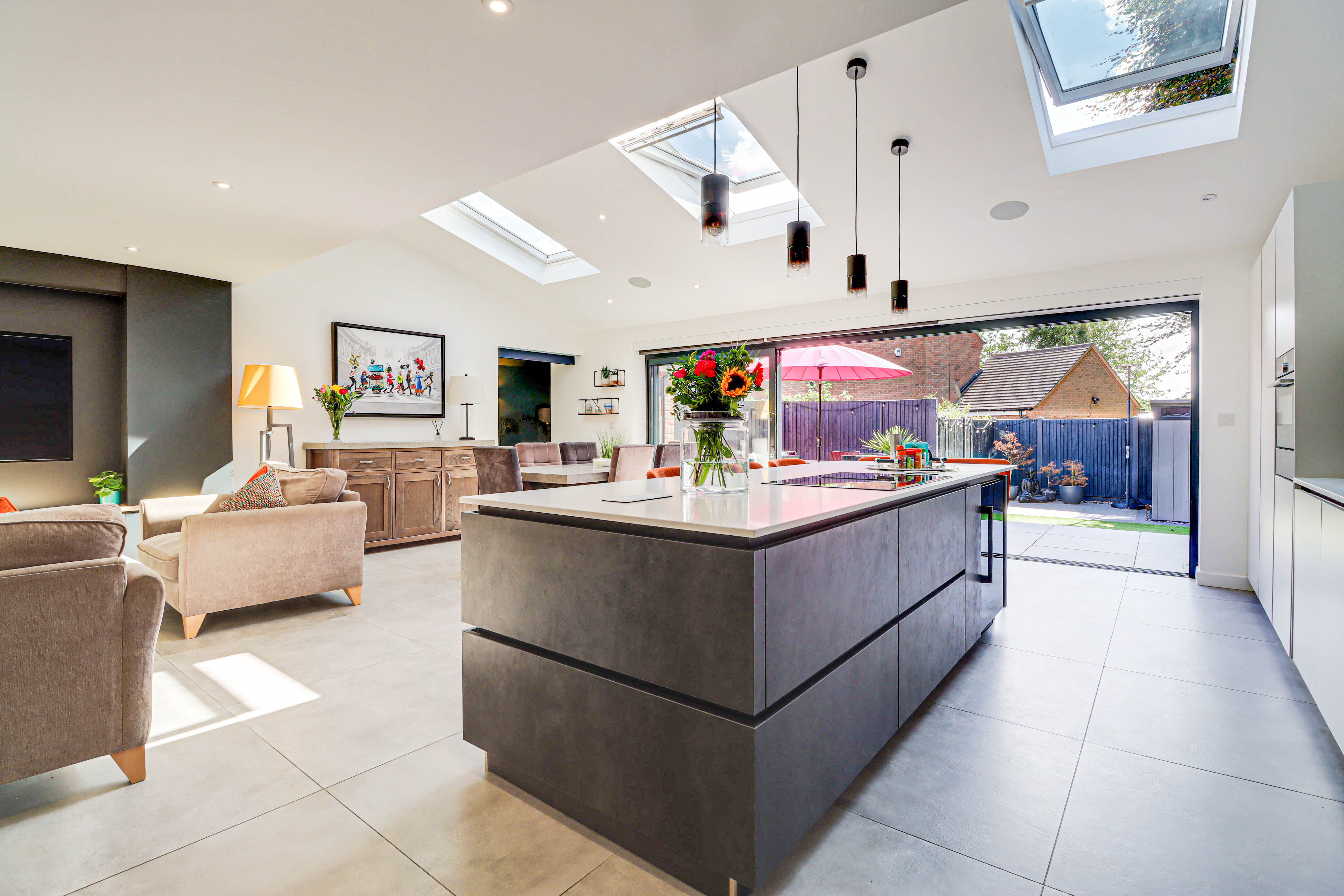 At the heart of the home is a superb open-plan kitchen, dining and living area, ideal for both day-to-day family living and entertaining. This bright and spacious room seamlessly connects to a separate lounge, offering an additional retreat for more relaxed evenings. The layout flows effortlessly, creating an inviting environment for family gatherings and social occasions.