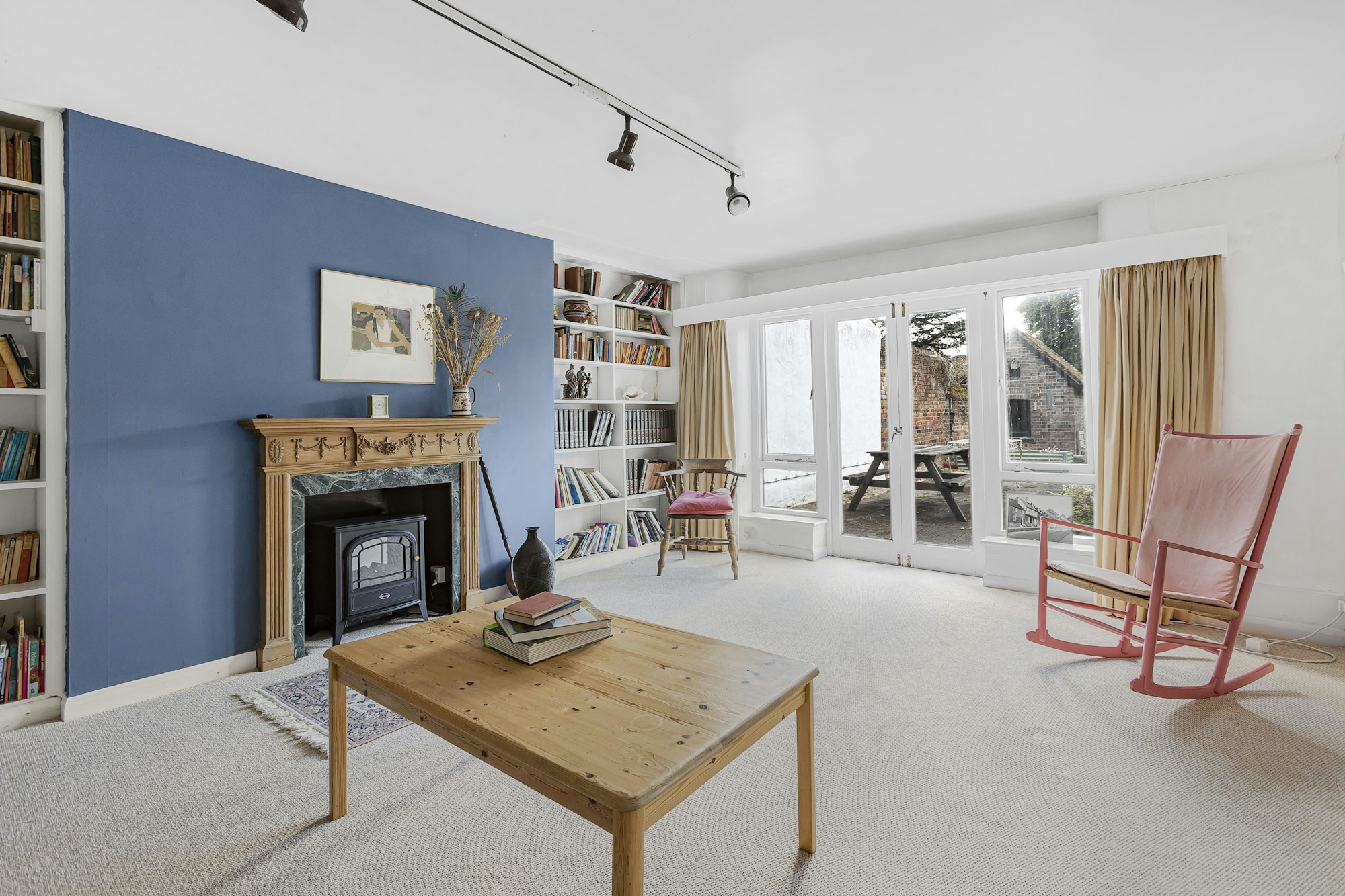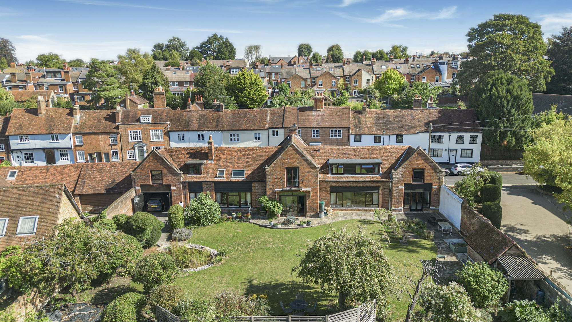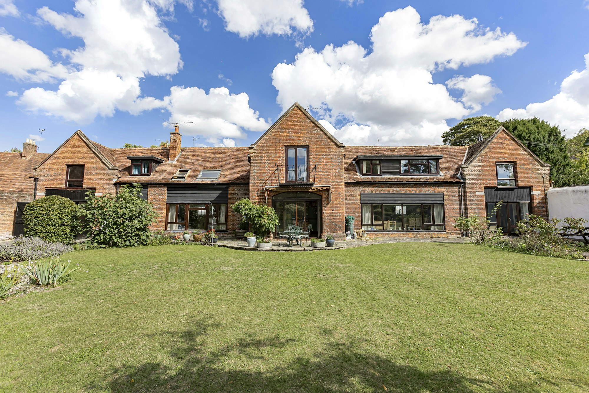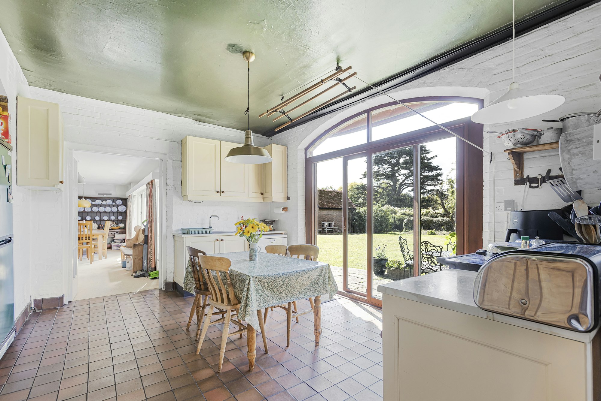 Occupying a beautifully wide plot, this much loved family home has the character and charm you might expect for its age, combined with a spacious layout of generously proportioned rooms in a configuration allowing excellent flexibility of use. The property is entered at the centre of the plan with accommodation arranged longitudinally either side, and there are three lovely reception rooms on the ground floor, all with views of the garden through large, low silled windows. The living room is double height, with a galleried landing above and a working fireplace, and there is a spacious dining room with parquet flooring beneath the carpet which leads through double doors to a further, delightful room which could serve as a reception space, playroom or study as needed. The bright kitchen is located to the rear of the house with access through an original stable door, and this has space for informal dining, ample storage and an electric AGA. There is also a separate utility room, as well as two WCs, one of which is positioned beyond the main living room and adjacent to a ground floor bedroom.