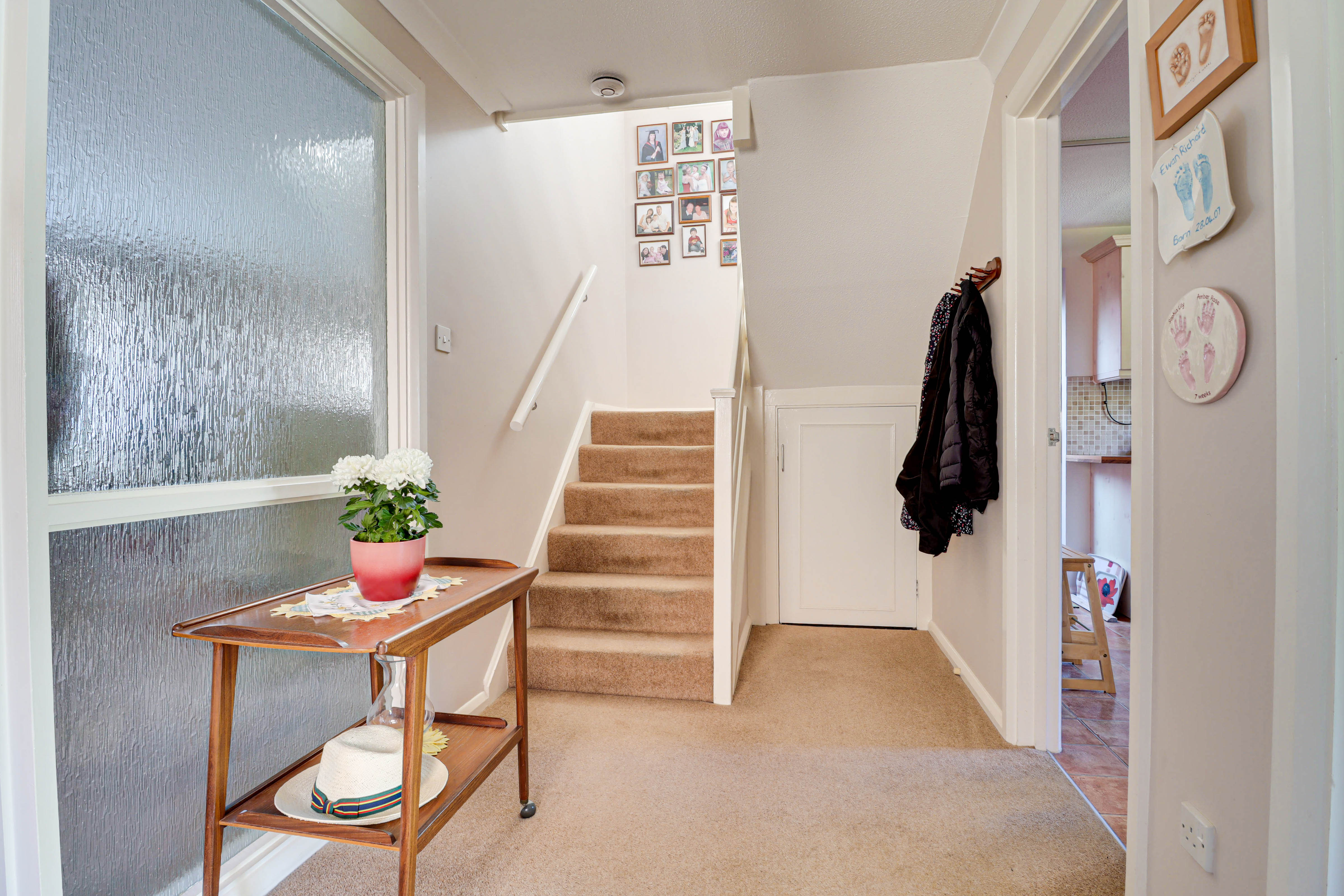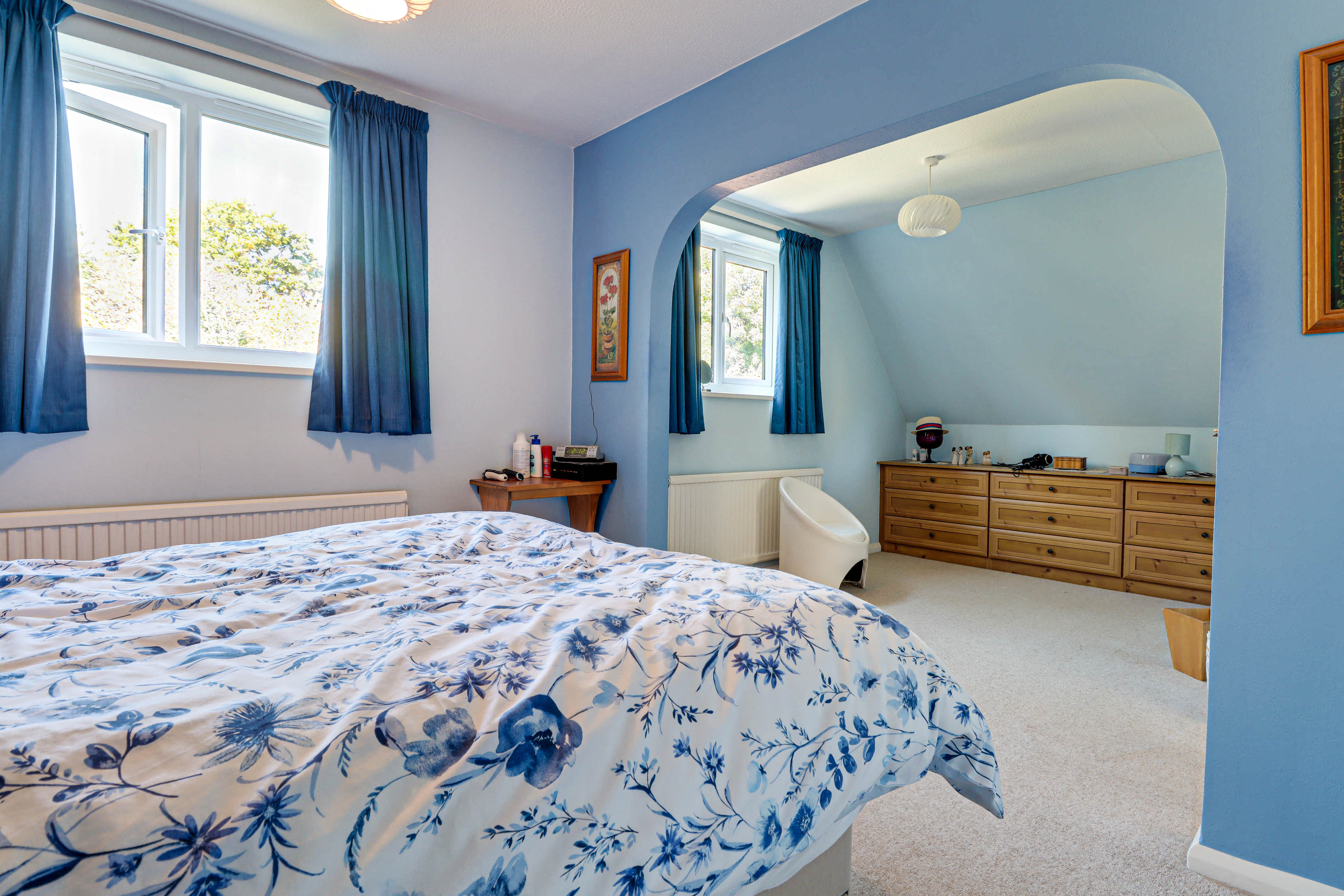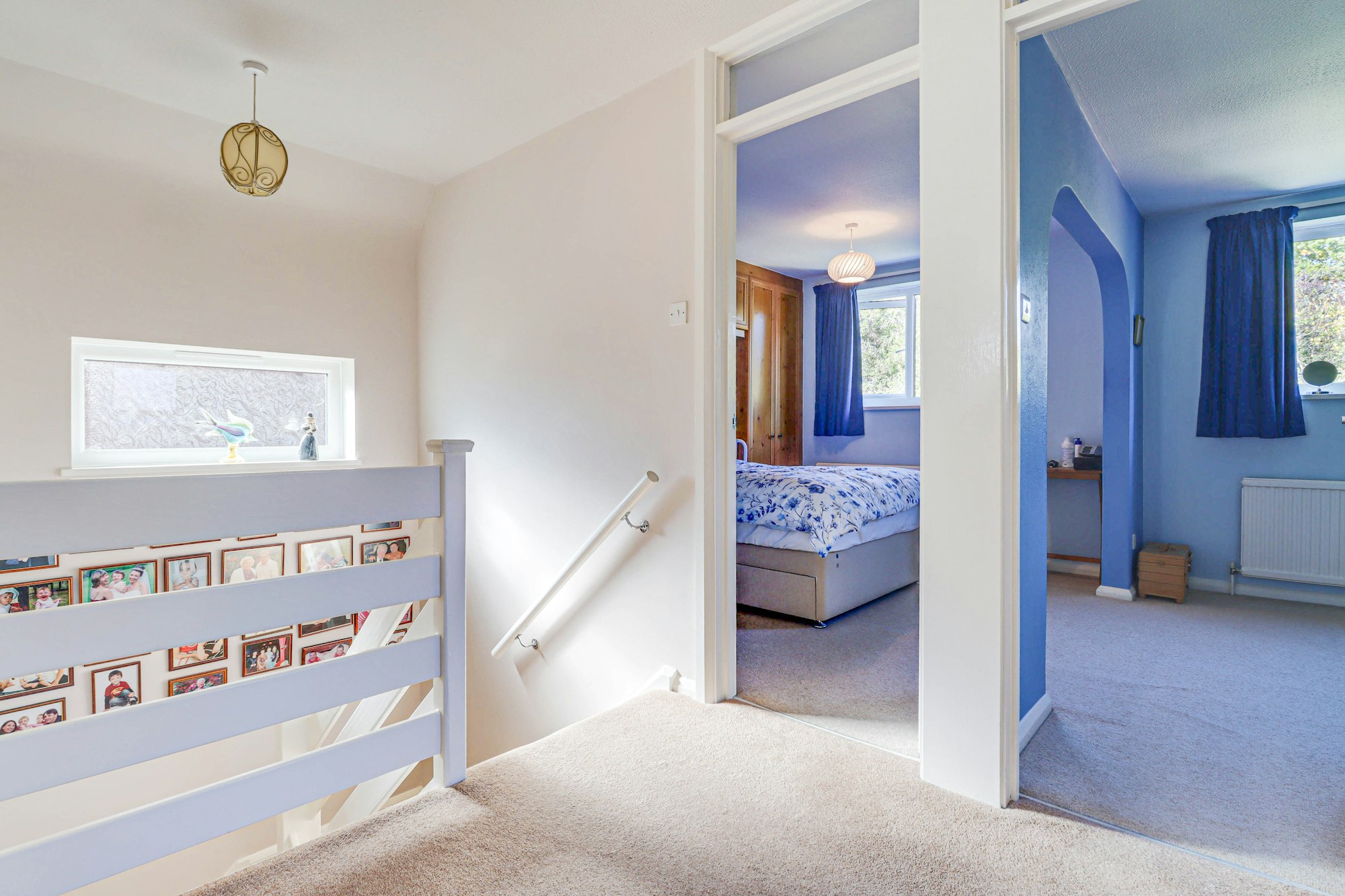 Upstairs, three well-proportioned bedrooms are served by a spacious four-piece family bathroom with separate bath and shower. The principal bedroom is particularly impressive with built-in storage, and enjoys a bright, airy feel.