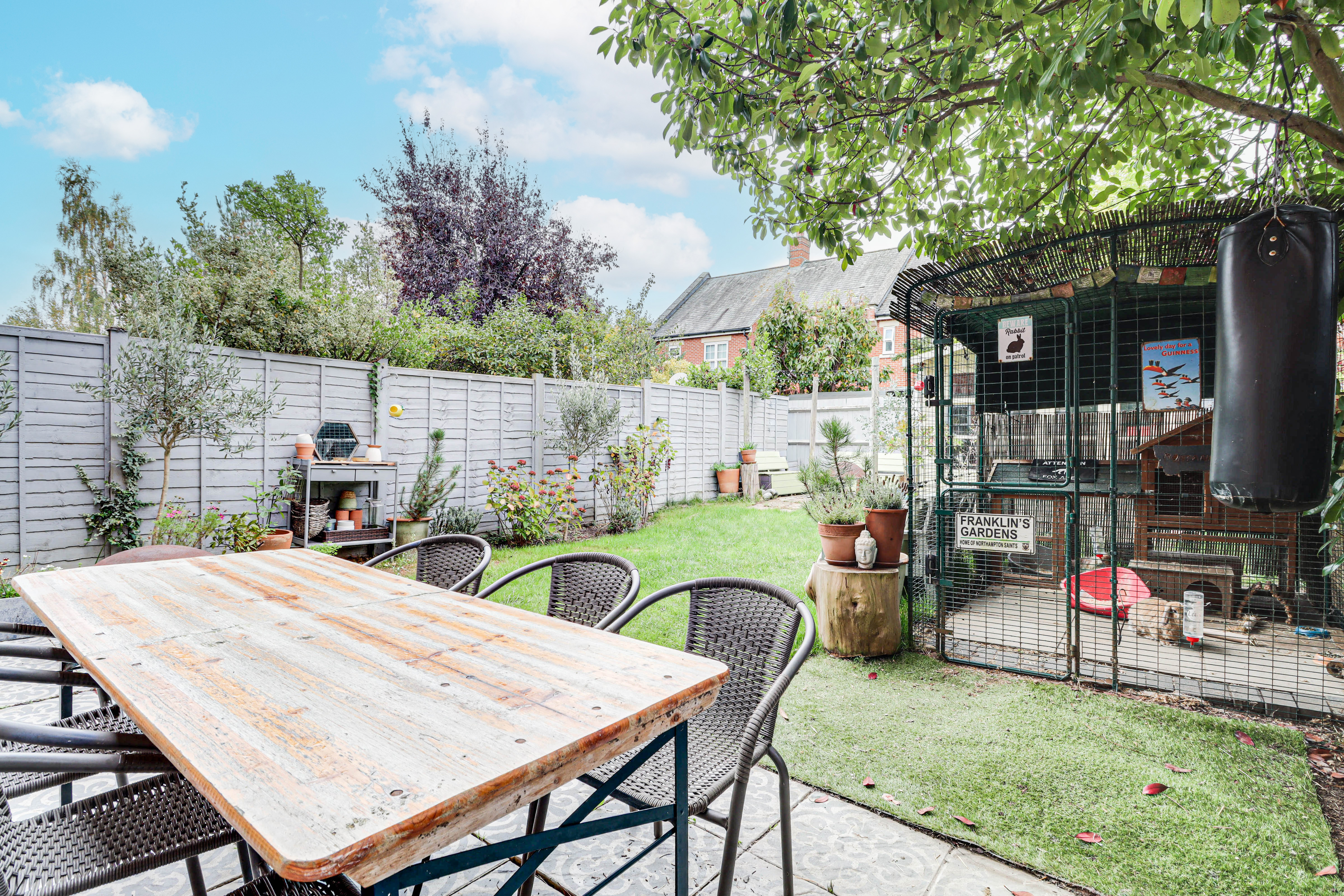 The rear garden faces south and has been landscaped to create a paved seating area close to the house with a lawn beyond. There is a timber garden building at the rear and a pretty planted bed to the side.