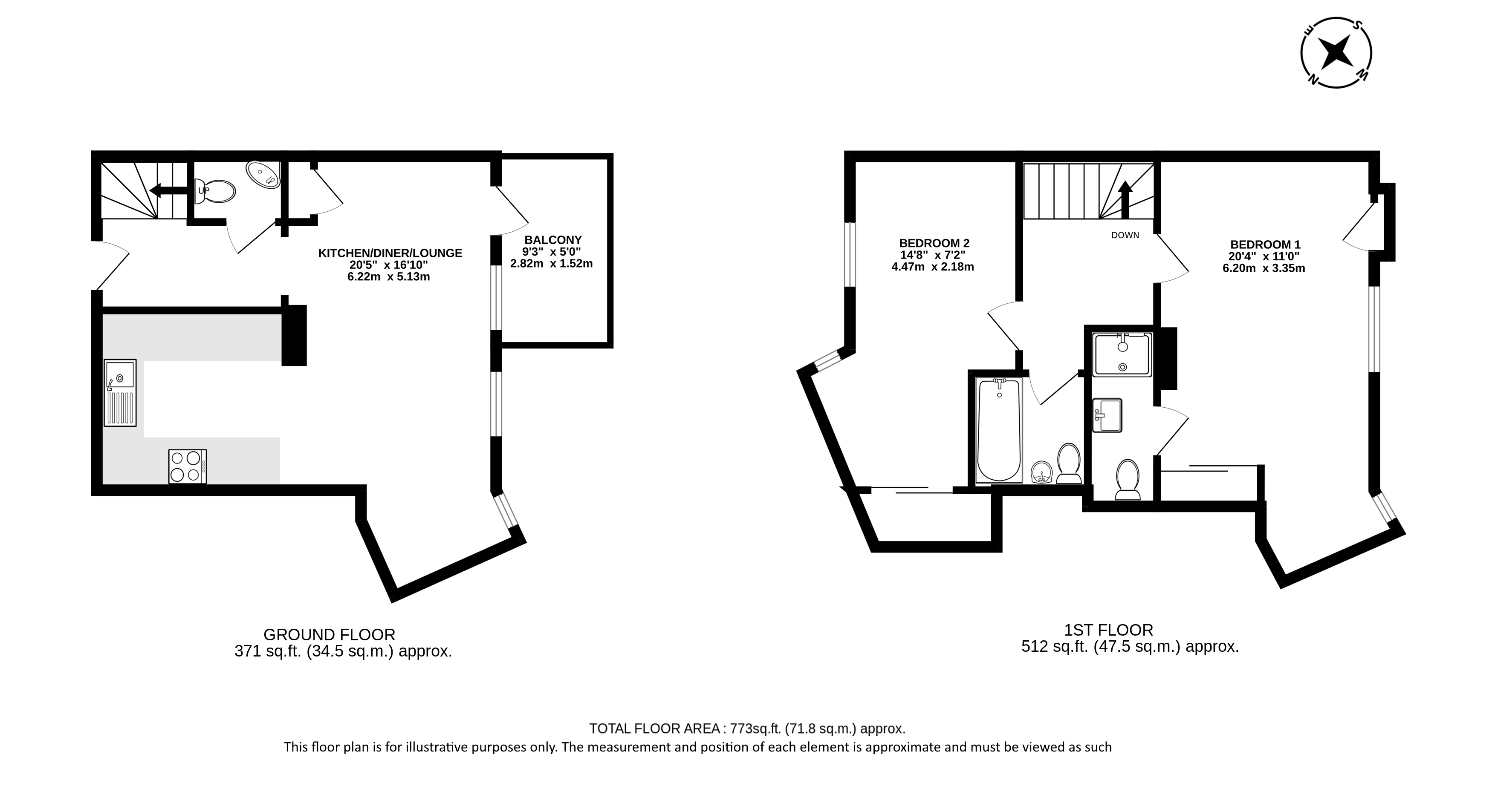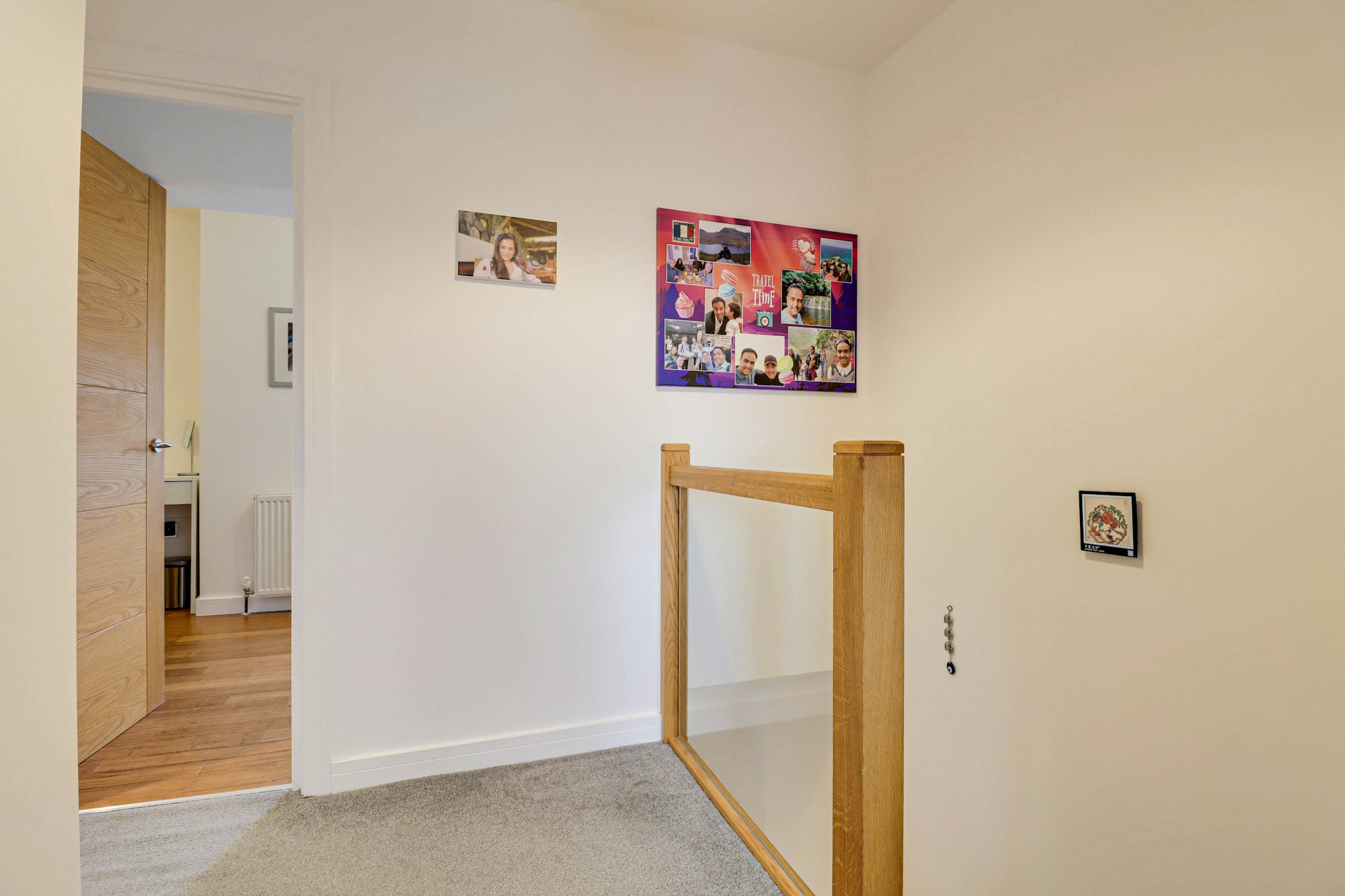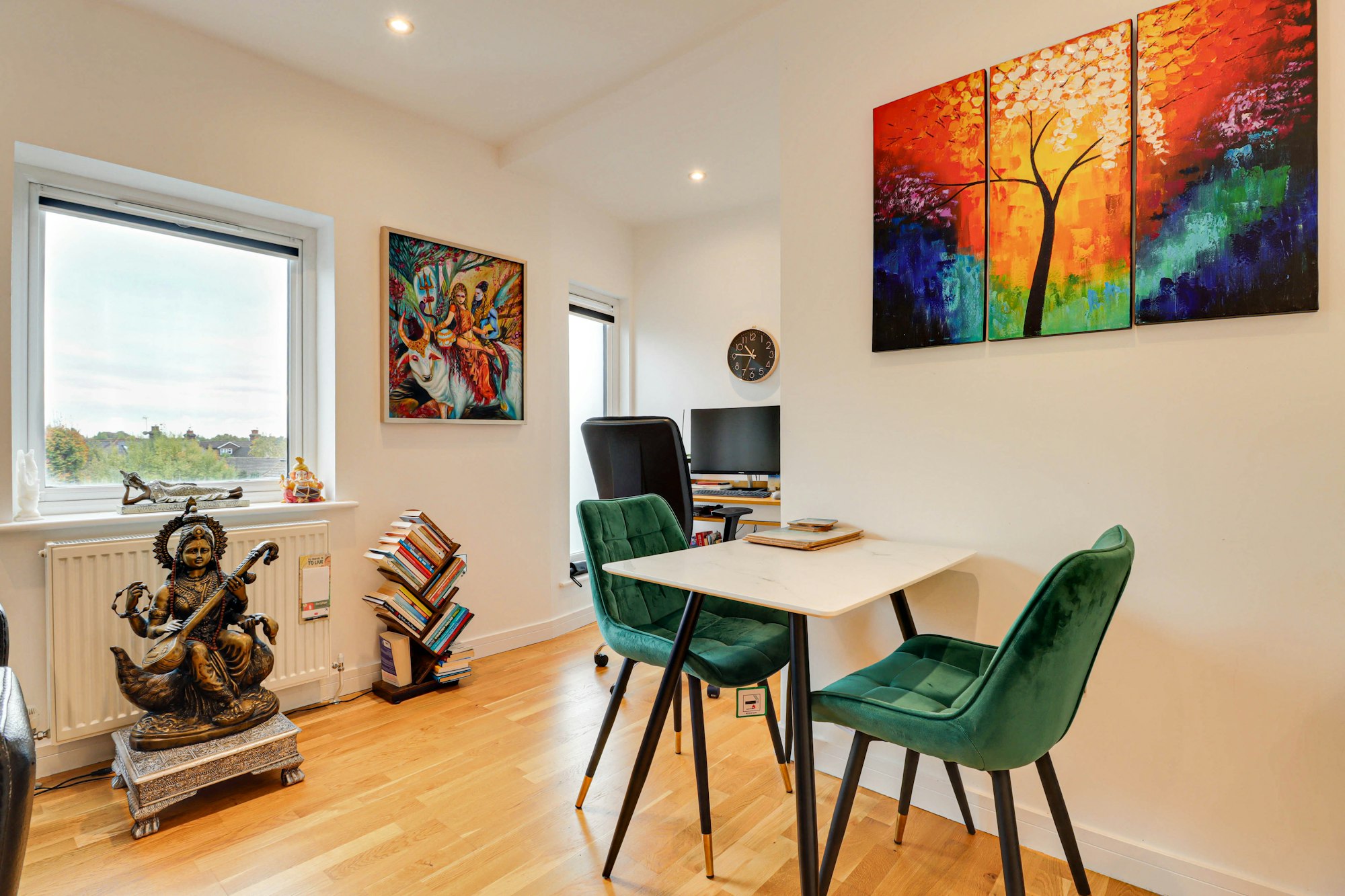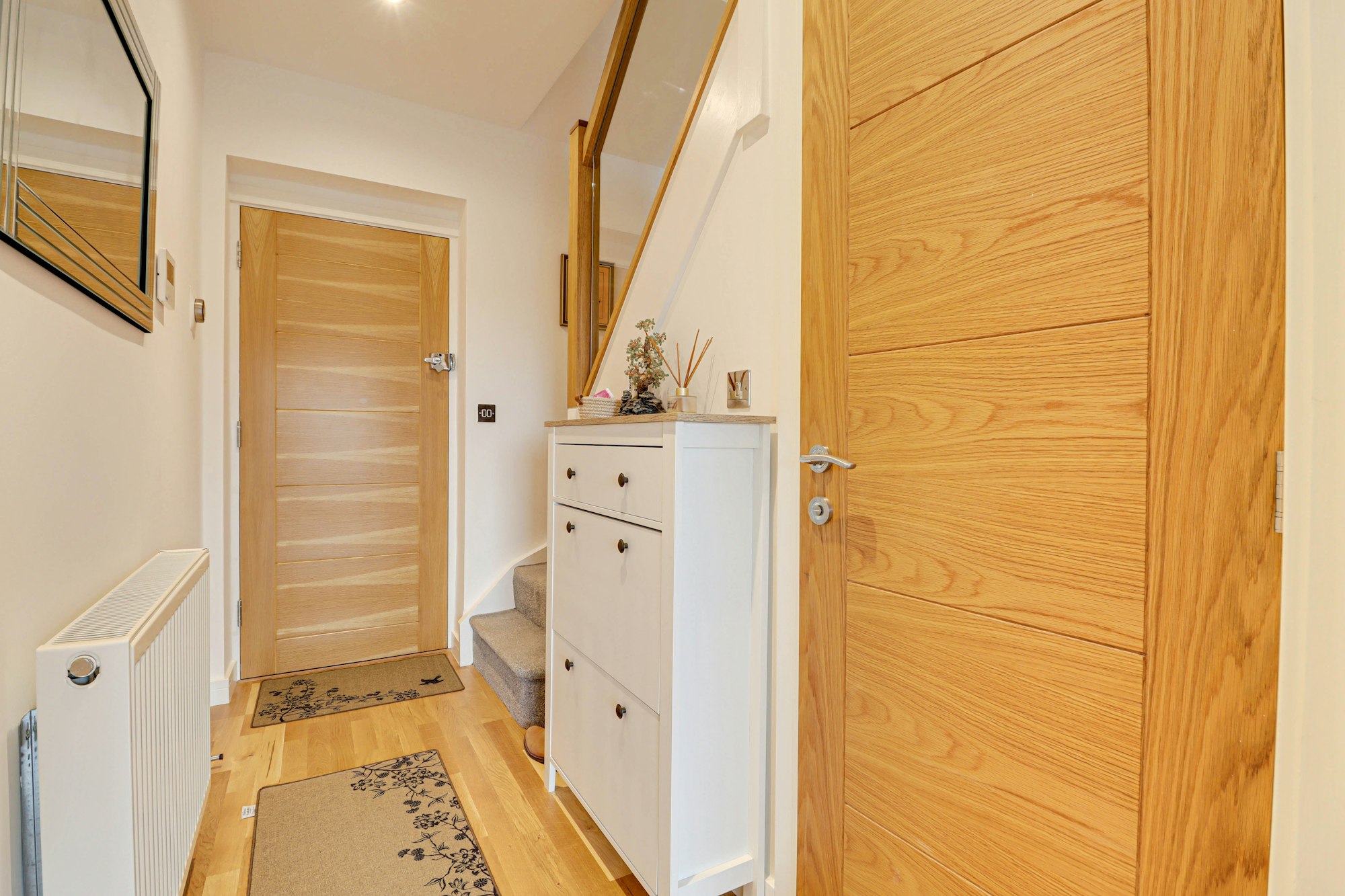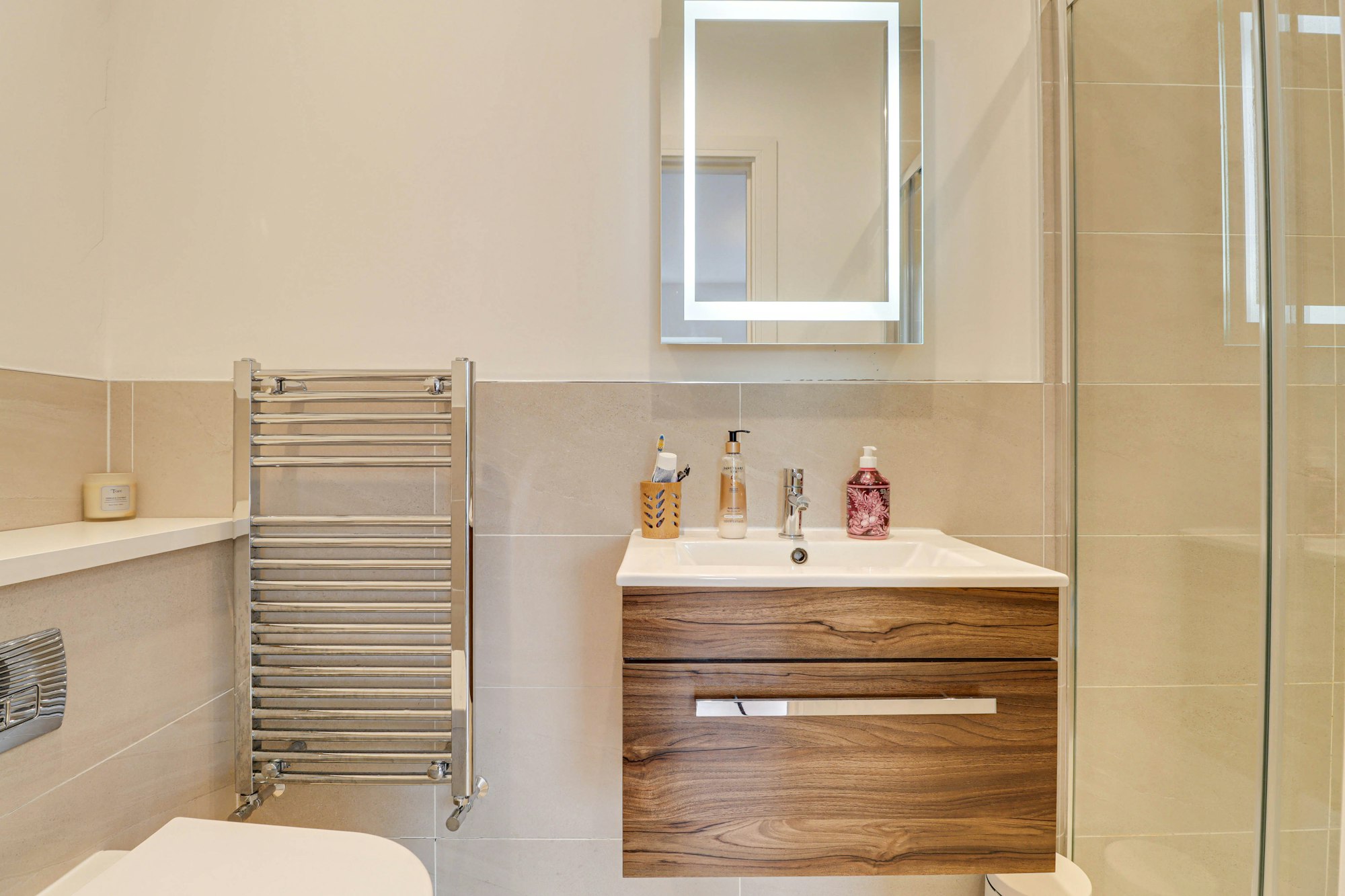 Upstairs, two generous double bedrooms are complemented by two elegant bathrooms. The principal bedroom enjoys built-in wardrobes and a contemporary en-suite shower room, while the second bedroom is served by a stylish family bathroom.