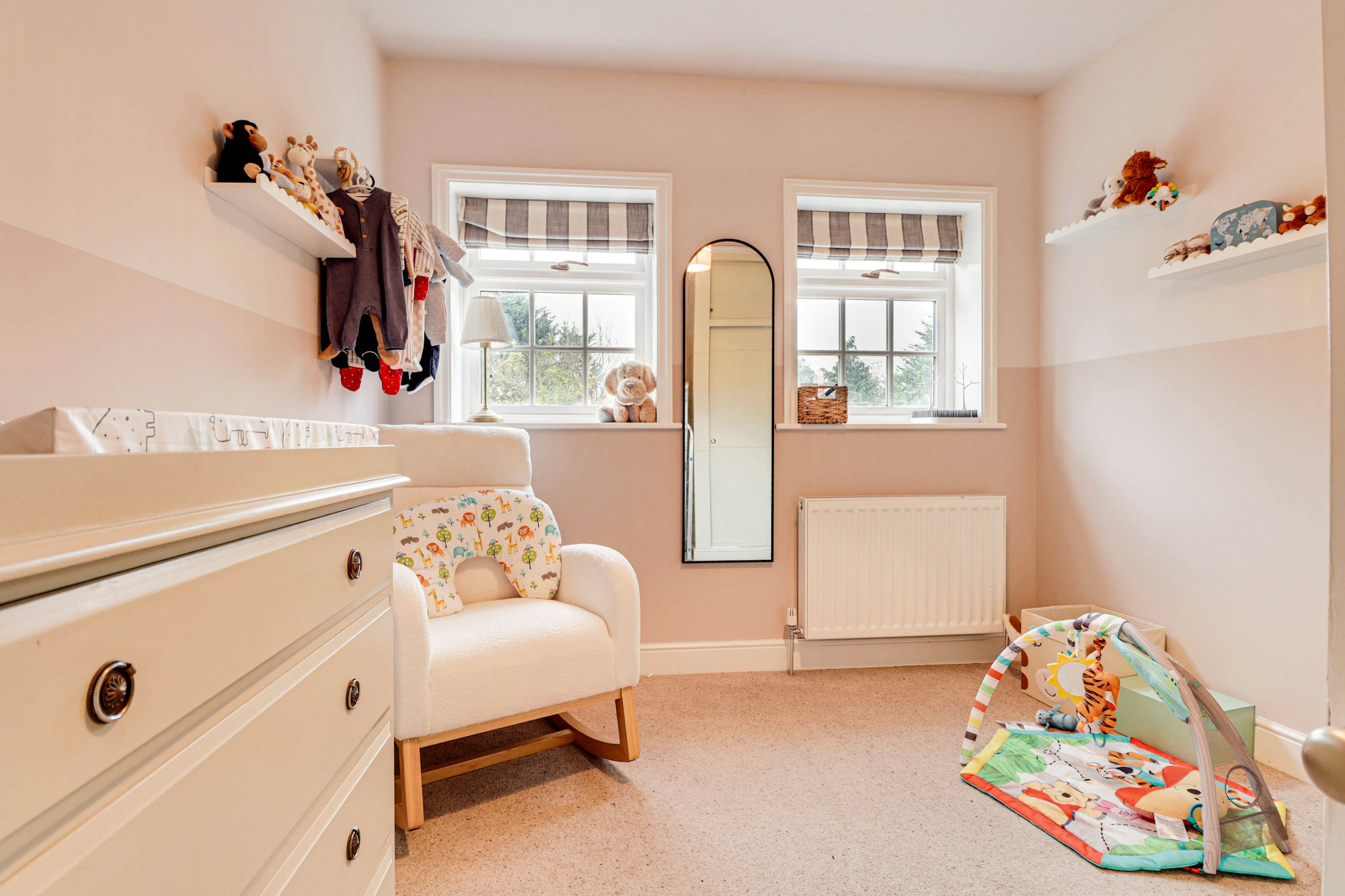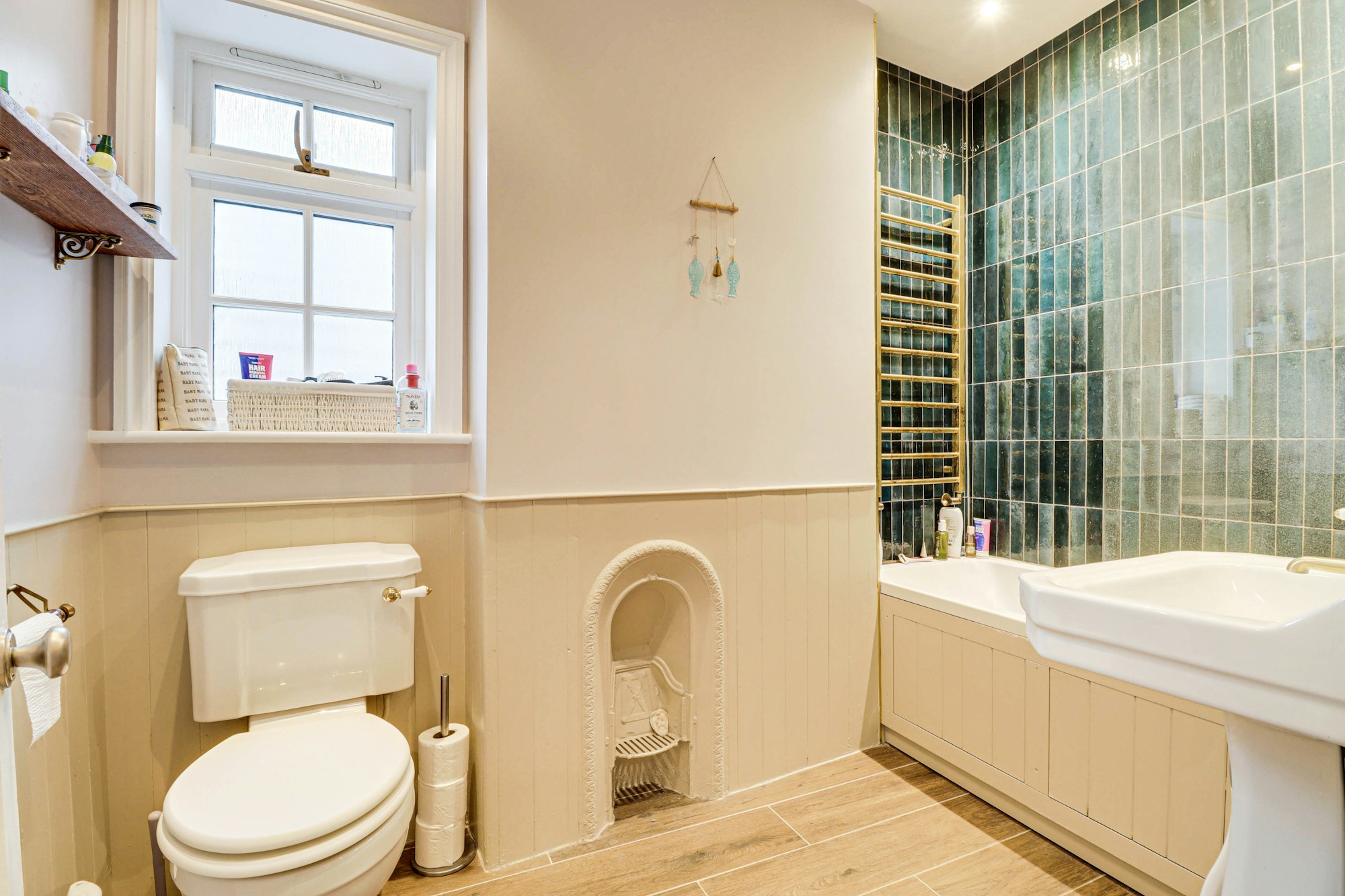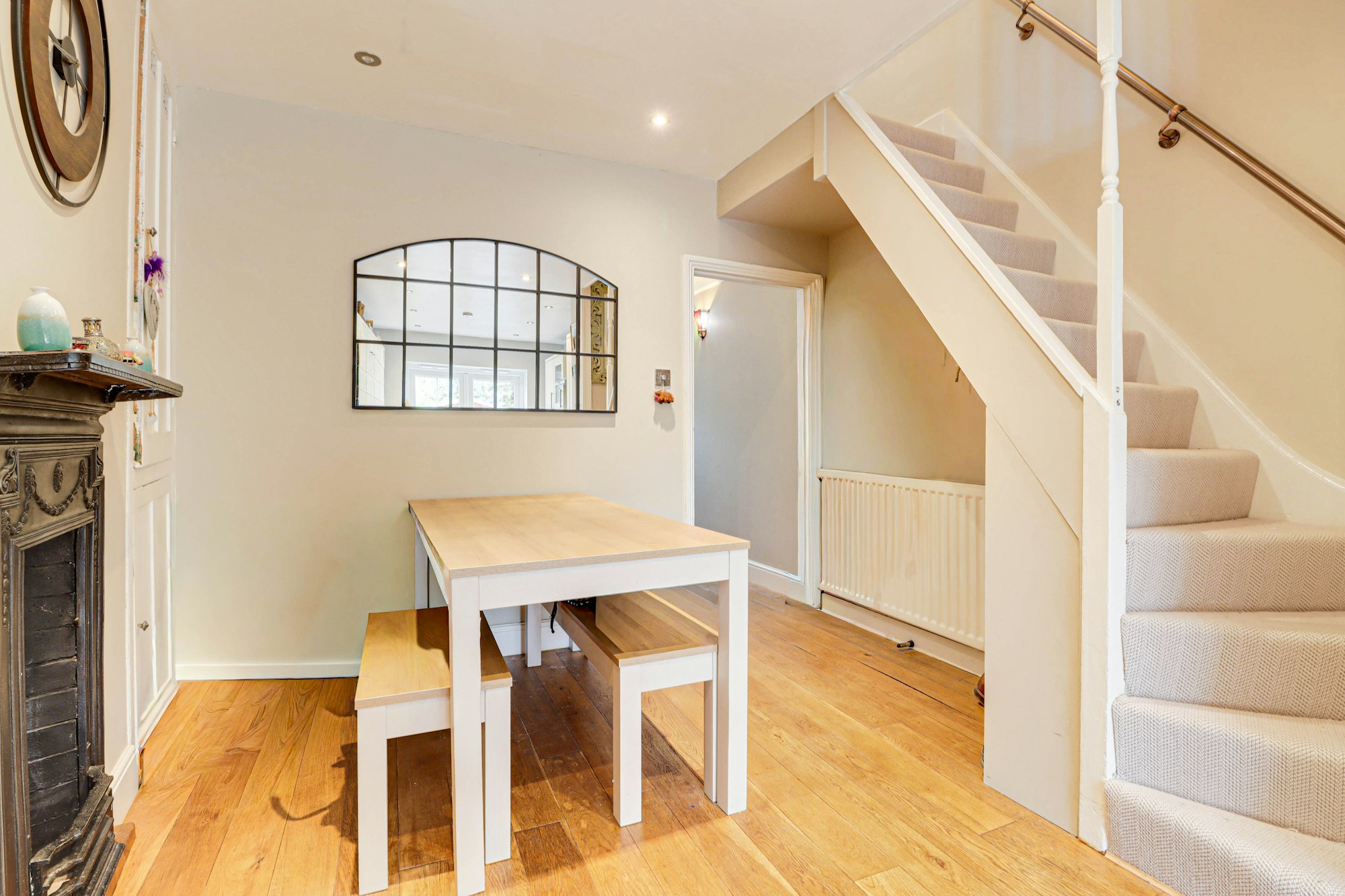 An open staircase rises from the dining area to the first floor, where you will find two well-proportioned bedrooms. The principal bedroom to the front enjoys picturesque views over the stream, framed by elegant sash windows that fill the room with natural light. To the rear, a spacious double bedroom provides a calm and comfortable retreat, while the family bathroom offers a stylish and functional space.