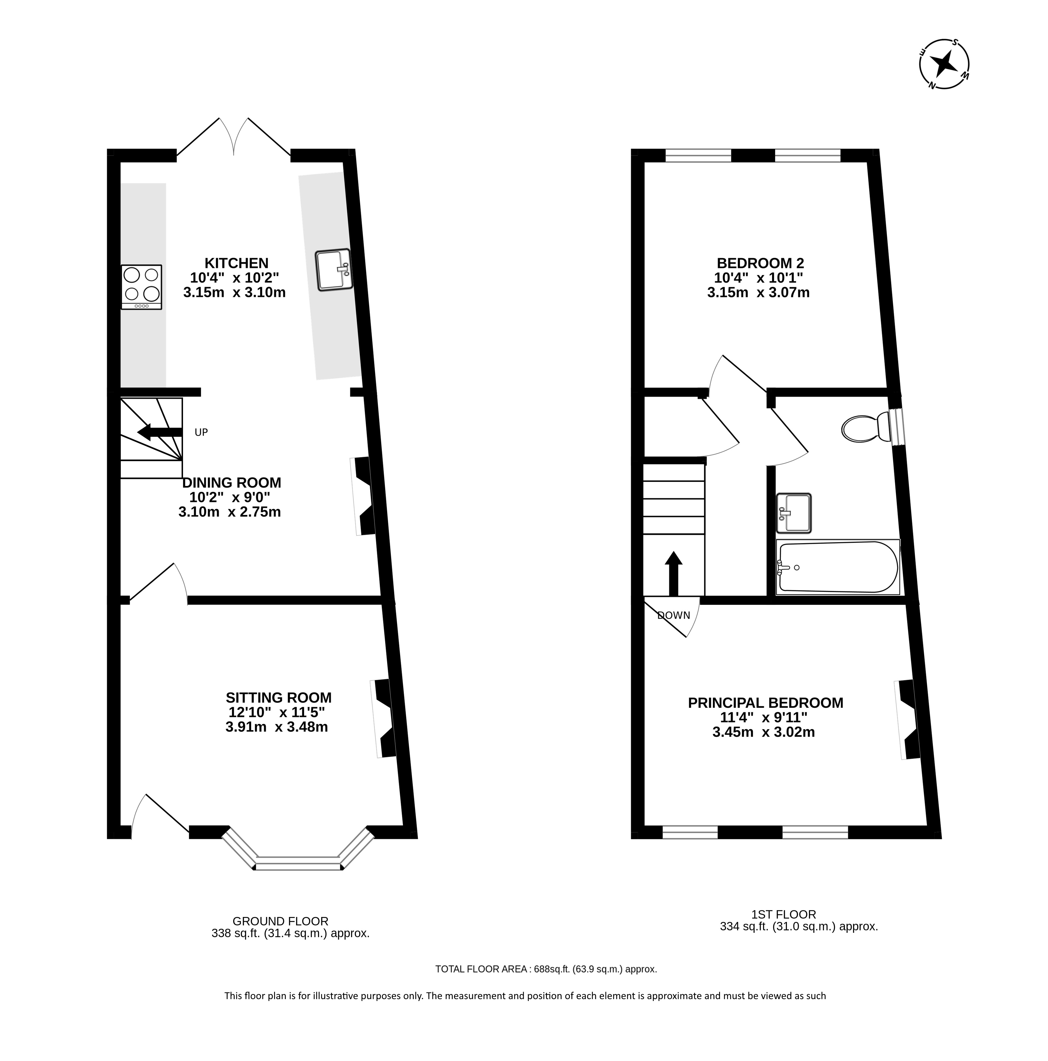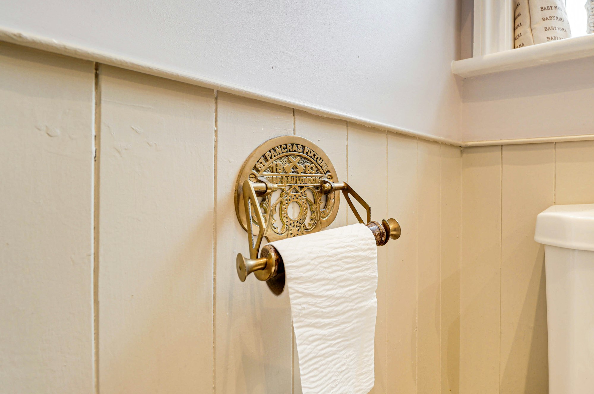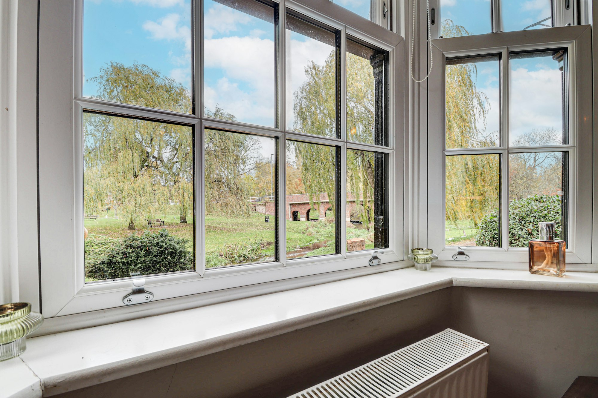 An open staircase rises from the dining area to the first floor, where you will find two well-proportioned bedrooms. The principal bedroom to the front enjoys picturesque views over the stream, framed by elegant sash windows that fill the room with natural light. To the rear, a spacious double bedroom provides a calm and comfortable retreat, while the family bathroom offers a stylish and functional space.