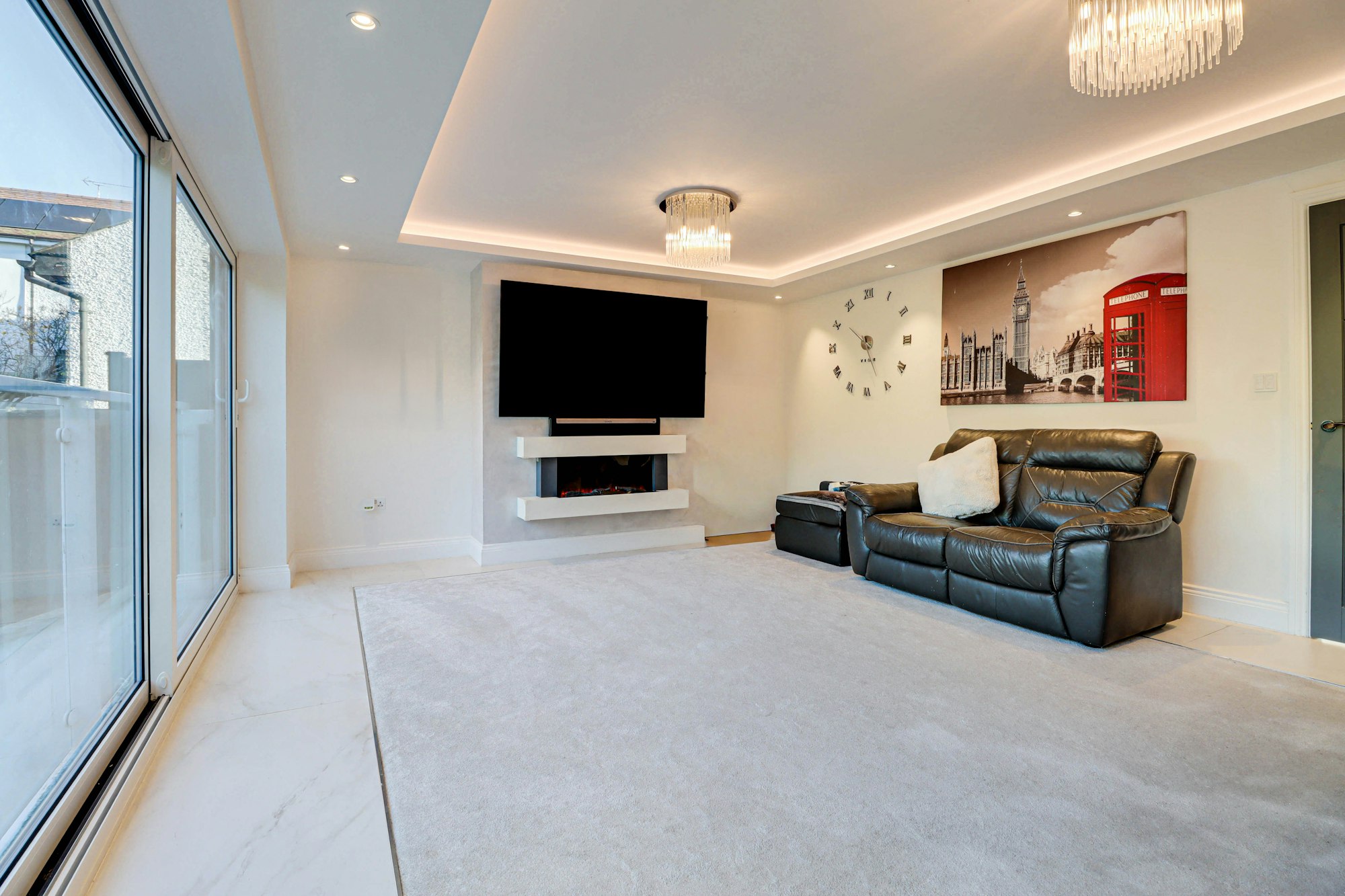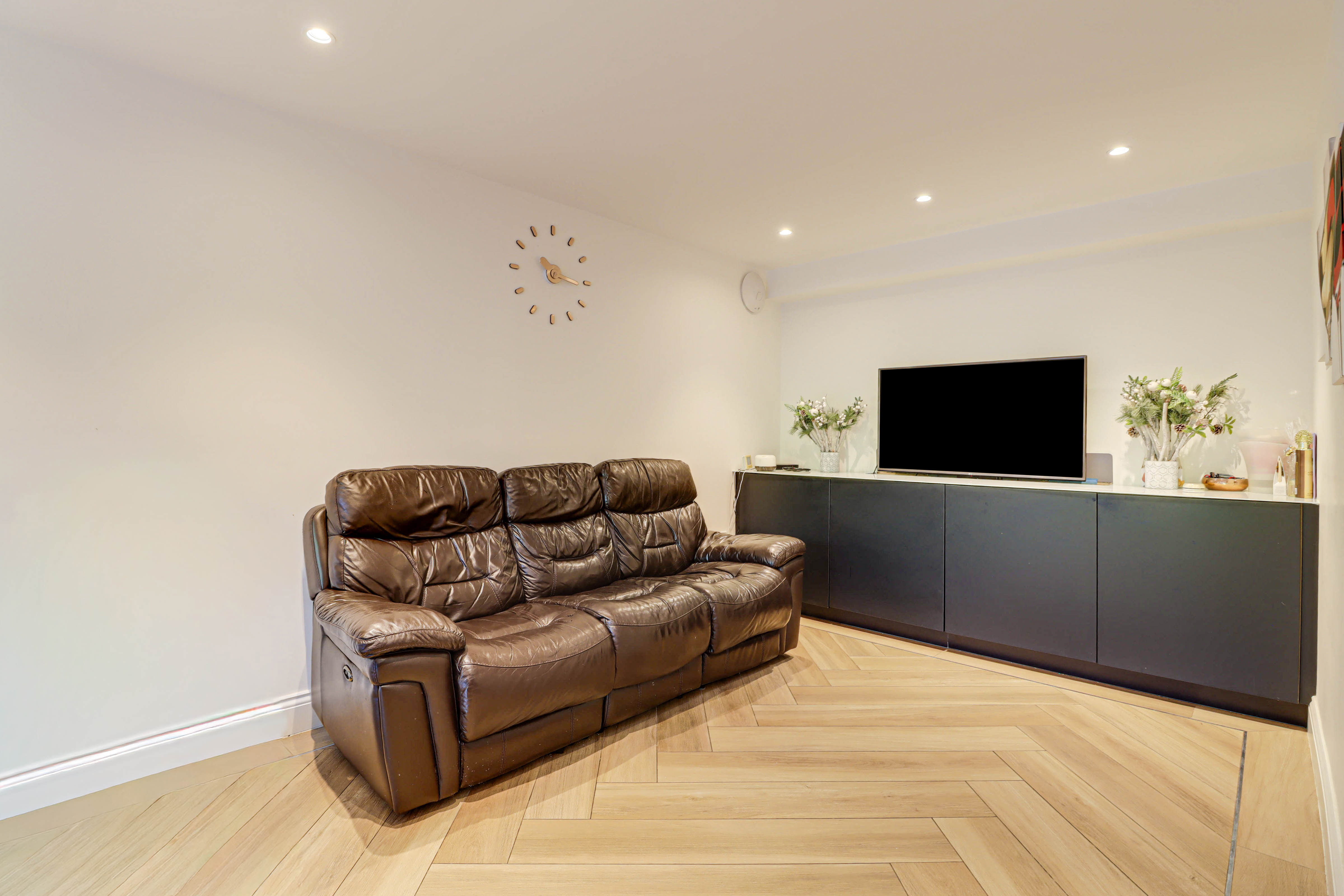 The lower ground floor is the true heart of the home. Here you will find a sleek and contemporary kitchen-dining room boasting a large central island with seating for up to six -ideal for family meals and entertaining. This stunning space also enjoys direct access to the patio and garden through expansive sliding glass doors, seamlessly blending indoor and outdoor living. A second WC is also located on this level for added convenience.