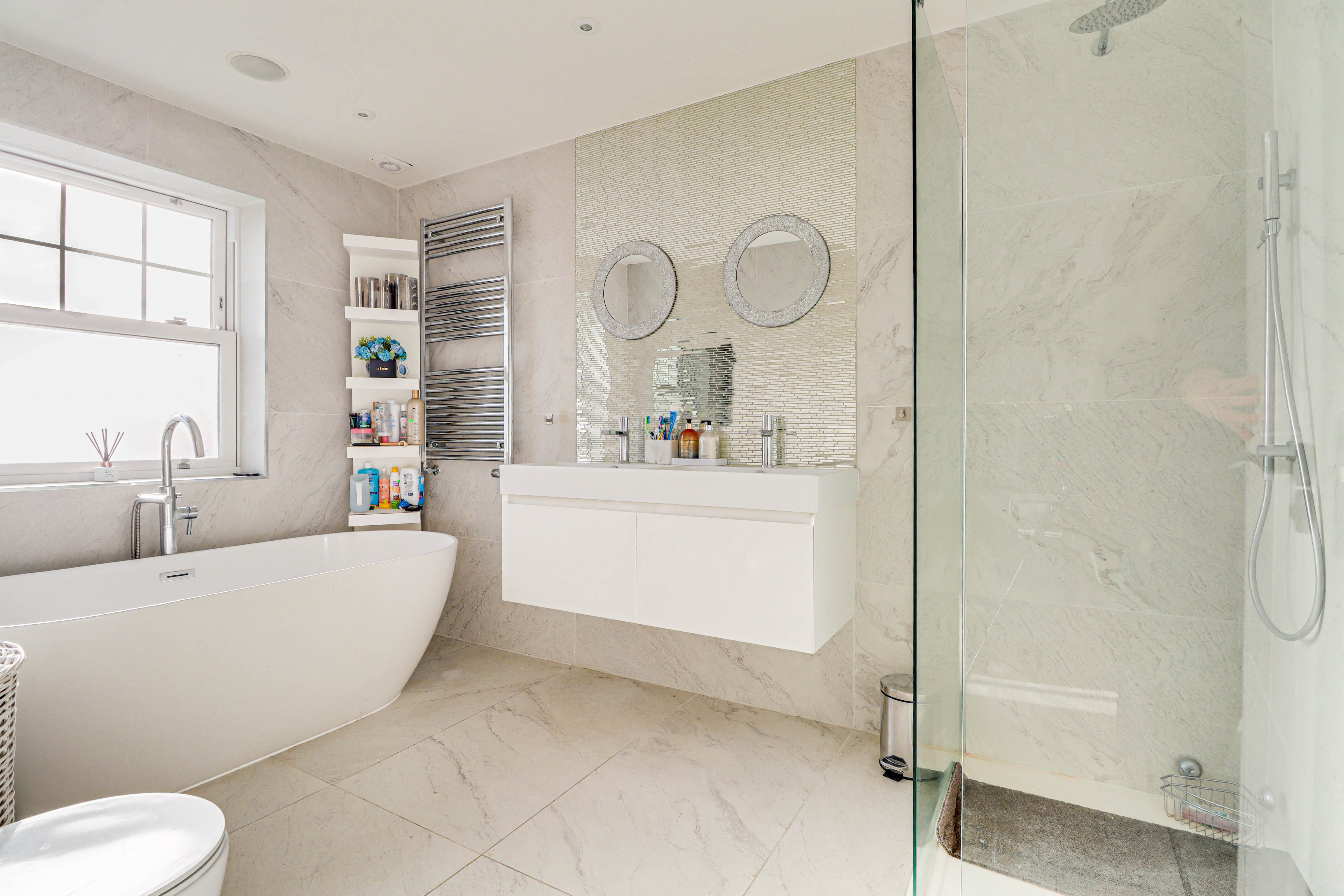 Ascending to the first floor, you will discover two beautifully proportioned bedrooms, each with its own en-suite. The principal bedroom further benefits from a generous walk-in wardrobe with fitted cabinetry, offering exceptional storage.