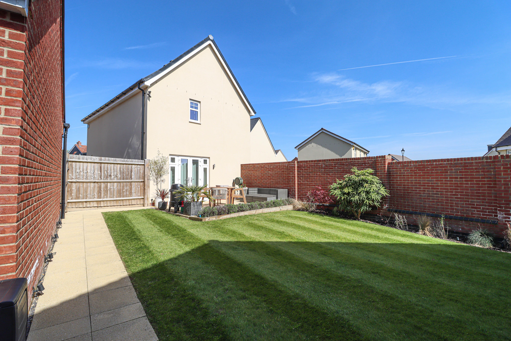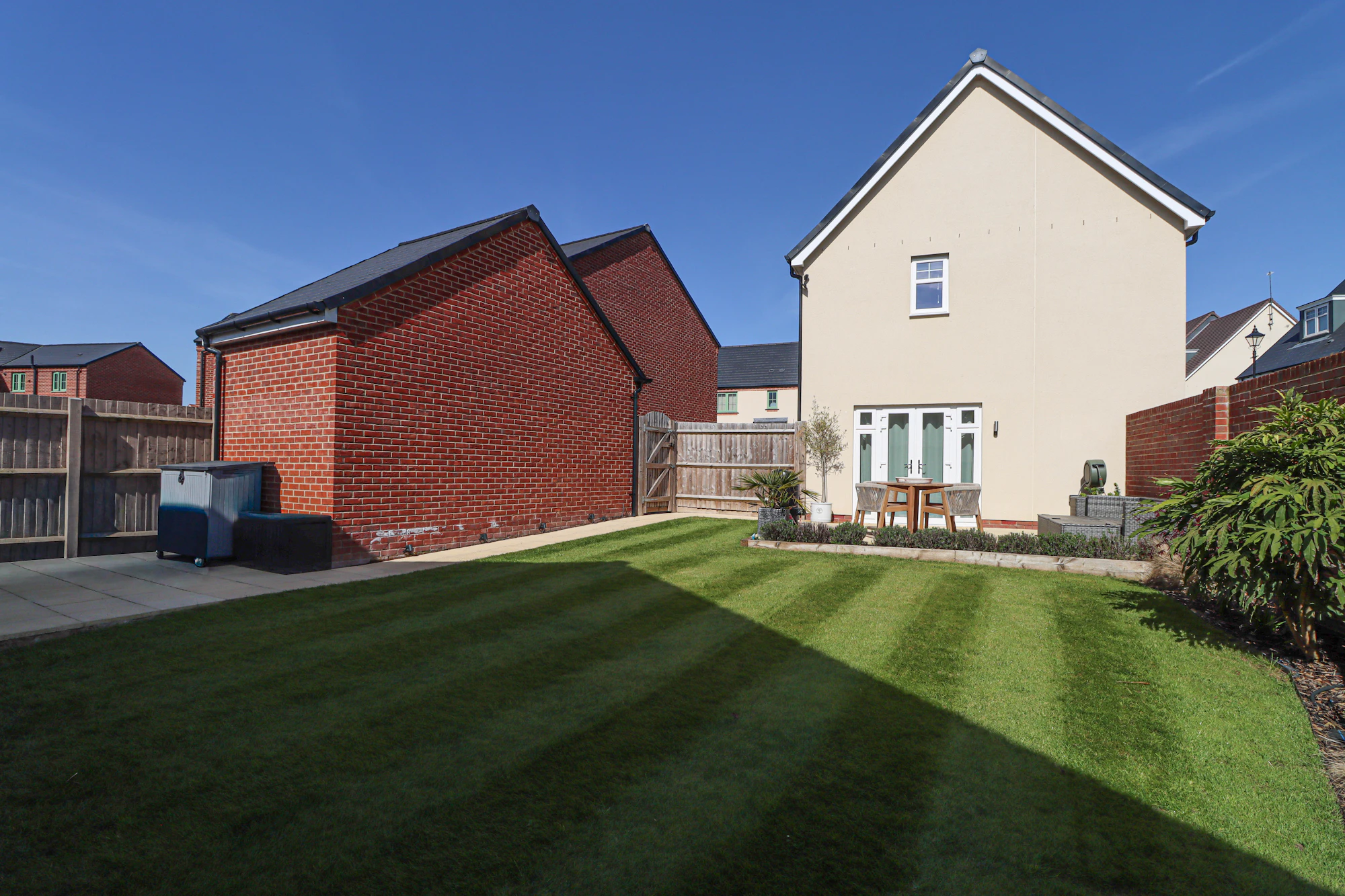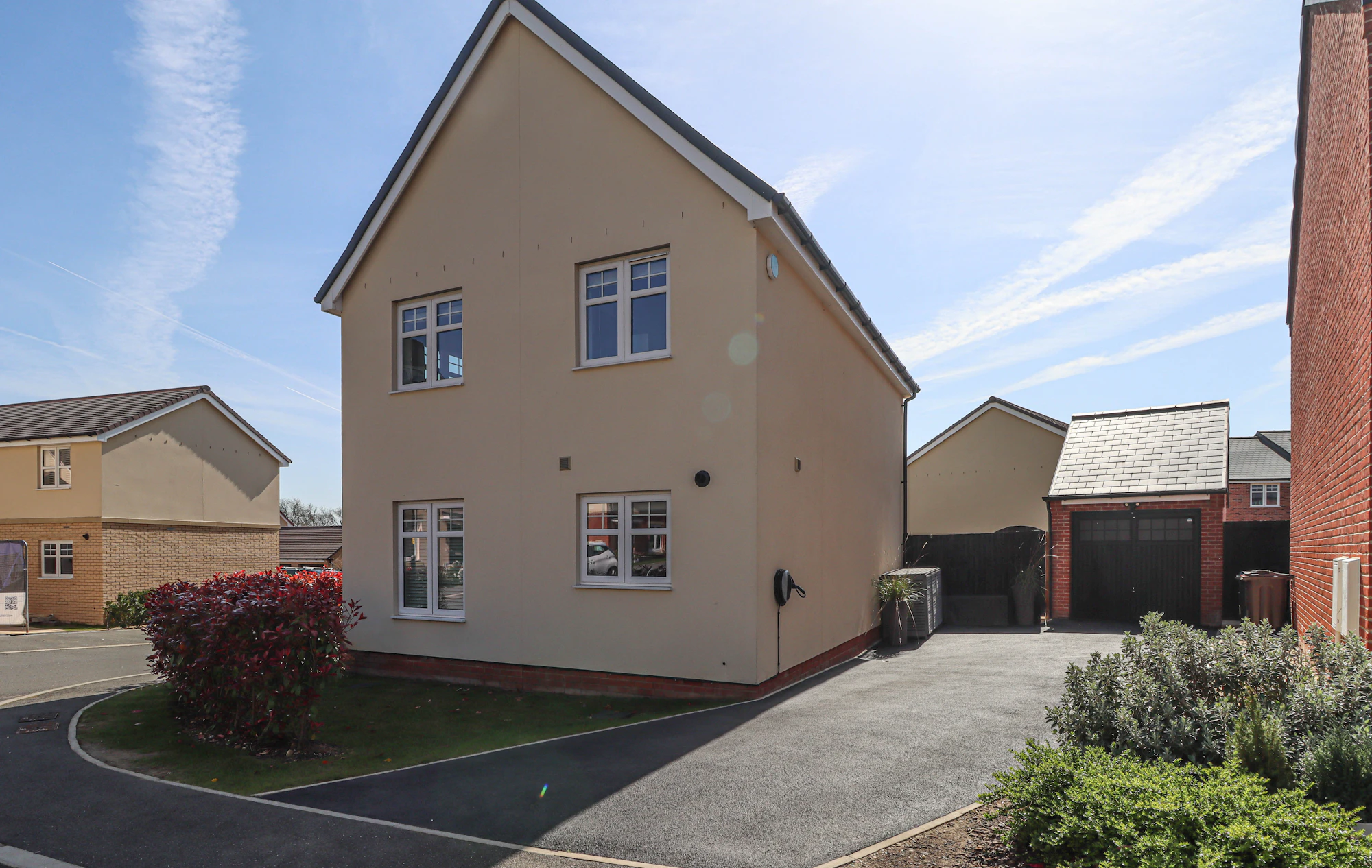 Externally, the property continues to impress. The rear garden is landscaped with paved seating areas and a neat lawn, providing an ideal space for relaxation and entertaining throughout the year. To the side, a driveway offers parking for up to three vehicles and leads to a detached single garage with electric door, ensuring excellent storage and practicality.