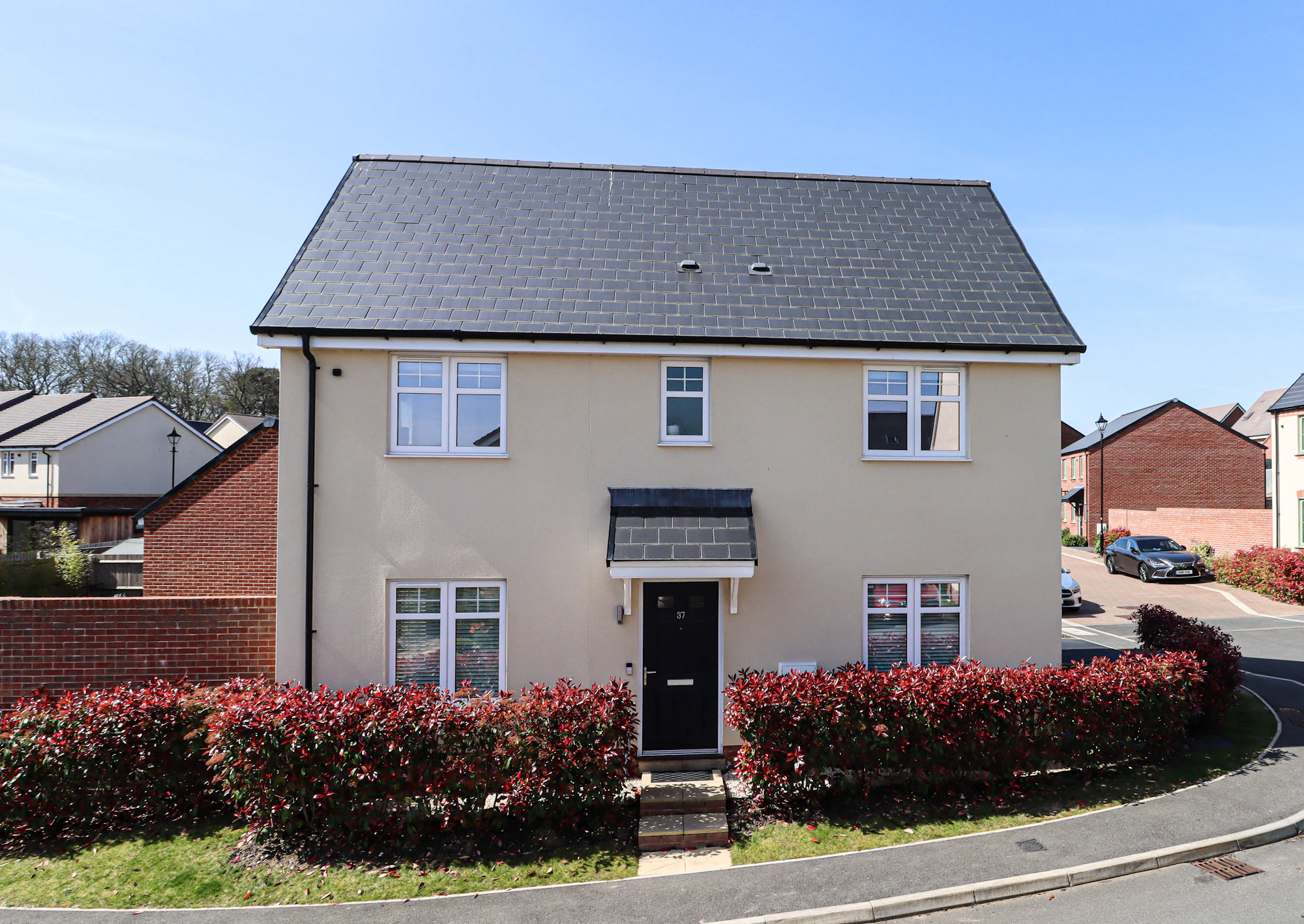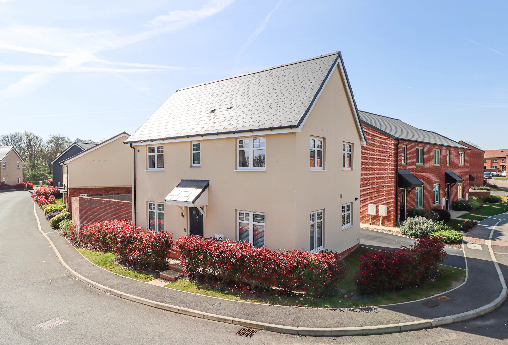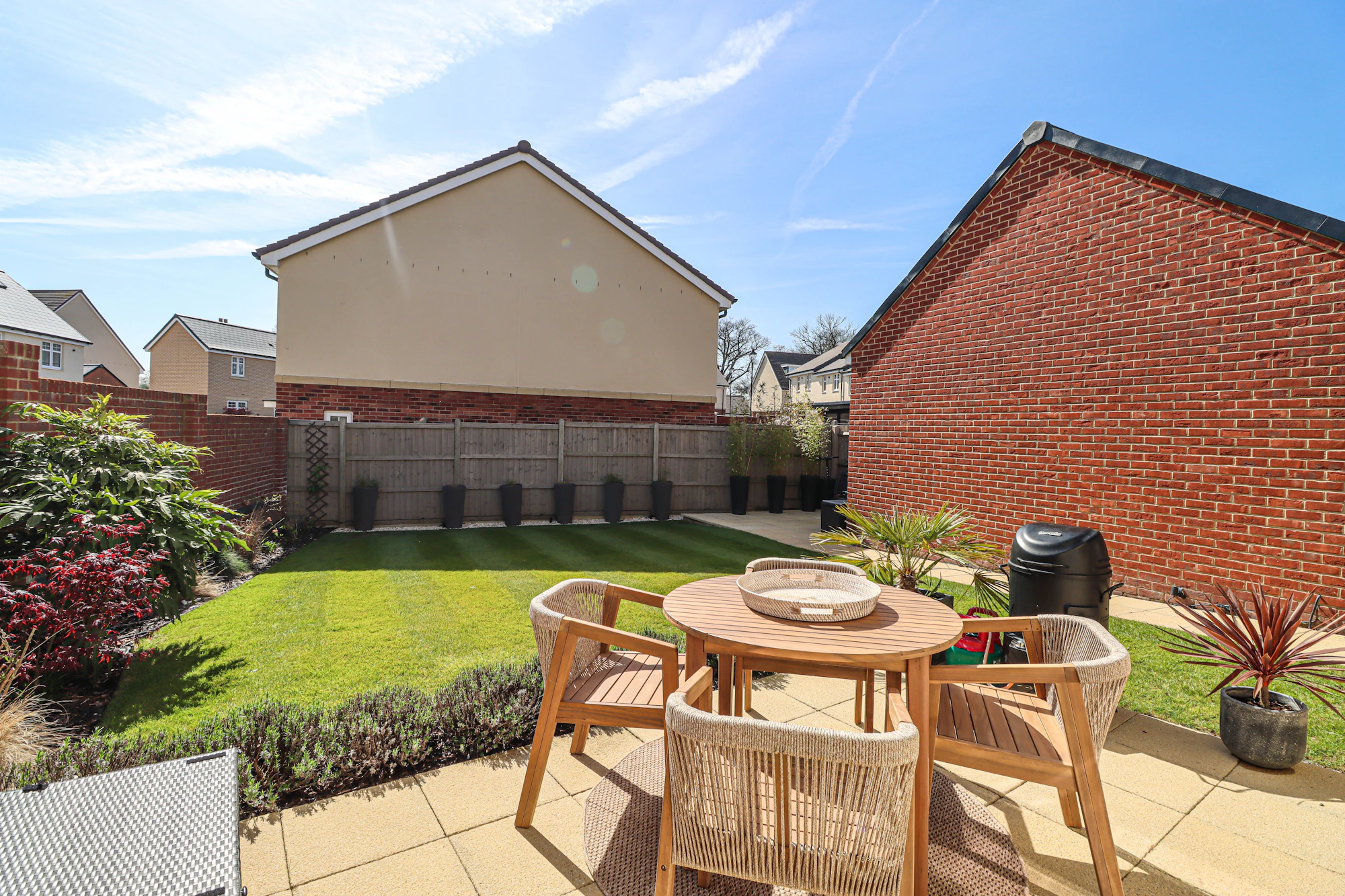 Externally, the property continues to impress. The rear garden is landscaped with paved seating areas and a neat lawn, providing an ideal space for relaxation and entertaining throughout the year. To the side, a driveway offers parking for up to three vehicles and leads to a detached single garage with electric door, ensuring excellent storage and practicality.