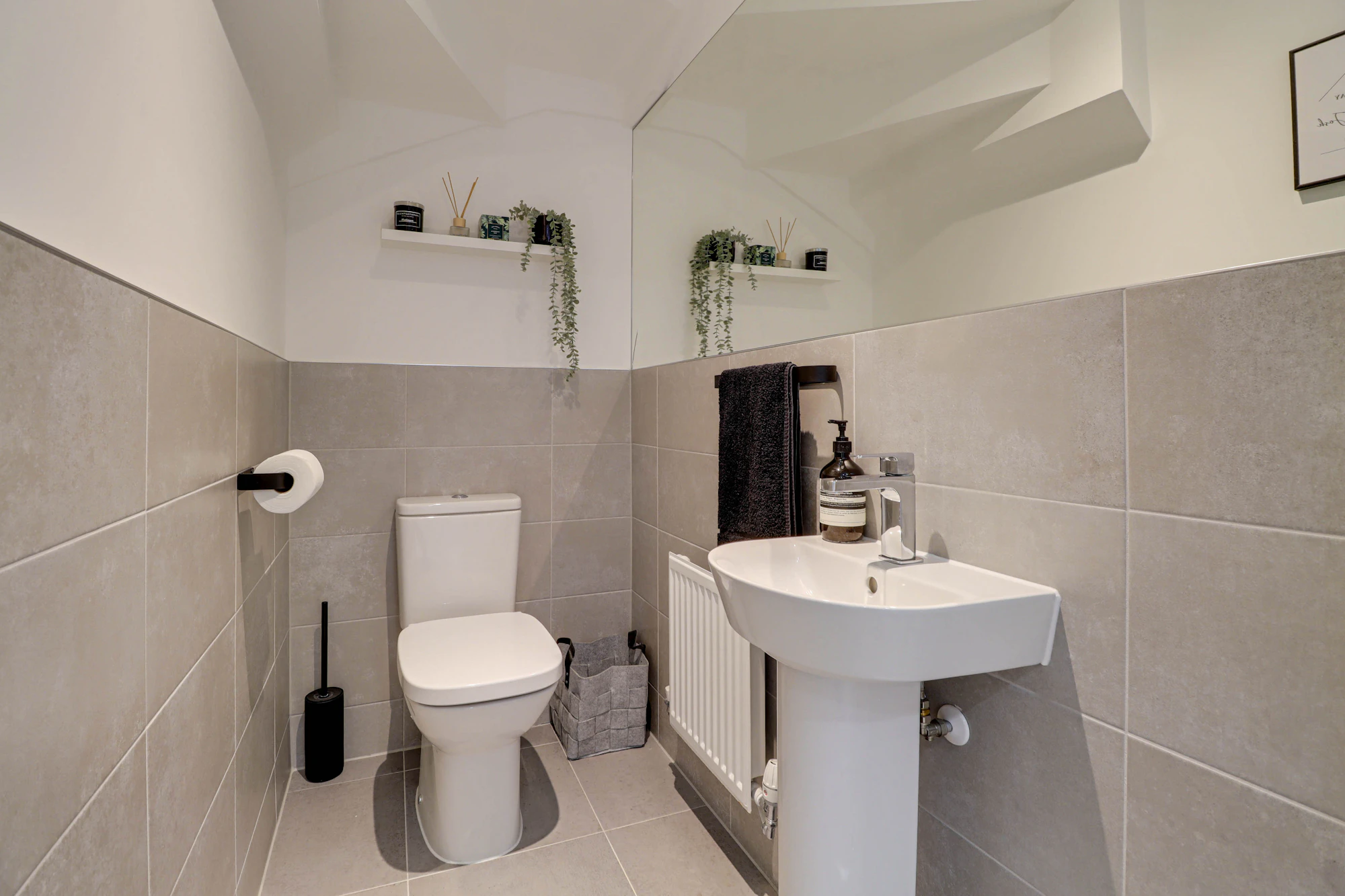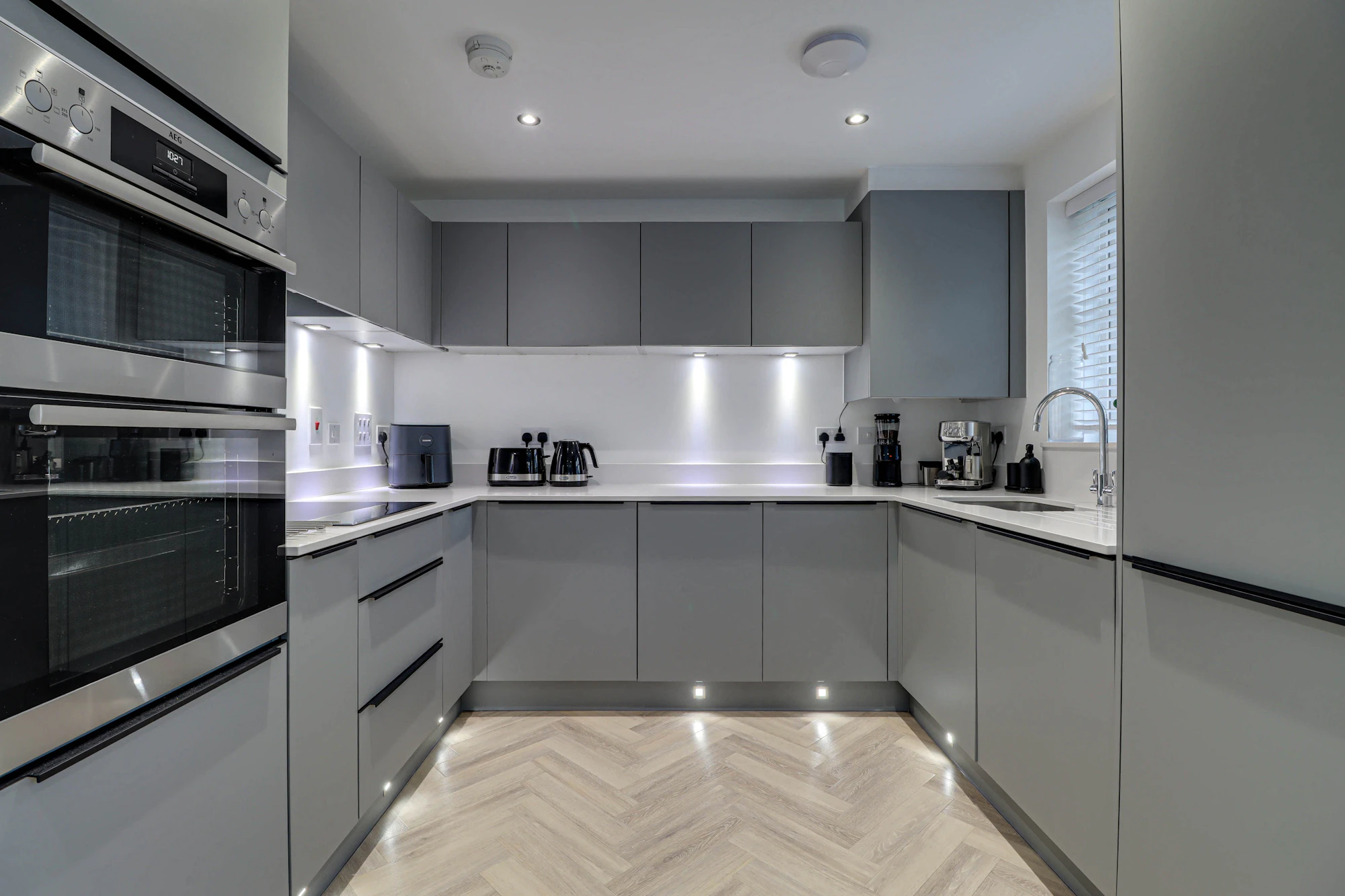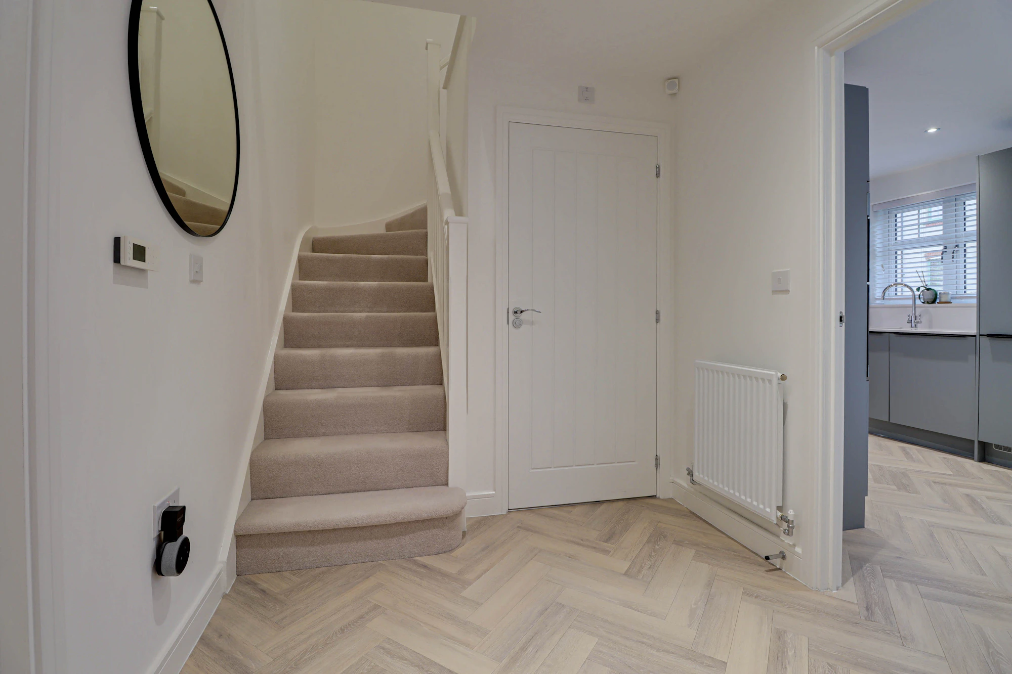 The welcoming entrance hall sits at the centre of the home, creating a balanced and practical layout. To one side there is a bright and elegant living room featuring glazed double doors that open directly onto the garden, allowing natural light to flood the space. The dual-aspect kitchen is equally impressive with Silestone worktops, AEG induction hub, double ovens and integrated washer/dryer. The kitchen also offers ample space for a dining table and creating a sociable hub for everyday life and entertaining. A convenient ground floor WC completes the accommodation on this level.