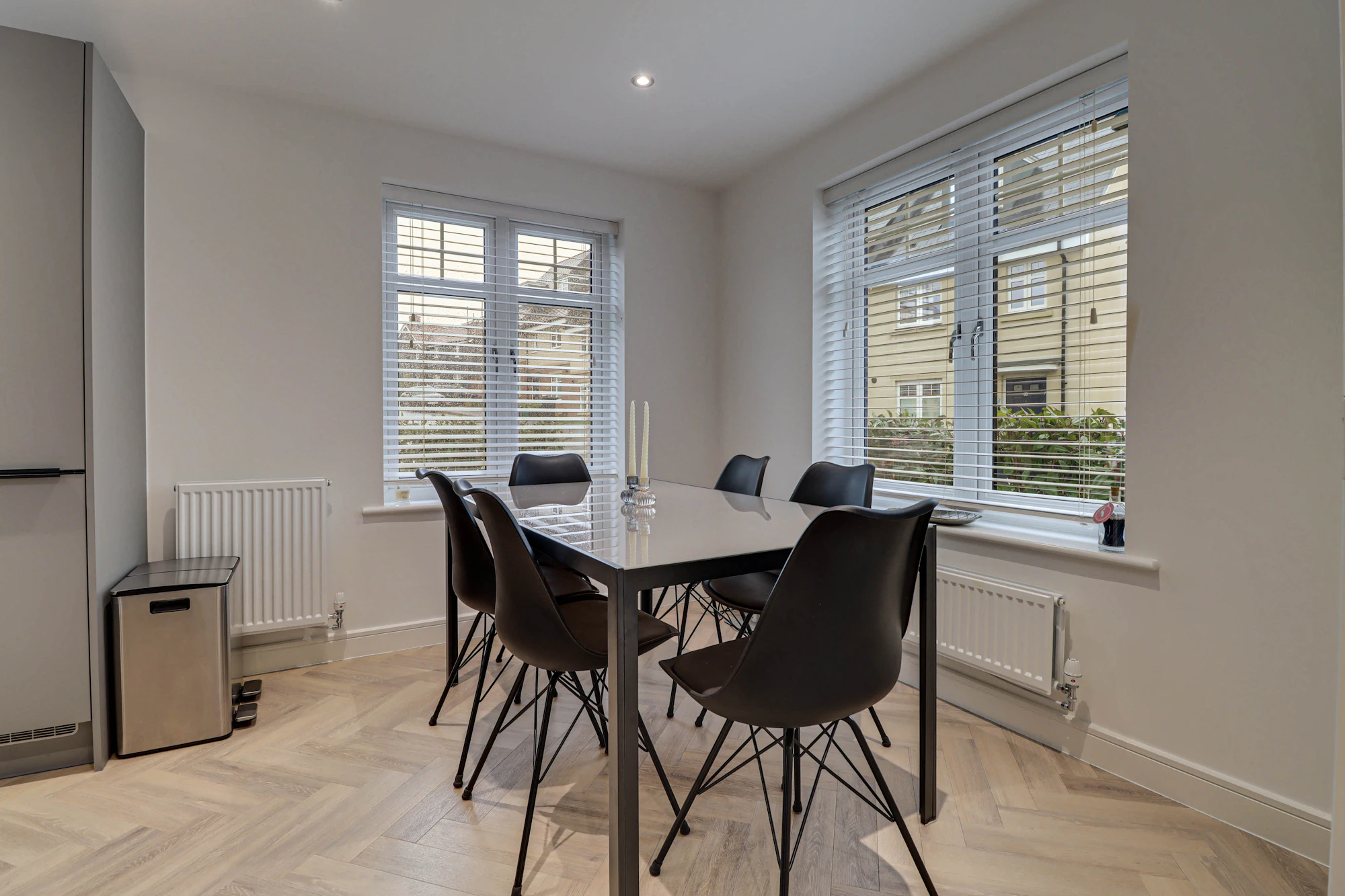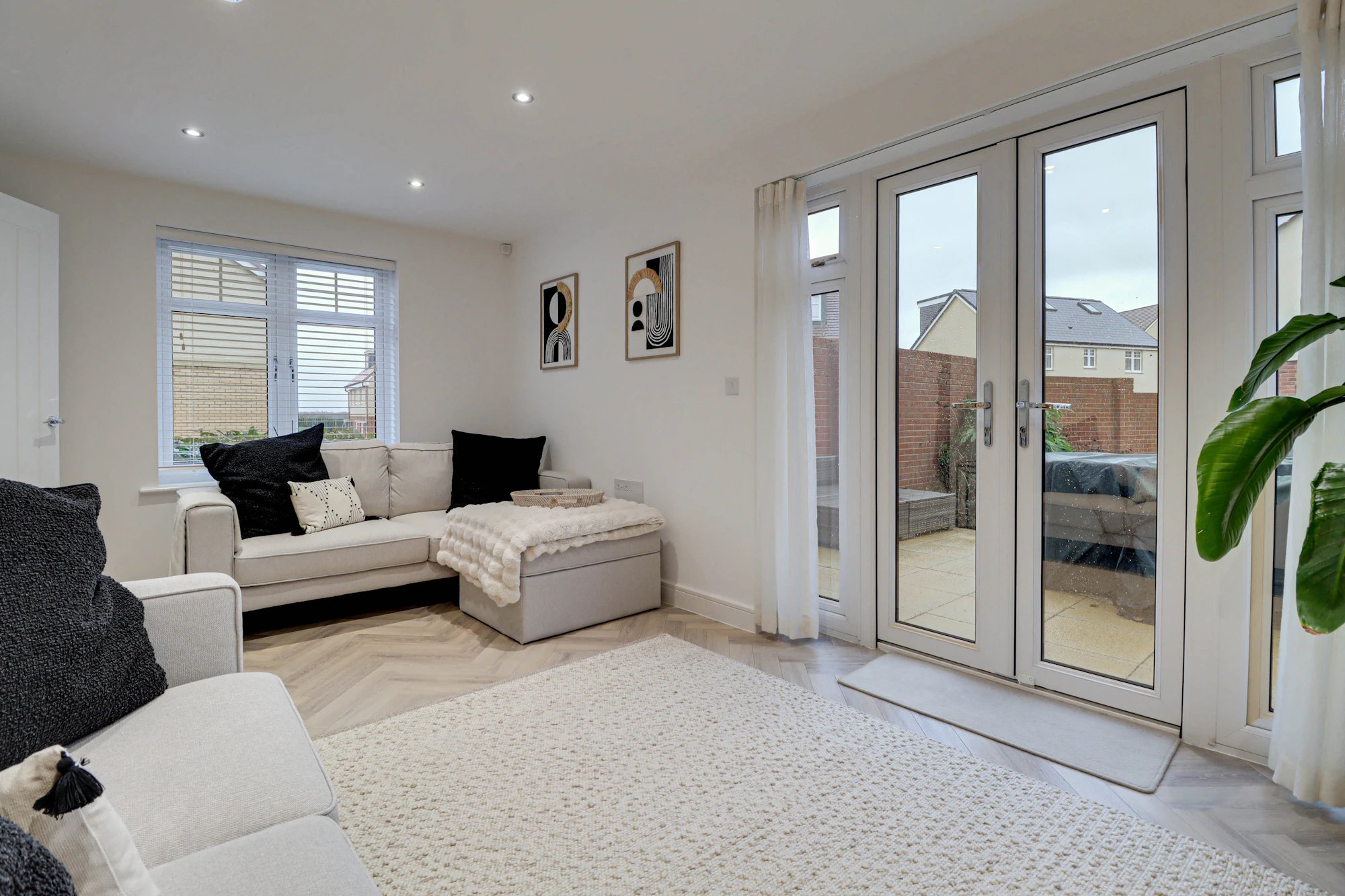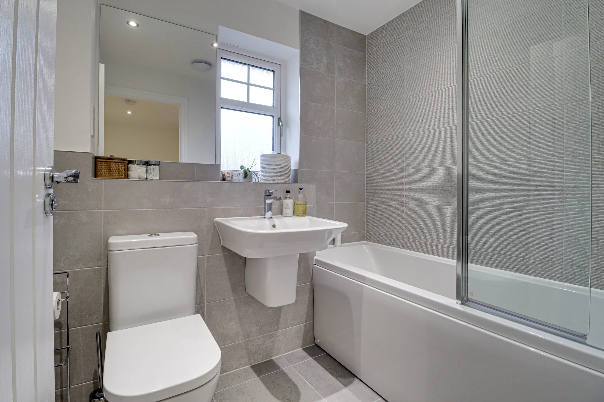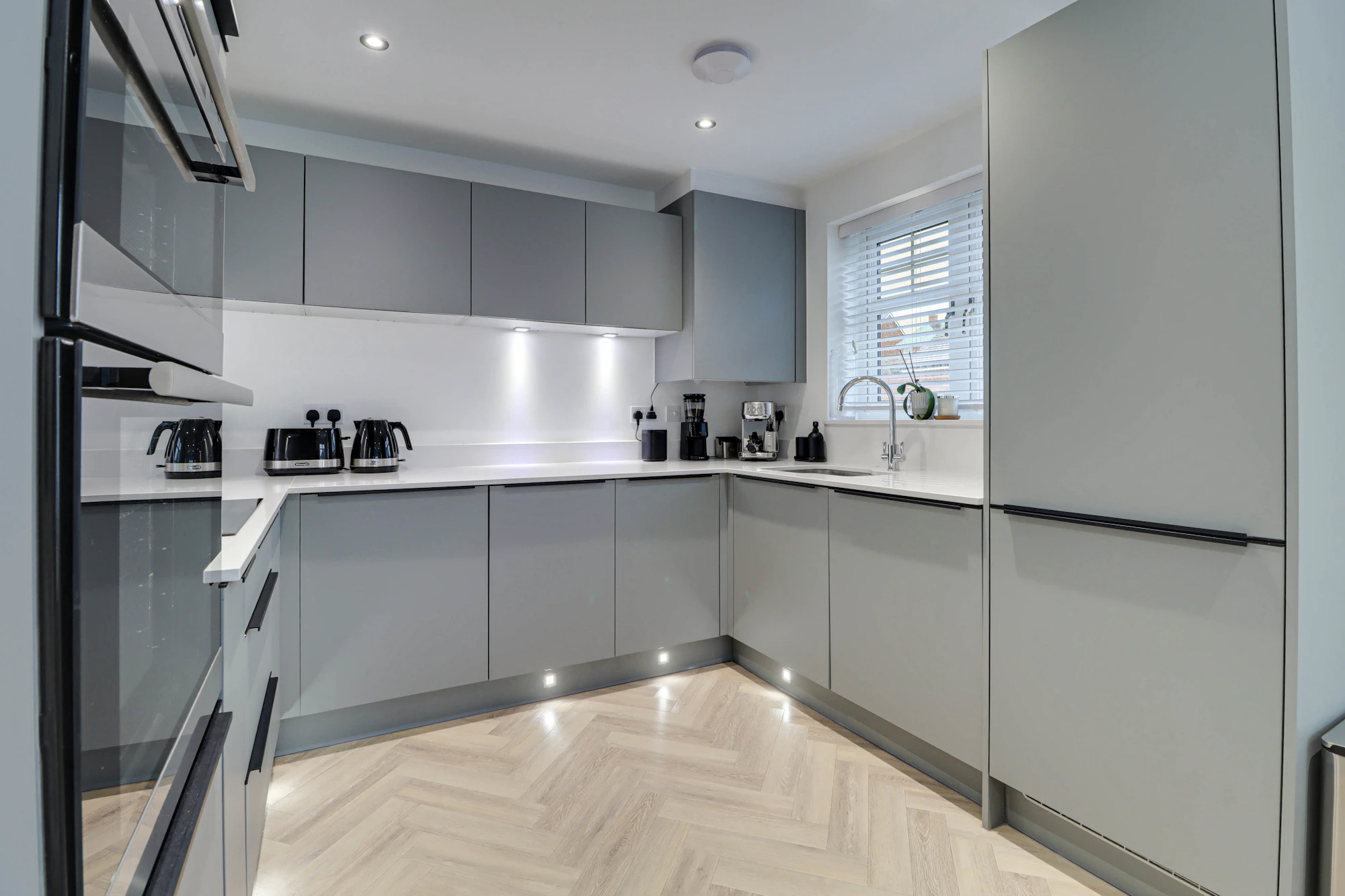 The welcoming entrance hall sits at the centre of the home, creating a balanced and practical layout. To one side there is a bright and elegant living room featuring glazed double doors that open directly onto the garden, allowing natural light to flood the space. The dual-aspect kitchen is equally impressive with Silestone worktops, AEG induction hub, double ovens and integrated washer/dryer. The kitchen also offers ample space for a dining table and creating a sociable hub for everyday life and entertaining. A convenient ground floor WC completes the accommodation on this level.