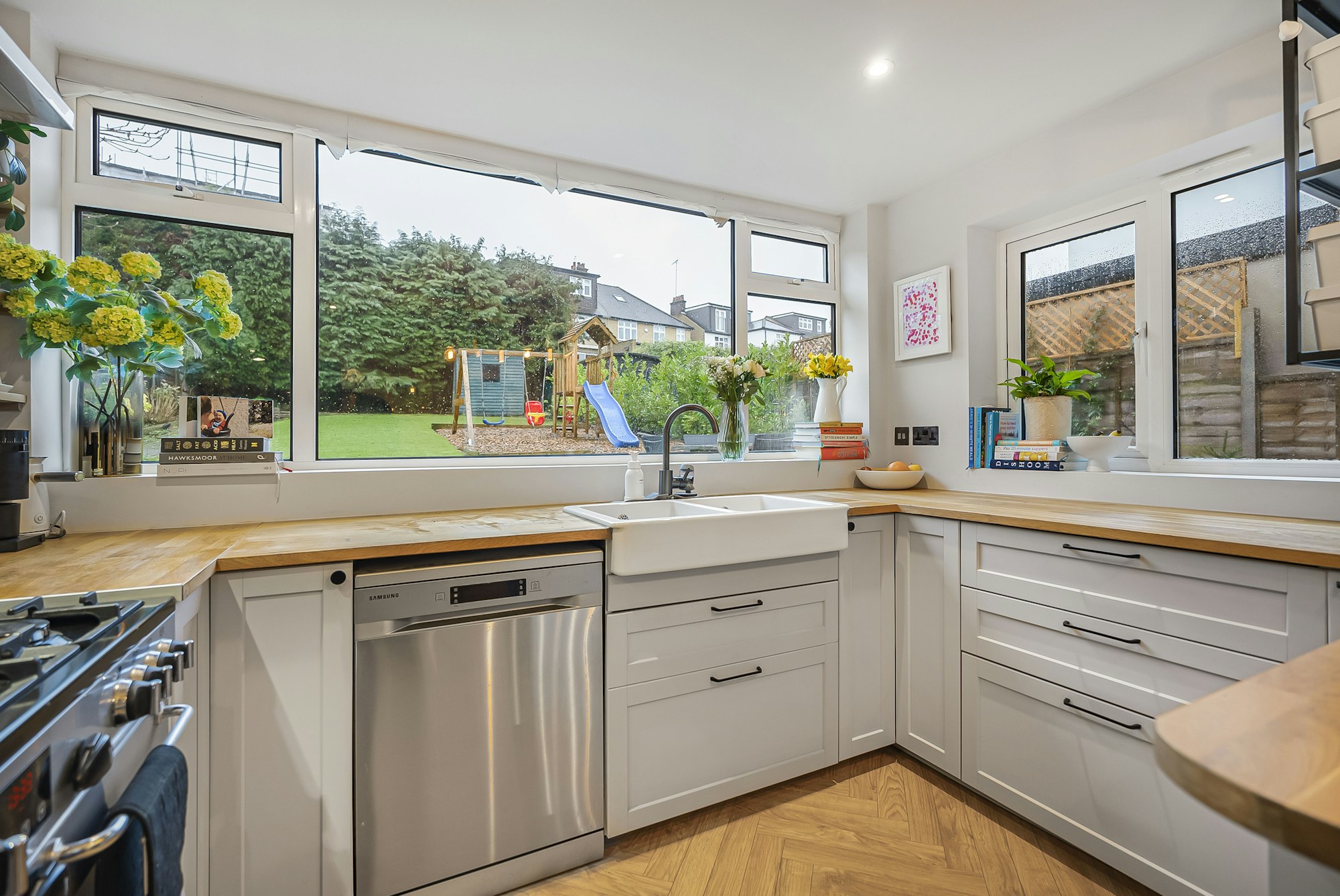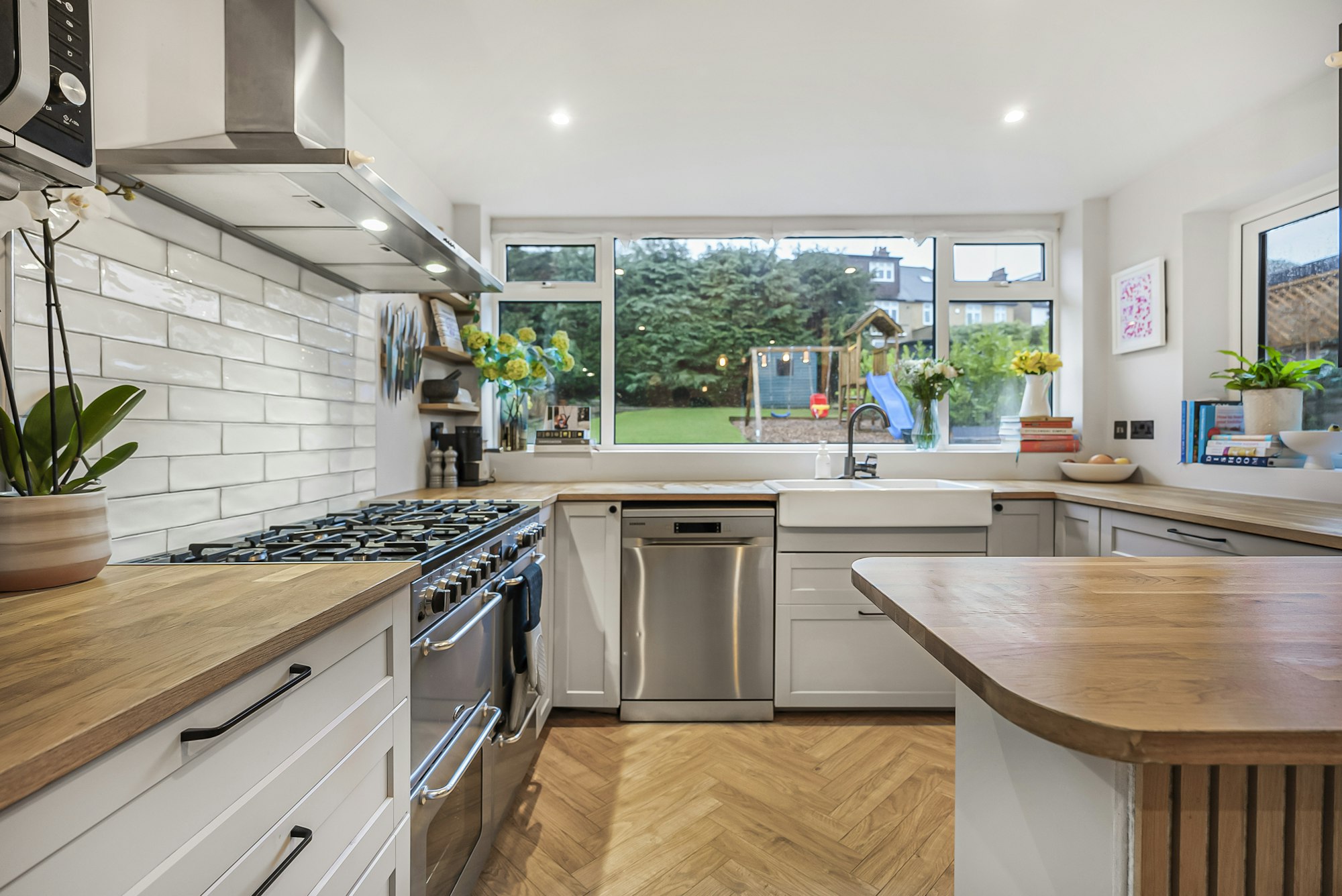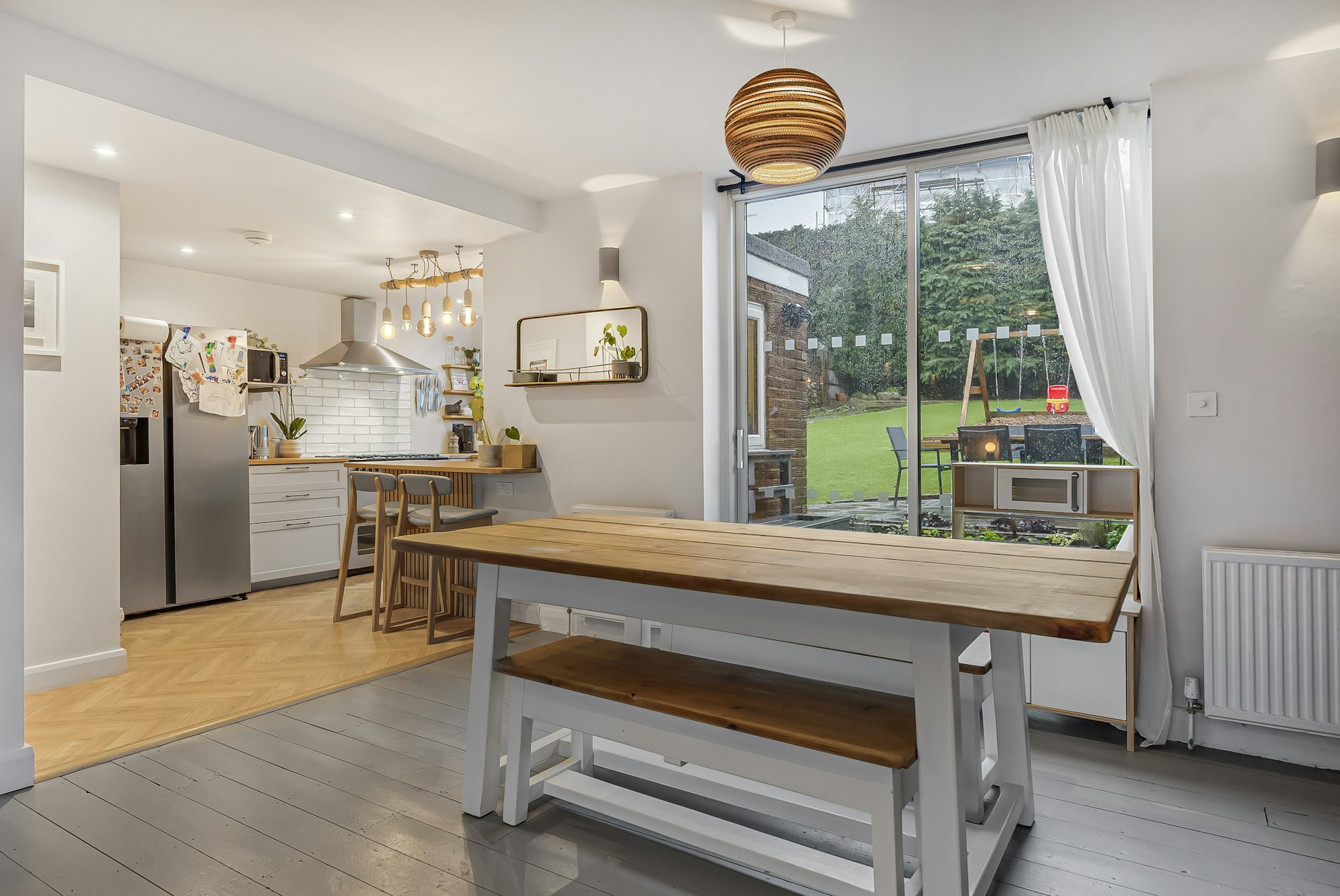 On the ground floor, a smart entrance hall leads past a useful utility room and into the newly fitted kitchen, finished with stylish herringbone flooring. This flows seamlessly into the impressive dual-aspect open-plan reception room, offering generous space for both living and dining. A bay window to the front fills the room with natural light, while glazed doors open directly onto the rear garden, creating an excellent sense of indoor-outdoor living.