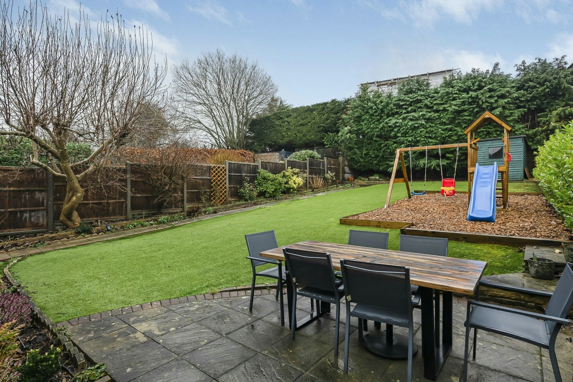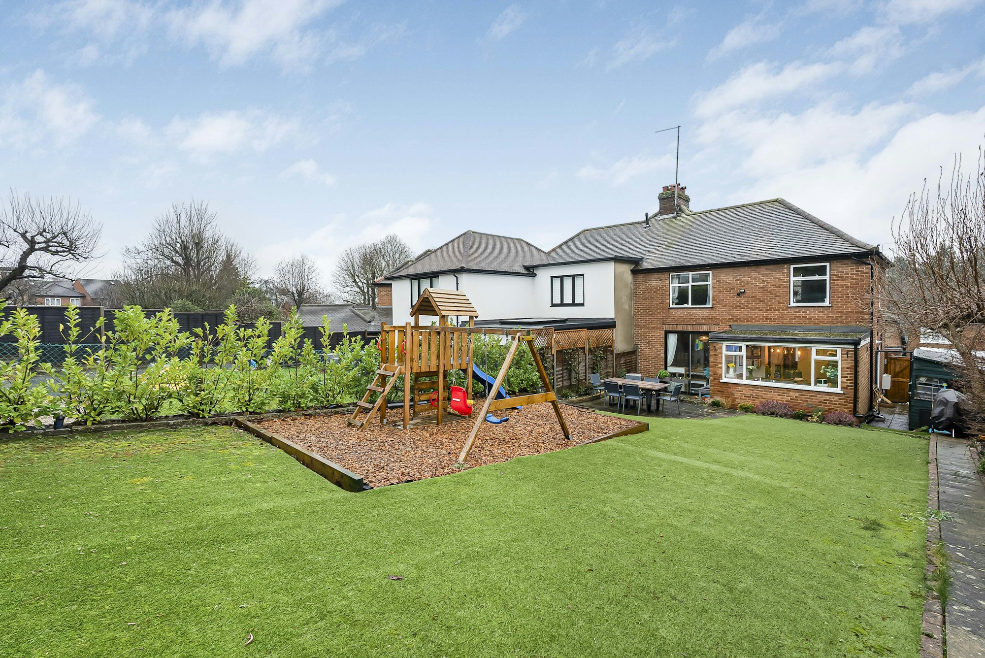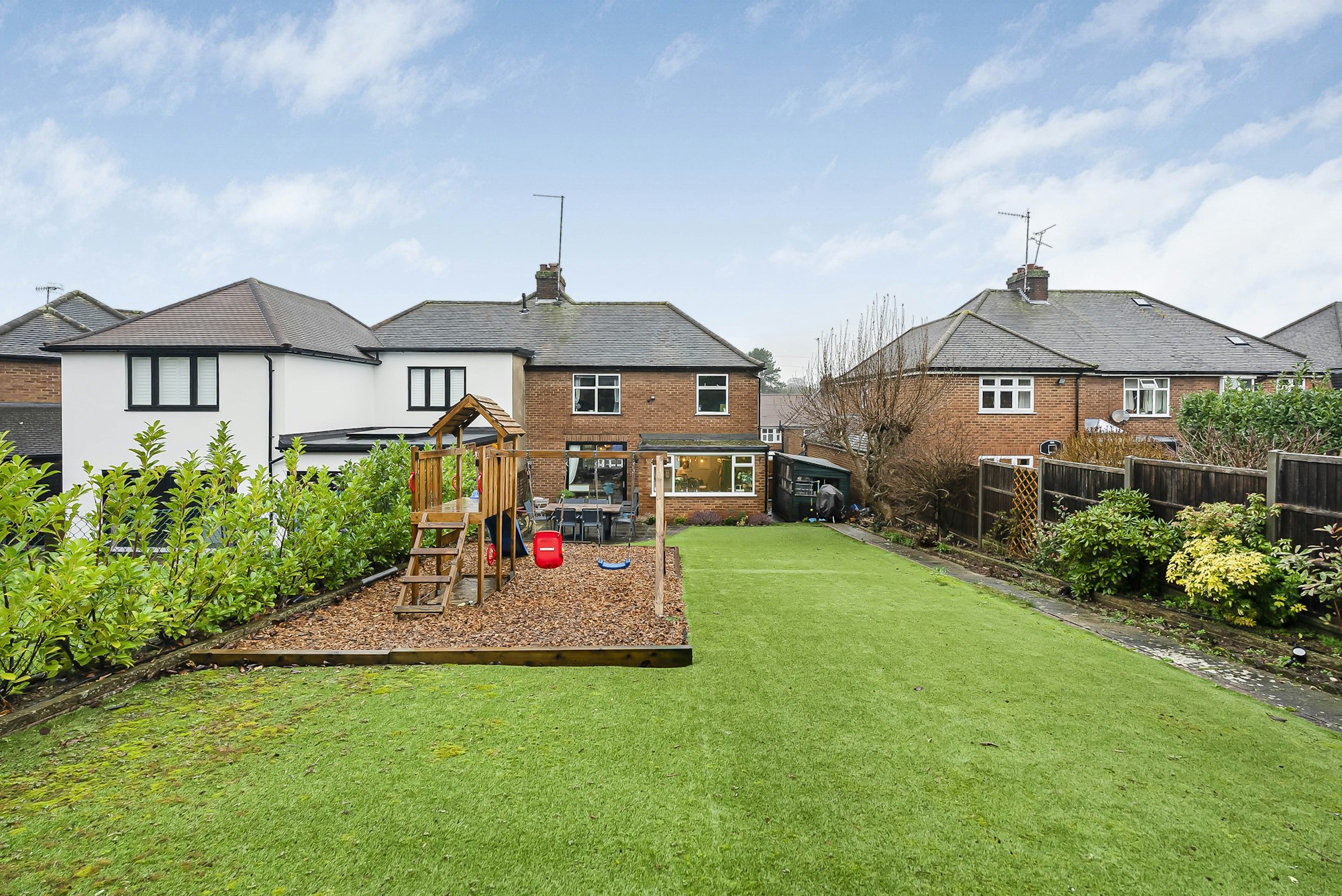 To the rear is an impressive south-facing garden, laid with low-maintenance artificial turf and ideal for both relaxation and entertaining with a superb large rear hedge providing privacy and screening. The generous plot size offers exciting potential for extension, subject to the usual consents without compromising outdoor space, with plenty of local precedent for rear, side or loft extensions, allowing a purchaser to further enhance and tailor the home to their needs.