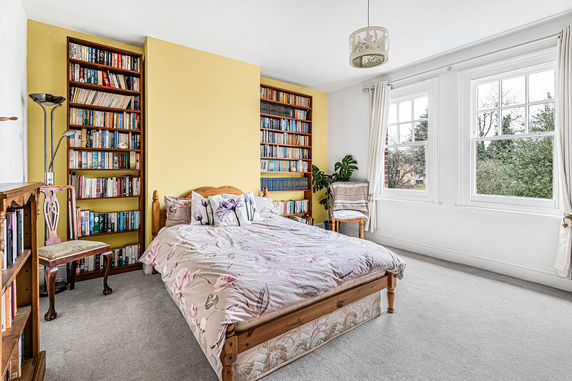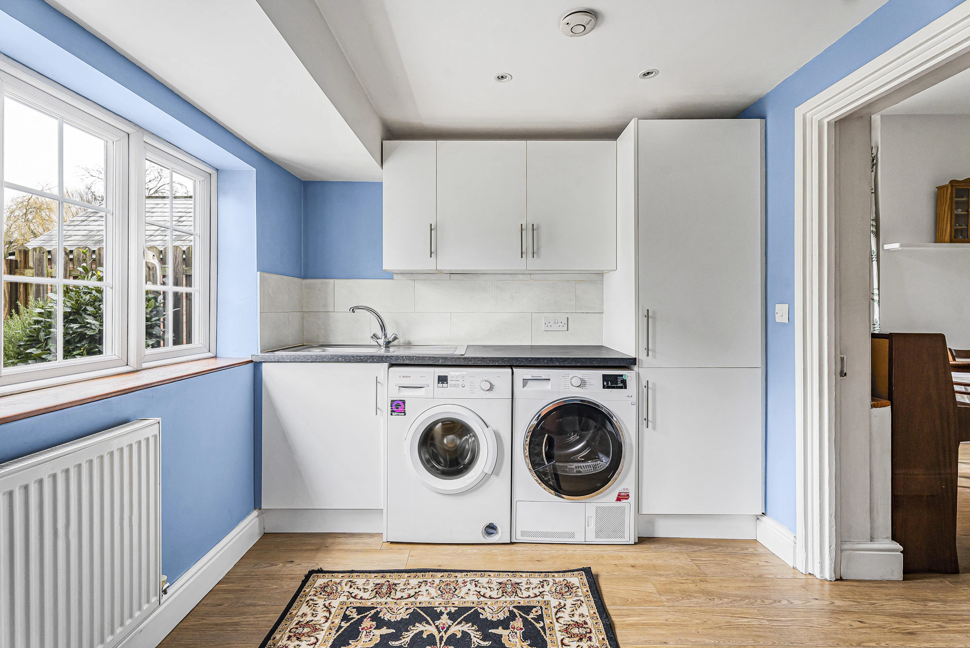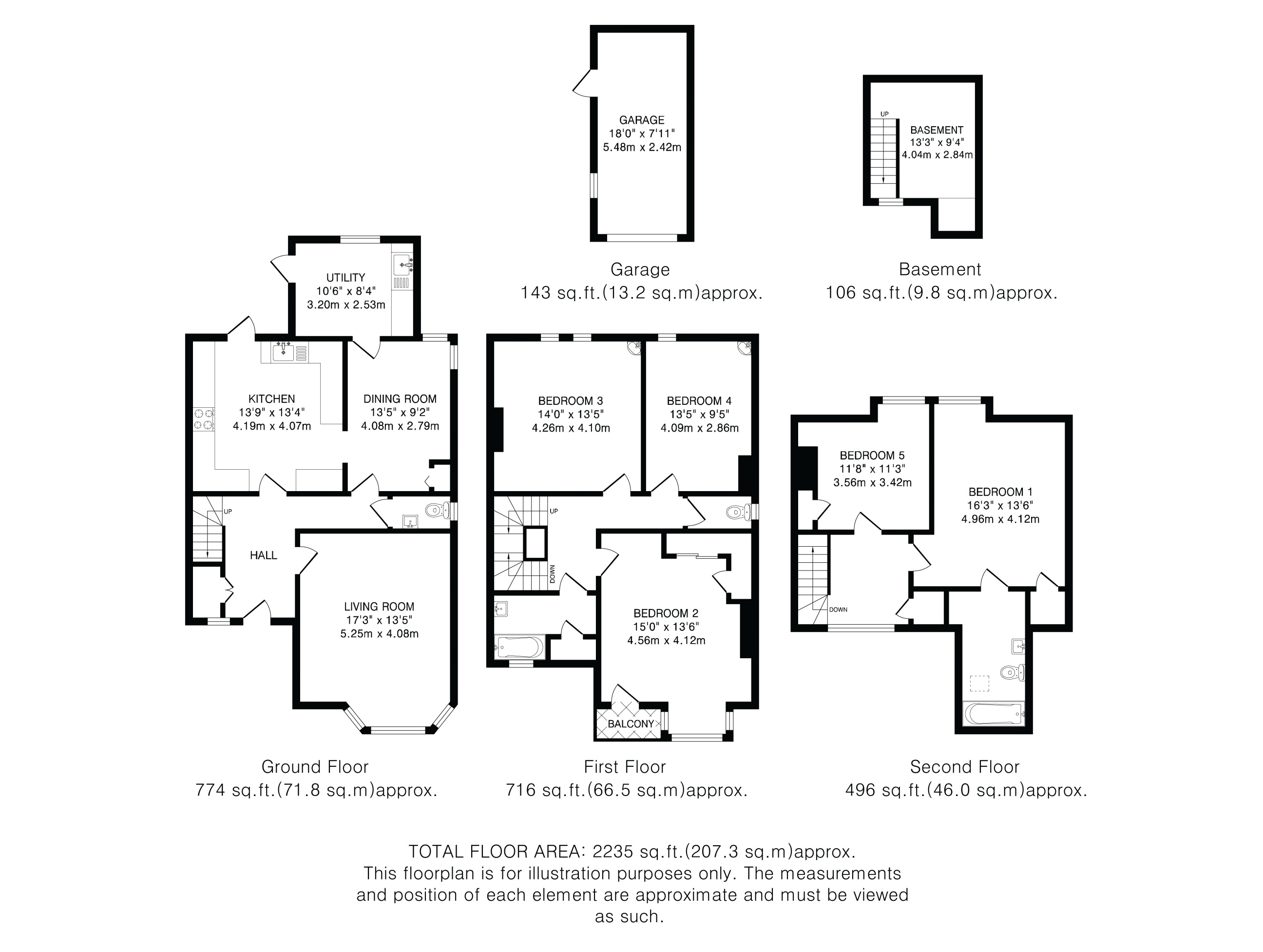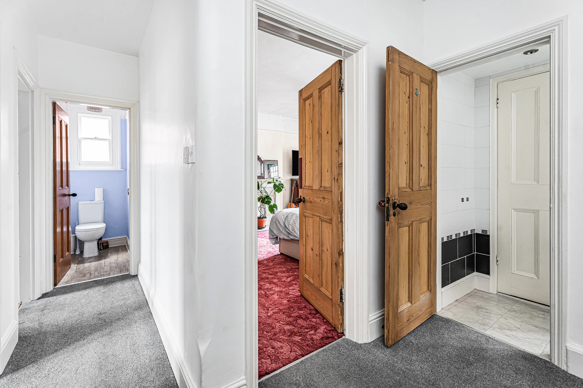 The first-floor hosts three generous double bedrooms, including an impressive principal bedroom with access to a balcony, alongside a family bathroom with white three-piece suite. The second floor offers two further bedrooms and an additional bathroom, providing flexible accommodation ideal for growing families, guests, or home working.