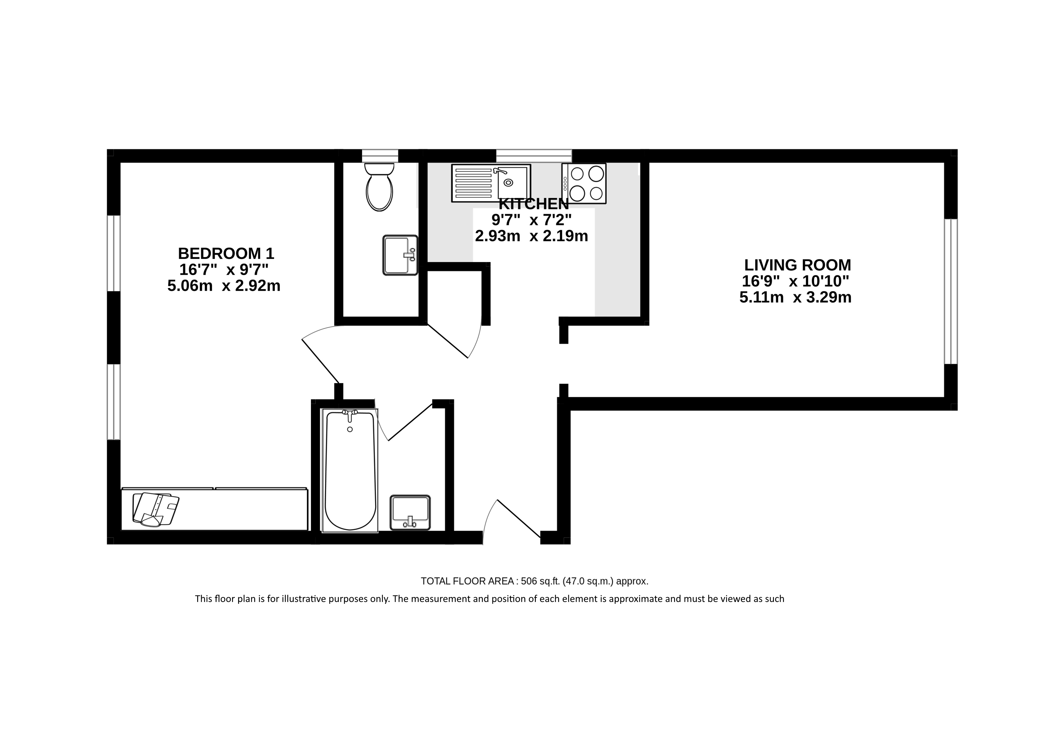 The bright and spacious living room offers ample space for both relaxation and dining, while the separate fitted kitchen is thoughtfully arranged to maximise storage and workspace. The generous double bedroom features ample build in storage space, complemented by a well-appointed bathroom with white three-piece suite.