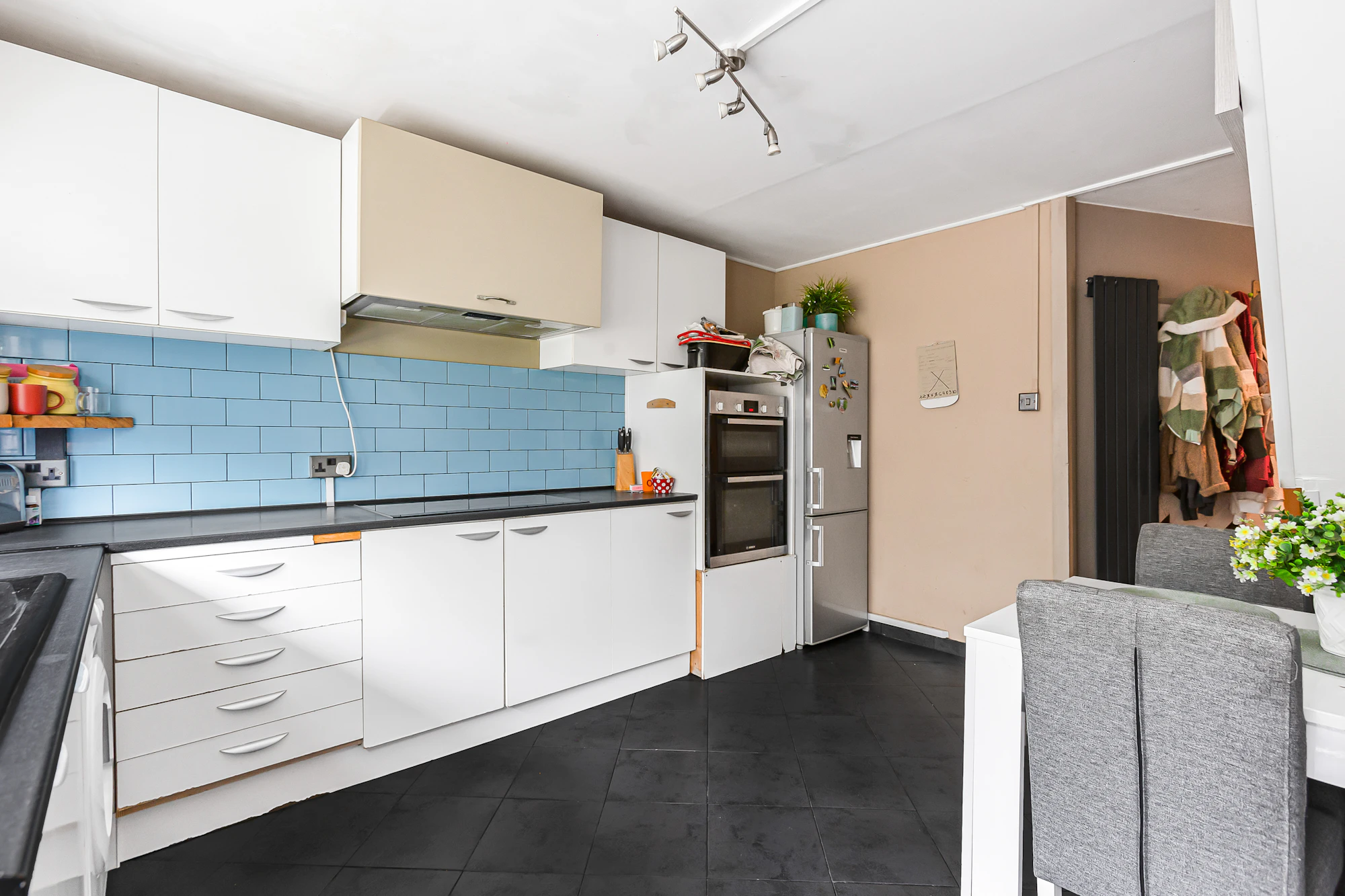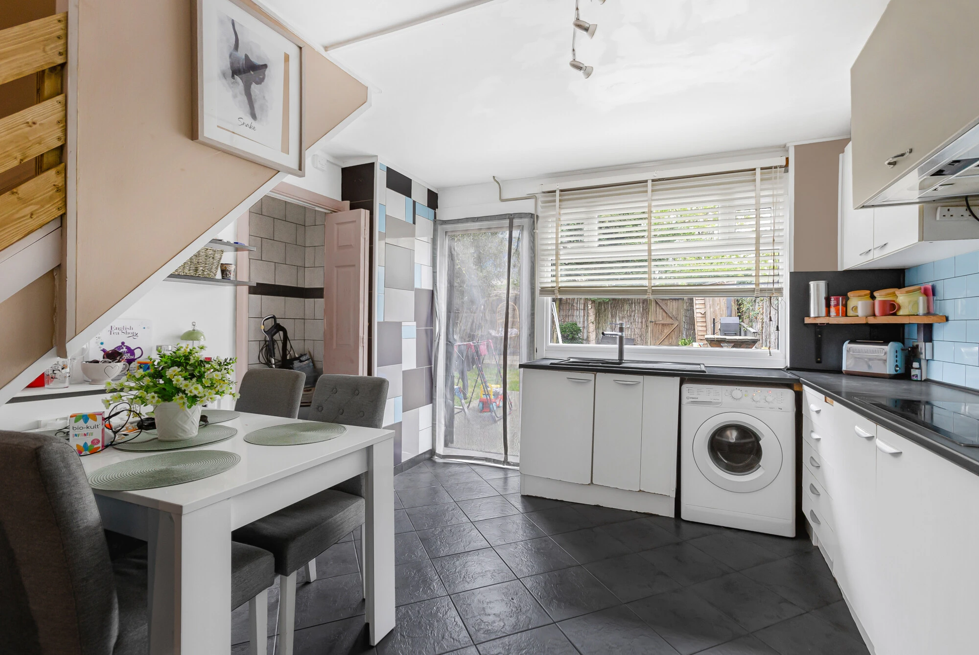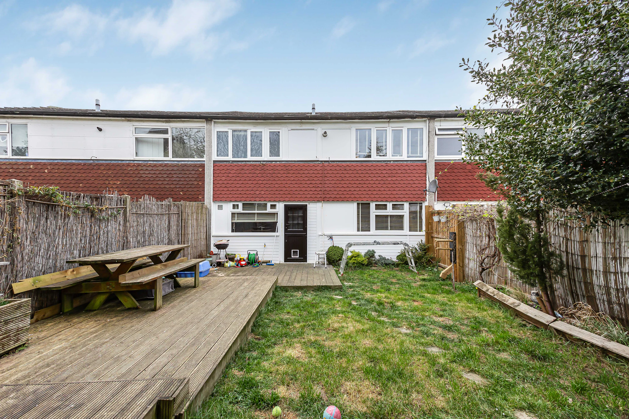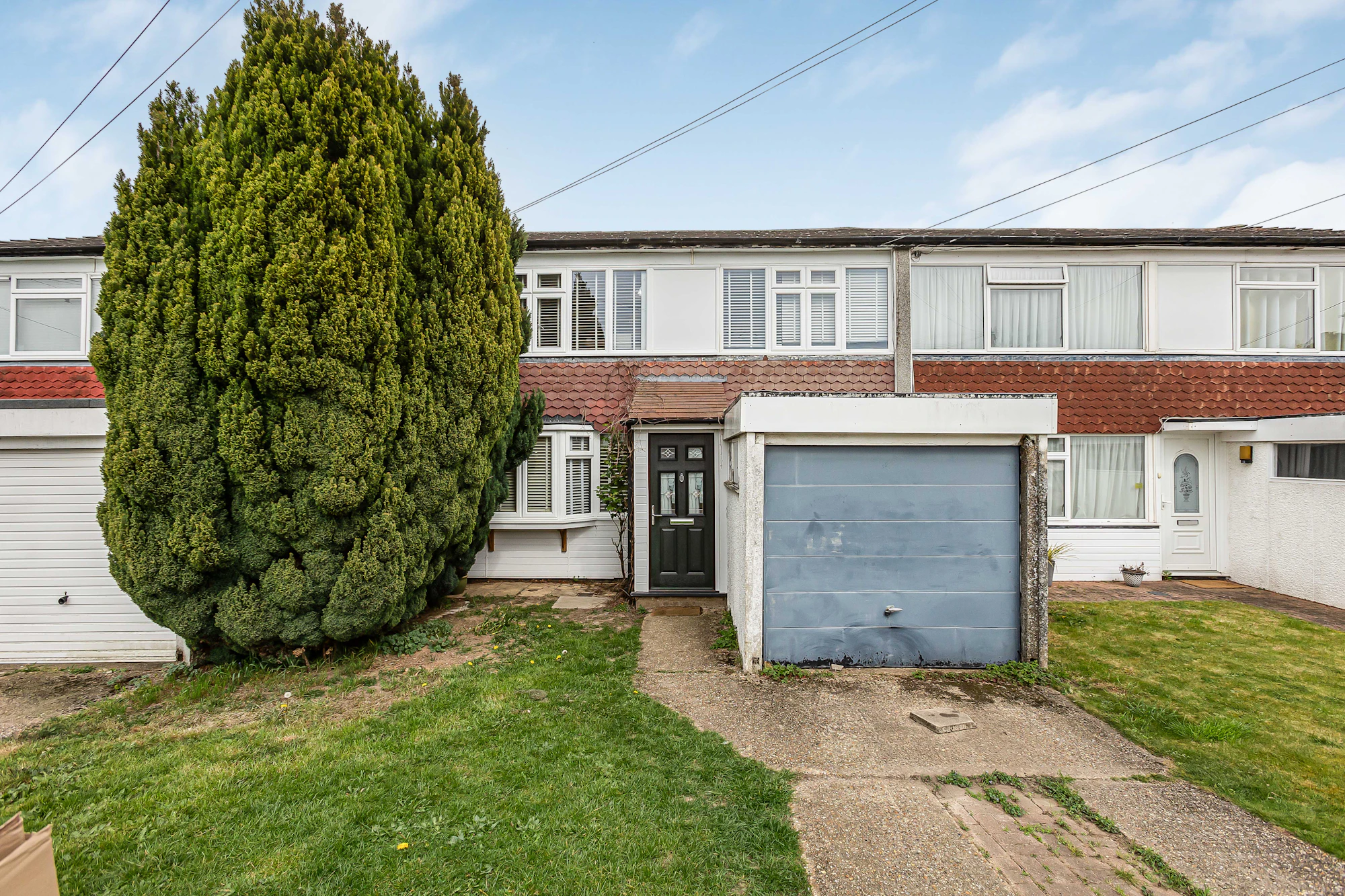 Three-bedroom terraced home with spacious living room, kitchen, garage and driveway, offering great potential to modernise in a popular setting.