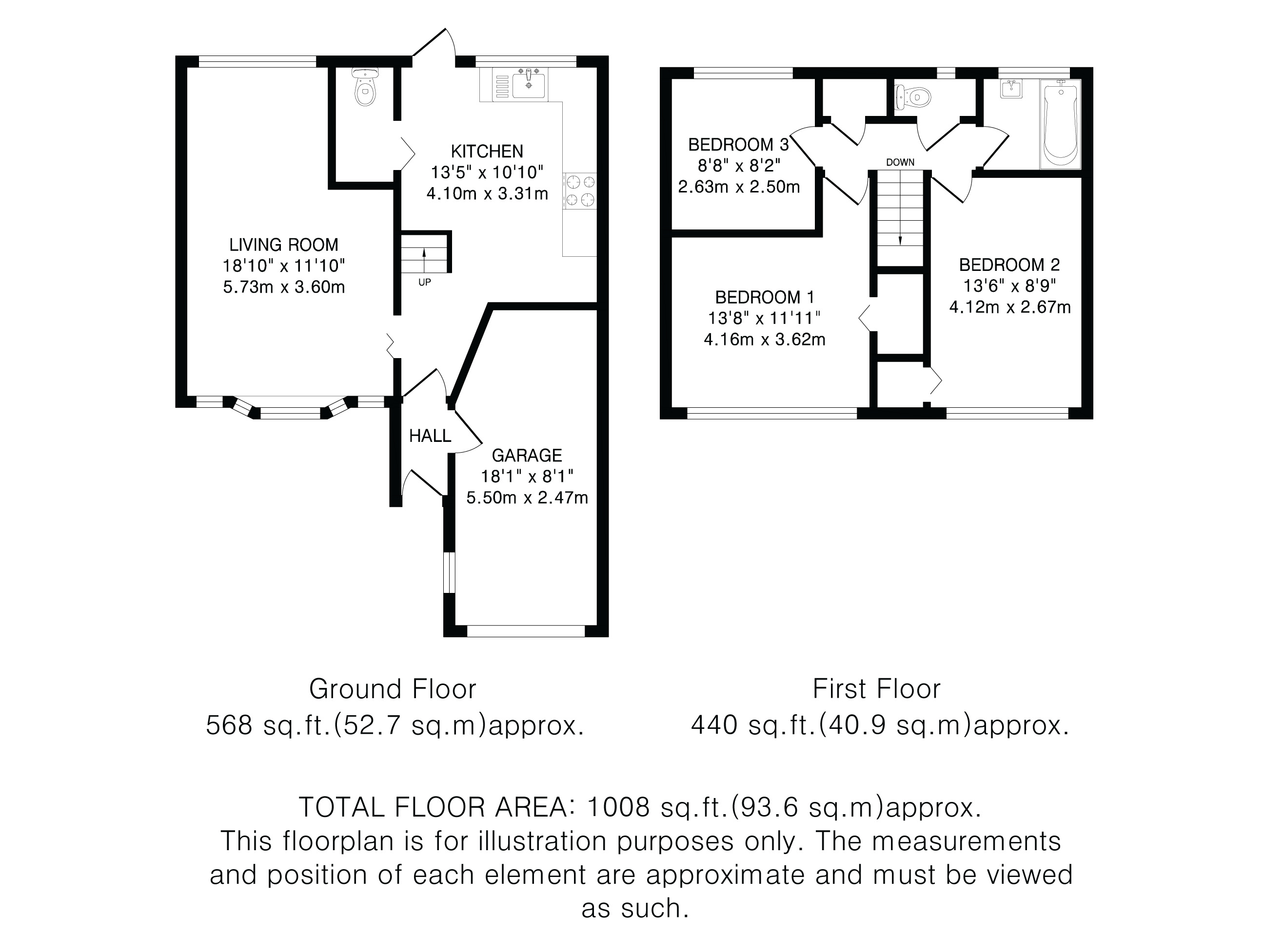 The ground floor comprises a welcoming entrance hall leading into a spacious living room, enhanced by a charming bay window to the front. To the rear, the kitchen offers ample worktop and storage space, with direct access to a convenient downstairs WC and internal access to the integral garage, providing additional flexibility for storage or day-to-day use. The layout of the ground floor lends itself well to reconfiguration, allowing a purchaser to create a more open-plan arrangement if desired.